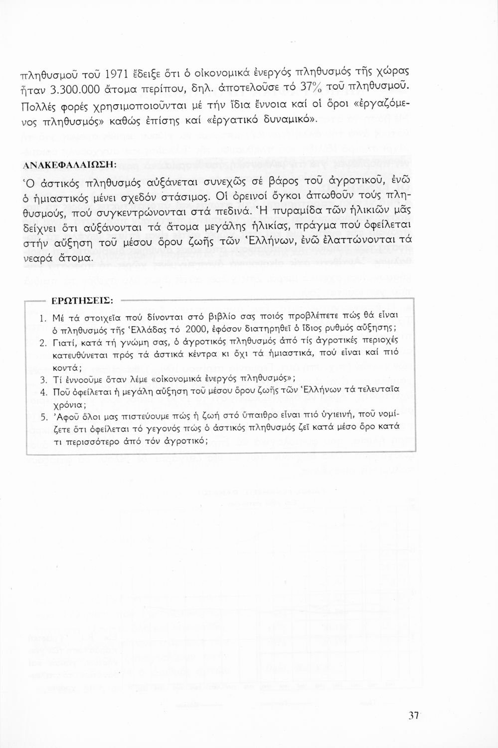 Σχολικό εγχειρίδιο Γεωγραφίας για την Γ΄ Γυμνασίου. Περιέχει στοιχεία για τη γεωλογία, το κλίμα, τον πληθυσμό της Ελλάδας. Αναφέρεται στο δημογραφικό πρόβλημα, την γεωργία, την κτηνοτροφία και την βιομηχανία της Ελλάδας.