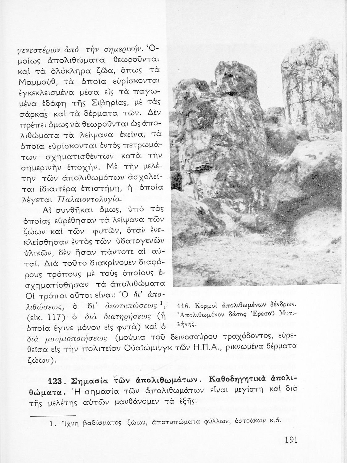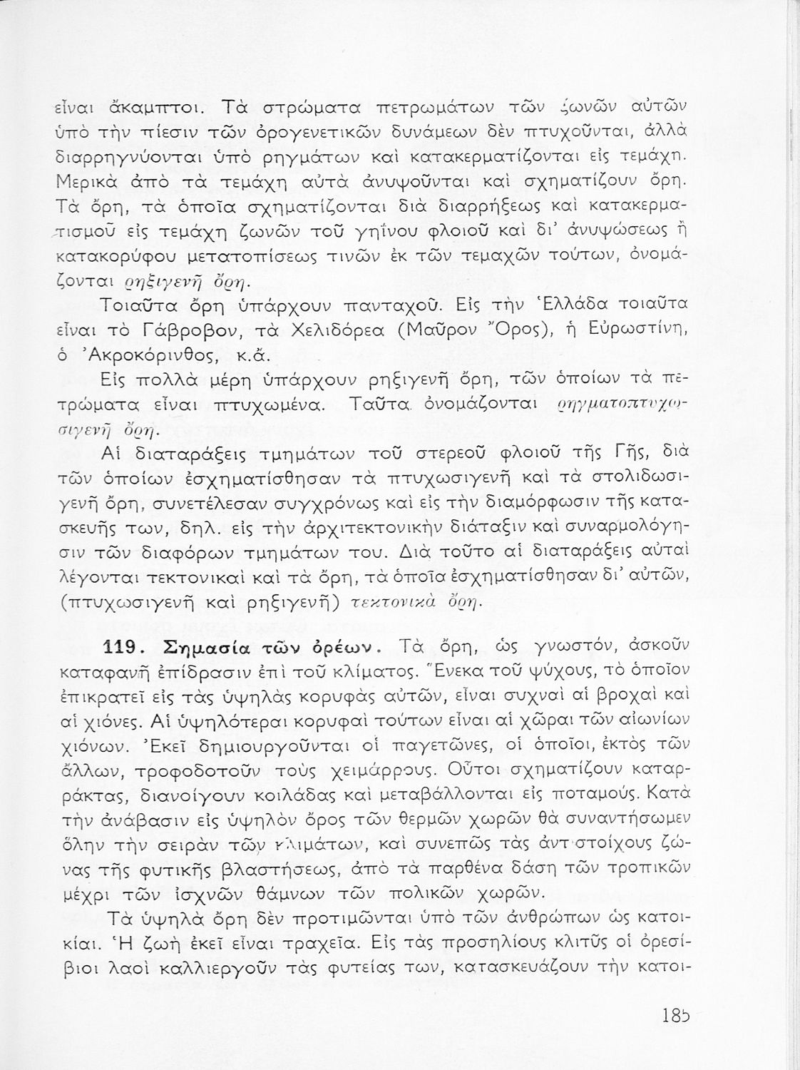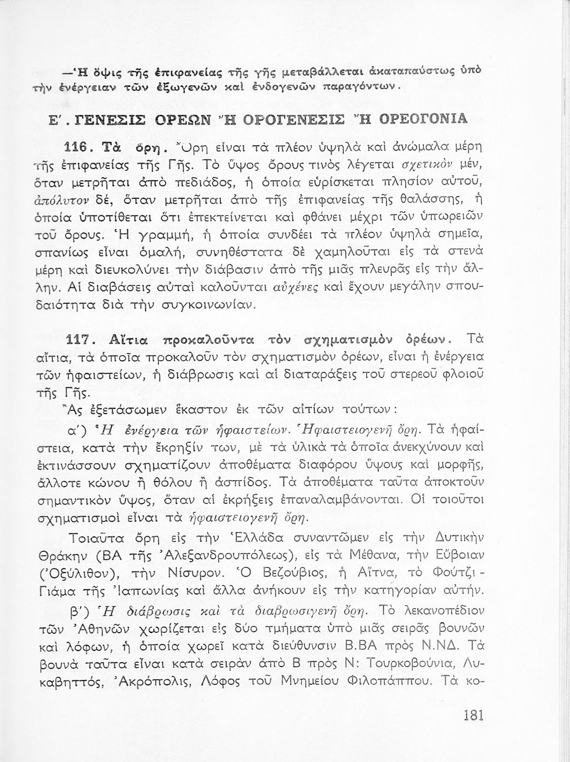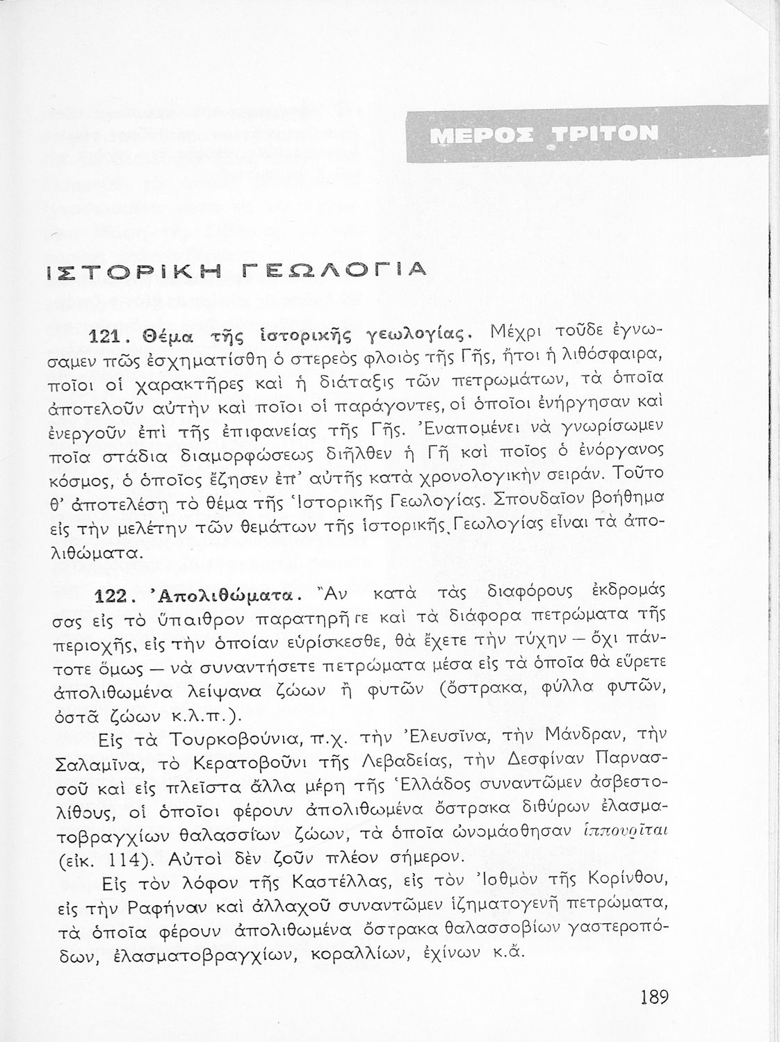 Βαθμίδα εκπαίδευσης: Δευτεροβάθμια Μάθημα: Γεωλογία, Ορυκτολογία Γλώσσα: Απλή καθαρεύουσα Παρουσίαση περιεχομένου: Σχολικό εγχειρίδιο Γεωλογίας/Ορυκτολογίας που περιλαμβάνει χθονογραφική, δυναμική και ιστορική γεωλογία, και γενική και ειδική ορυκτολογία. Ο συγγραφέας ήταν καθηγητής πανεπιστήμιου και η συγγραφέας φυσικός. Φέρει το σύμβολο της δικτατορίας. |
