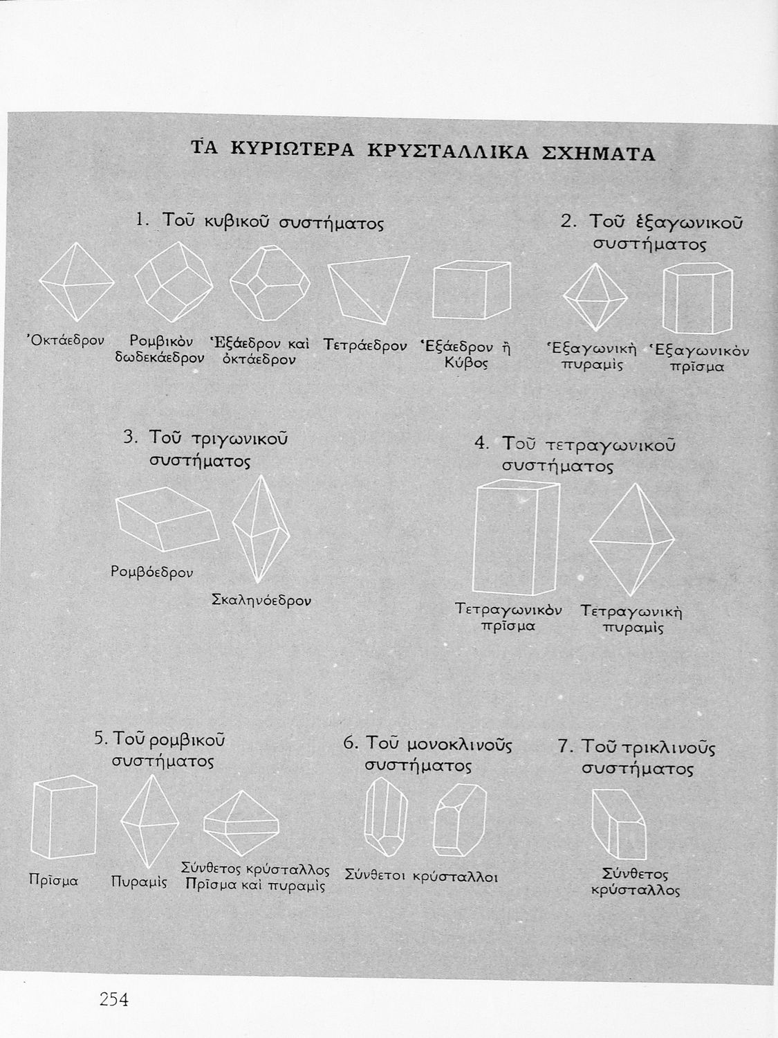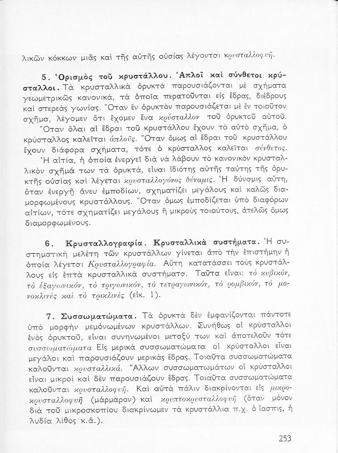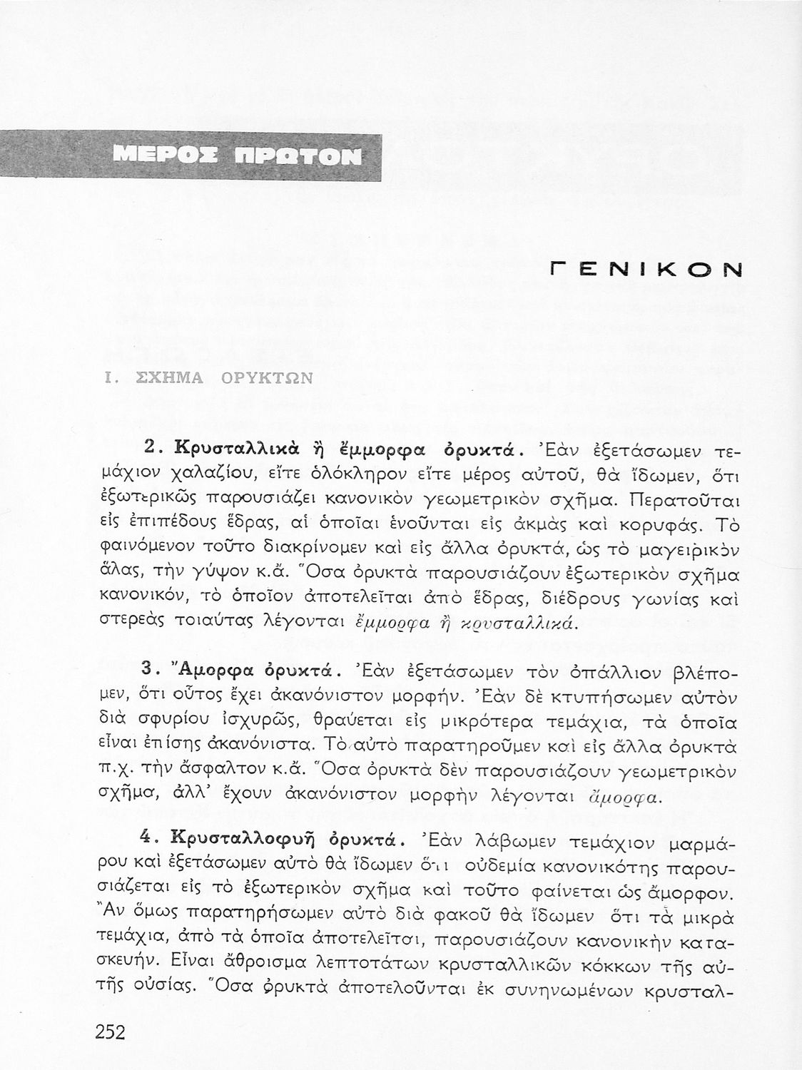 Σχολικό εγχειρίδιο Γεωλογίας/Ορυκτολογίας που περιλαμβάνει χθονογραφική, δυναμική και ιστορική γεωλογία, και γενική και ειδική ορυκτολογία. Ο συγγραφέας ήταν καθηγητής πανεπιστήμιου και η συγγραφέας φυσικός. Φέρει το σύμβολο της δικτατορίας.