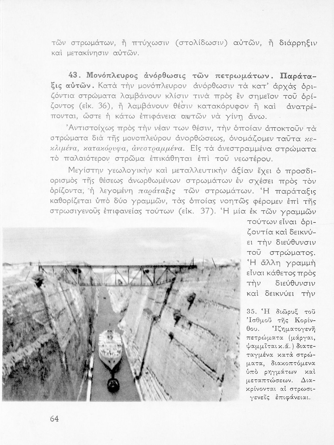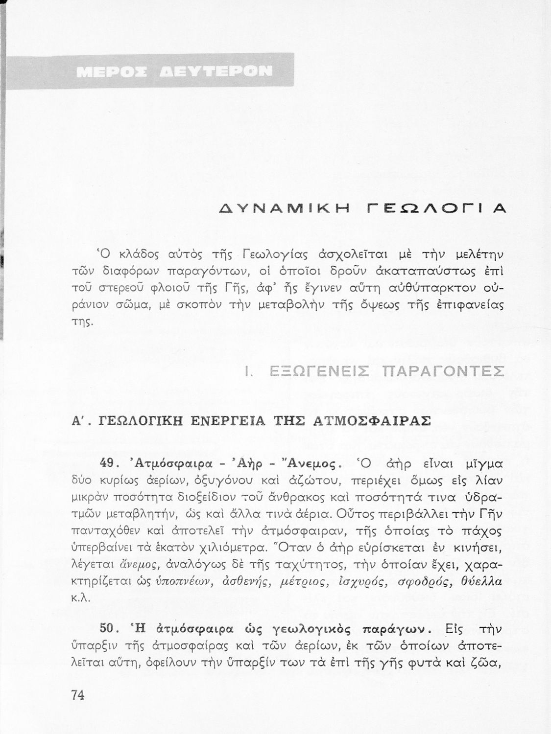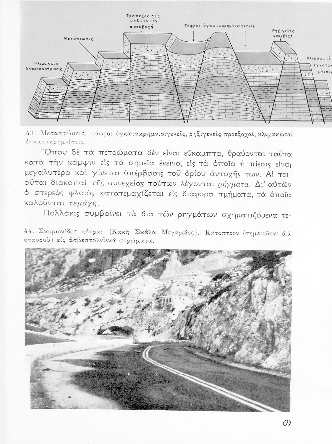 Σχολικό εγχειρίδιο Γεωλογίας/Ορυκτολογίας που περιλαμβάνει χθονογραφική, δυναμική και ιστορική γεωλογία, και γενική και ειδική ορυκτολογία. Ο συγγραφέας ήταν καθηγητής πανεπιστήμιου και η συγγραφέας φυσικός. Φέρει το σύμβολο της δικτατορίας.