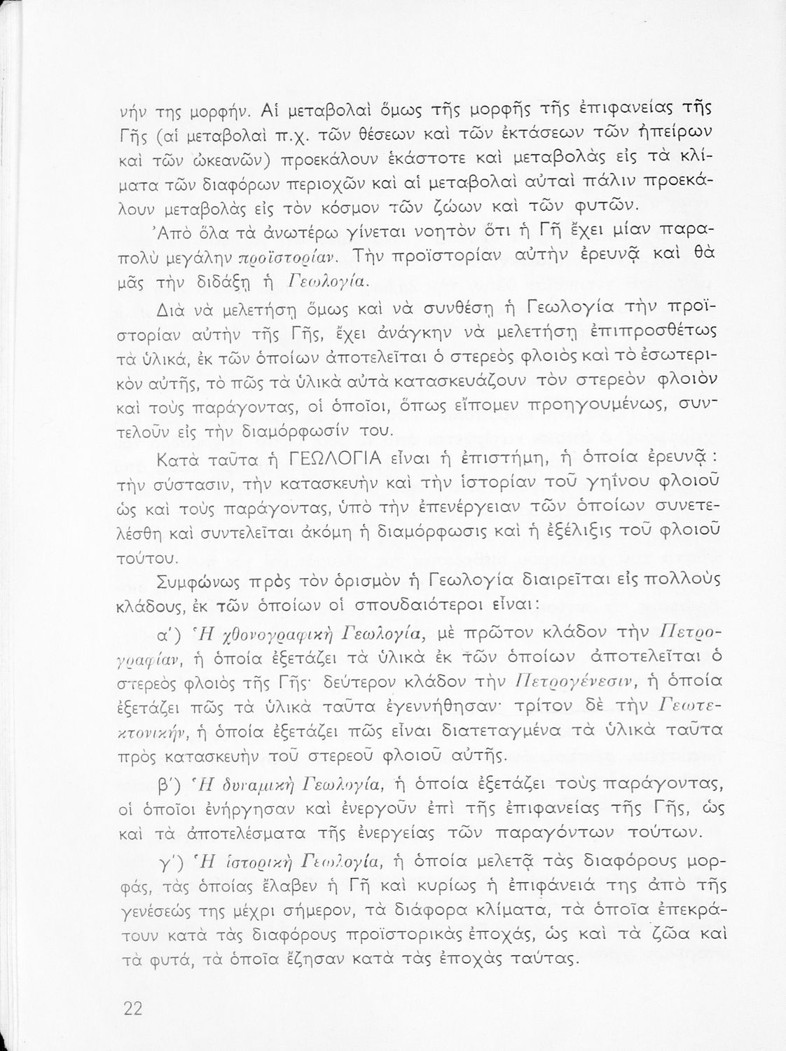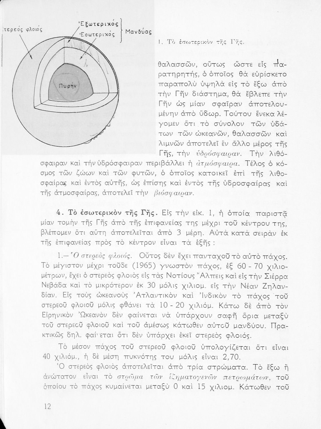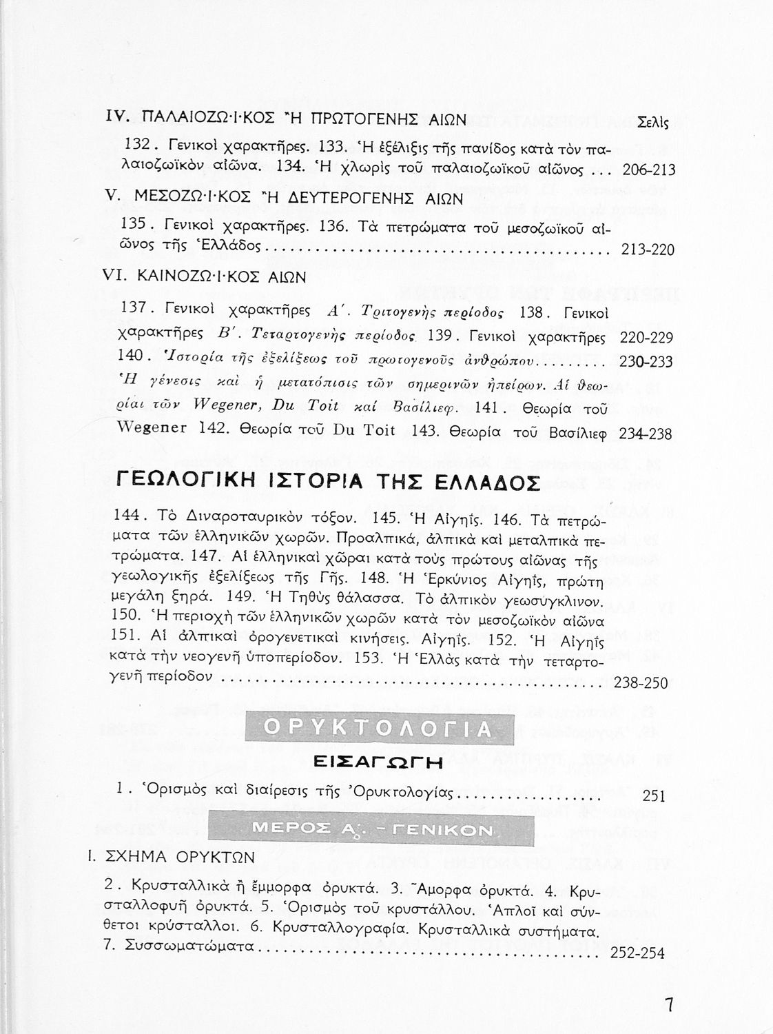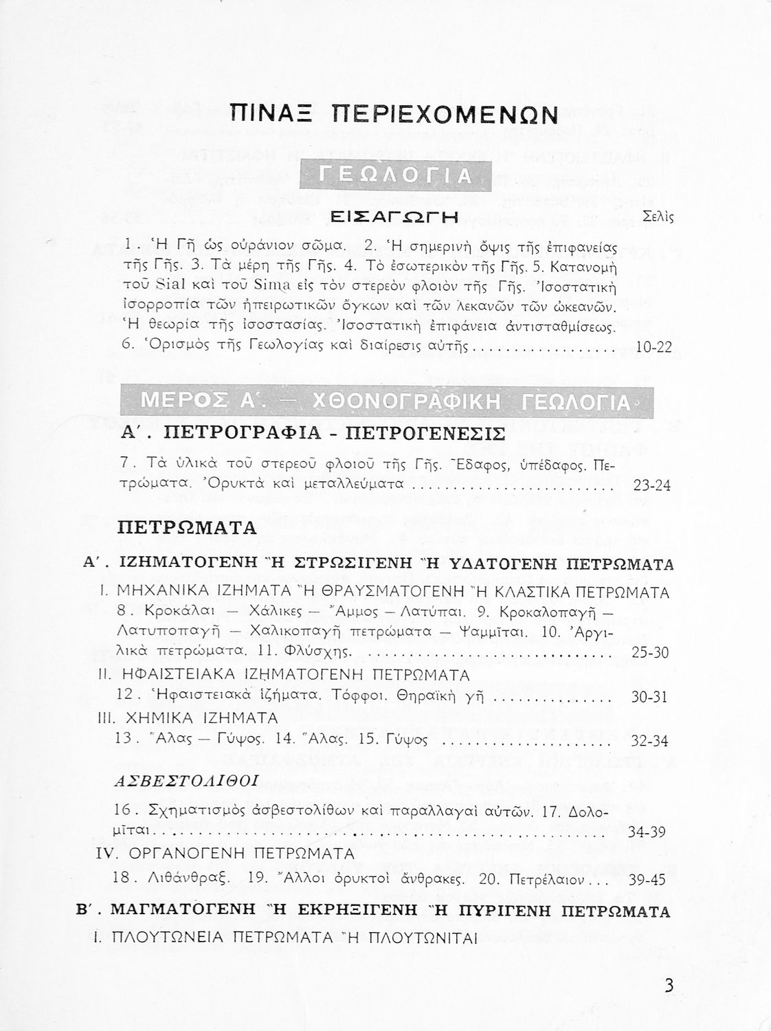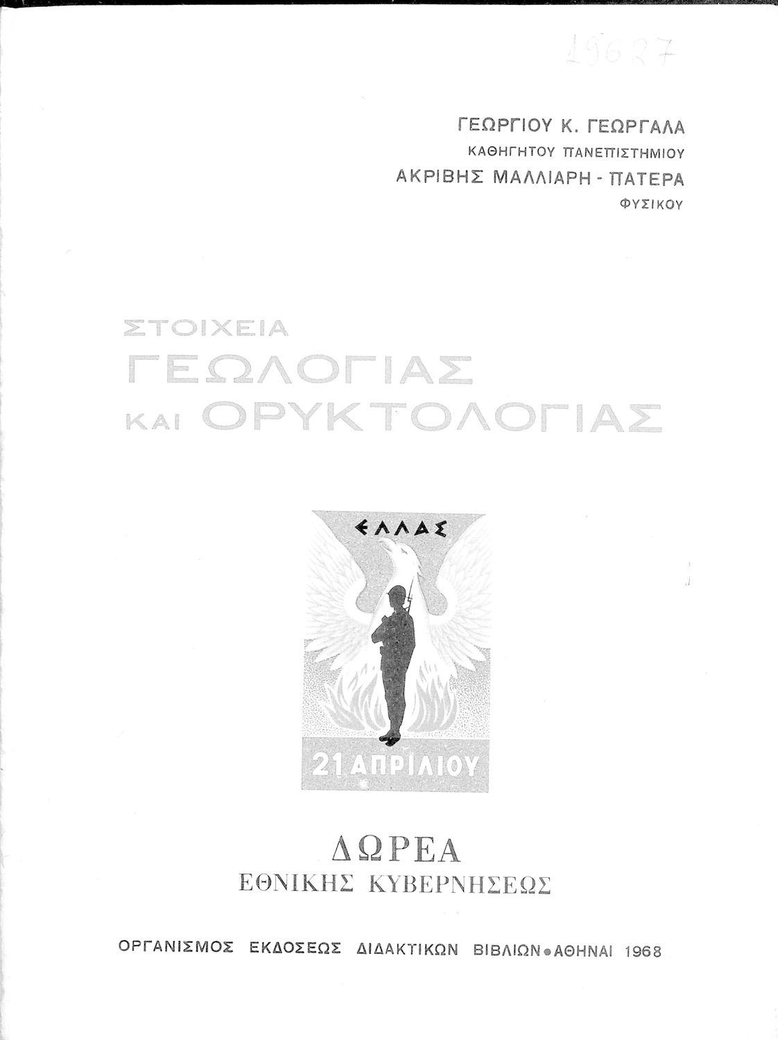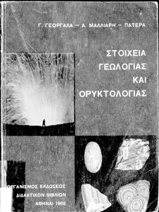 Σχολικό εγχειρίδιο Γεωλογίας/Ορυκτολογίας που περιλαμβάνει χθονογραφική, δυναμική και ιστορική γεωλογία, και γενική και ειδική ορυκτολογία. Ο συγγραφέας ήταν καθηγητής πανεπιστήμιου και η συγγραφέας φυσικός. Φέρει το σύμβολο της δικτατορίας.