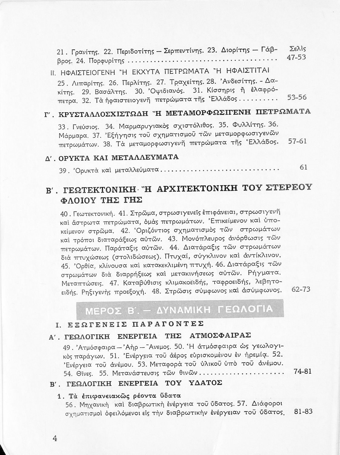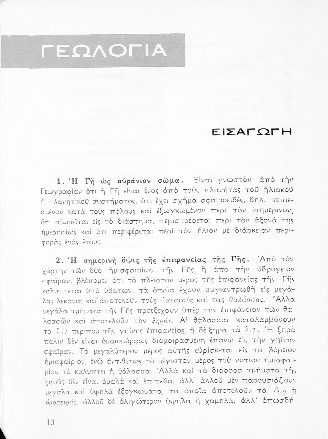 Βαθμίδα εκπαίδευσης: Δευτεροβάθμια Μάθημα: Γεωλογία, Ορυκτολογία Γλώσσα: Απλή καθαρεύουσα Παρουσίαση περιεχομένου: Σχολικό εγχειρίδιο Γεωλογίας/Ορυκτολογίας που περιλαμβάνει χθονογραφική, δυναμική και ιστορική γεωλογία, και γενική και ειδική ορυκτολογία. Ο συγγραφέας ήταν καθηγητής πανεπιστήμιου και η συγγραφέας φυσικός. Φέρει το σύμβολο της δικτατορίας. |