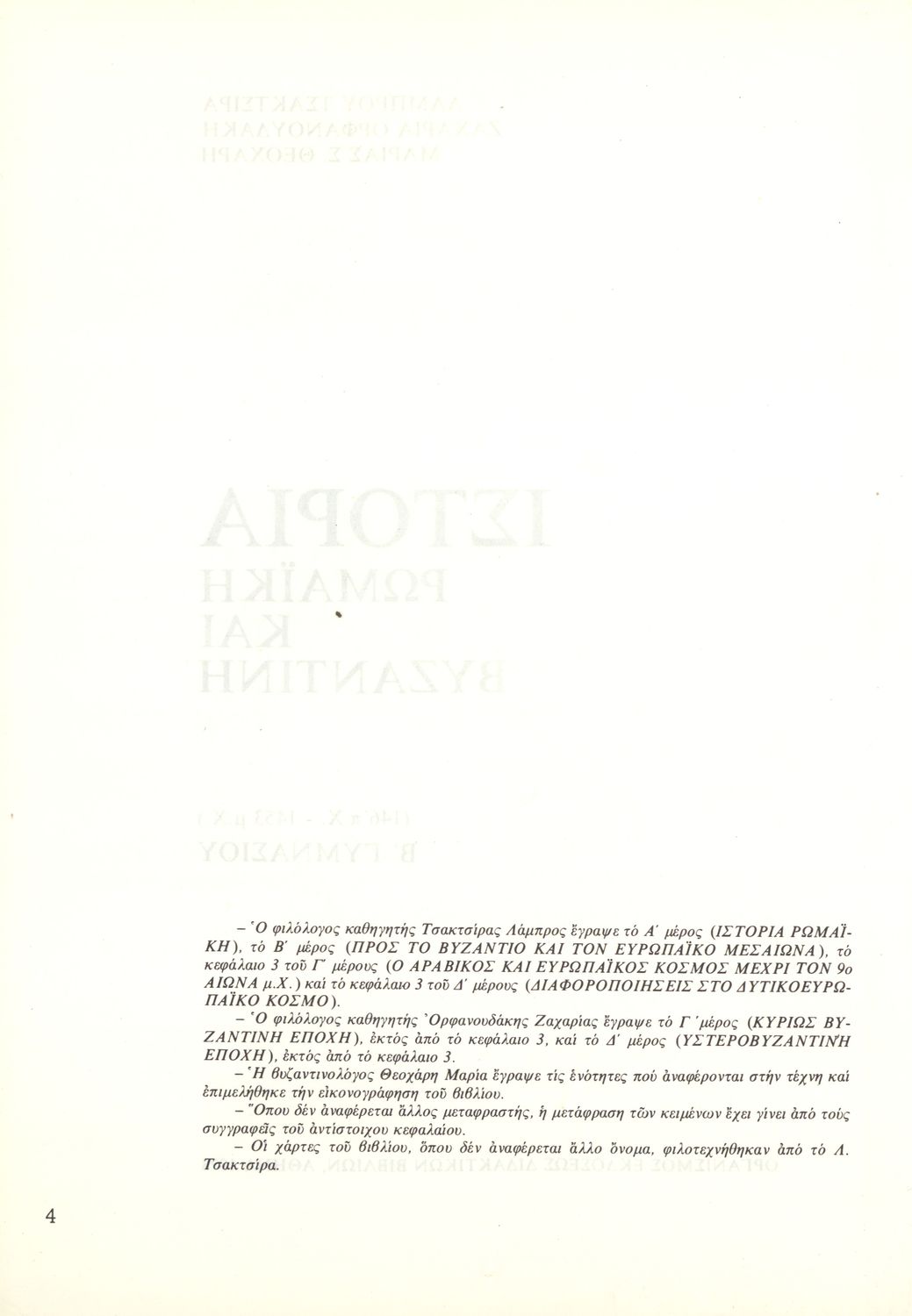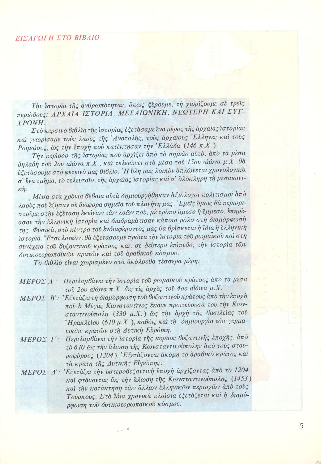 Σχολικό εγχειρίδιο Ιστορίας Β΄ και Ε΄ Γυμνασίου που καλύπτει την περίοδο από την άνοδο του Μ. Κωνσταντίνου στο θρόνο μέχρι και την άλωση της Κωνσταντινούπολης. Παρουσιάζει και τα πνευματικά και καλλιτεχνικά ...