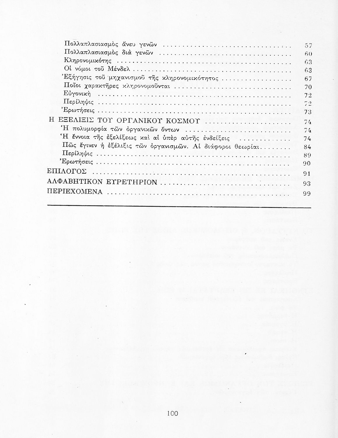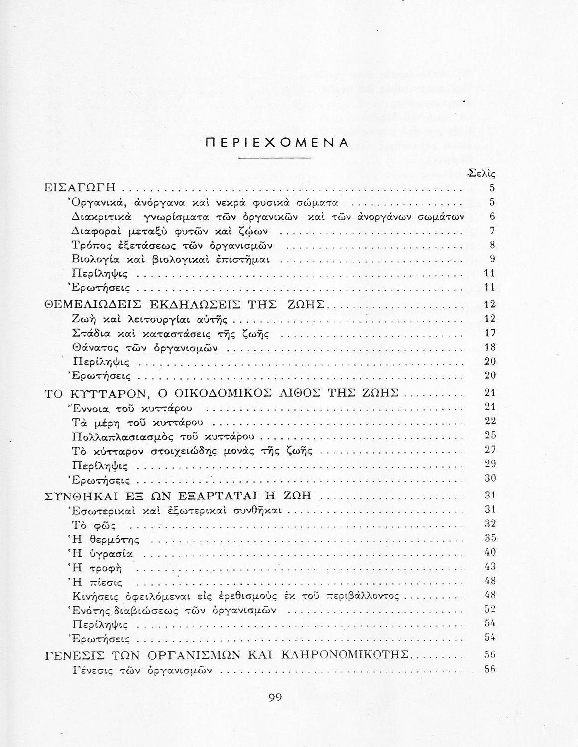 Σχολικό εγχειρίδιο Βιολογίας Δ΄ Γυμνασίου που εστιάζει στις συνθήκες γέννησης, μεταβολής και θανάτου των έμβιων οργανισμών. Ο συγγραφέας ήταν καθηγητής της γενικής Βιολογίας στο Πανεπιστήμιο Αθηνών.
