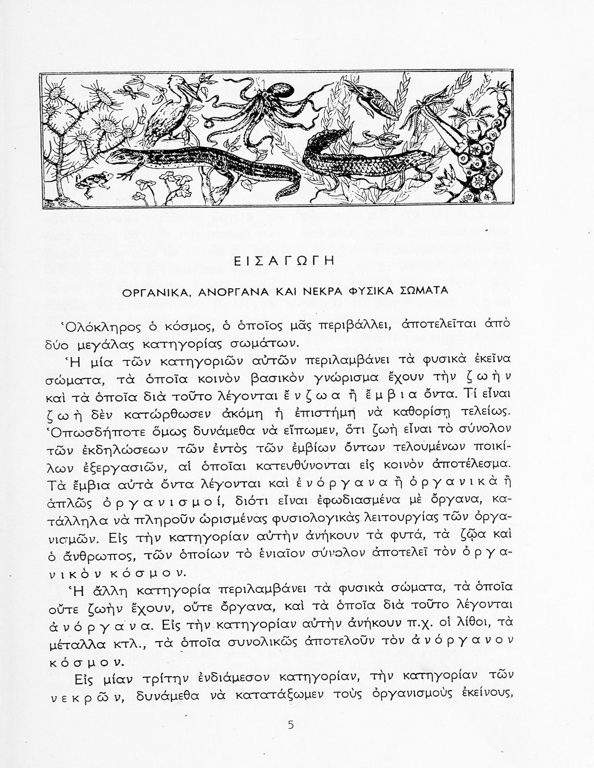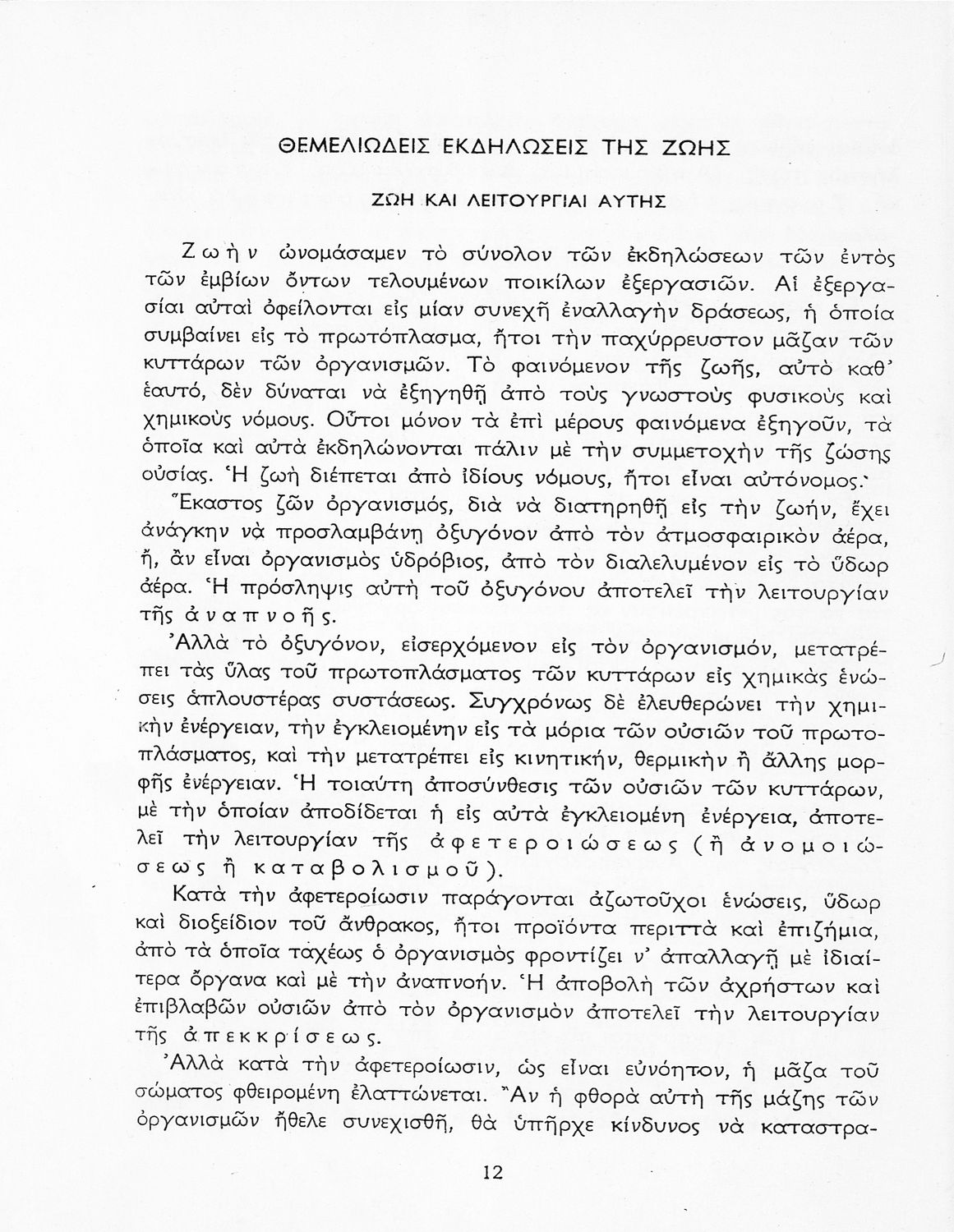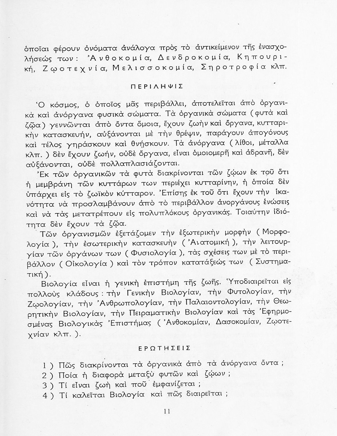 Σχολικό εγχειρίδιο Βιολογίας που εστιάζει στις συνθήκες γέννησης, μεταβολής και θανάτου των έμβιων οργανισμών. Φέρει το σύμβολο της δικτατορίας.