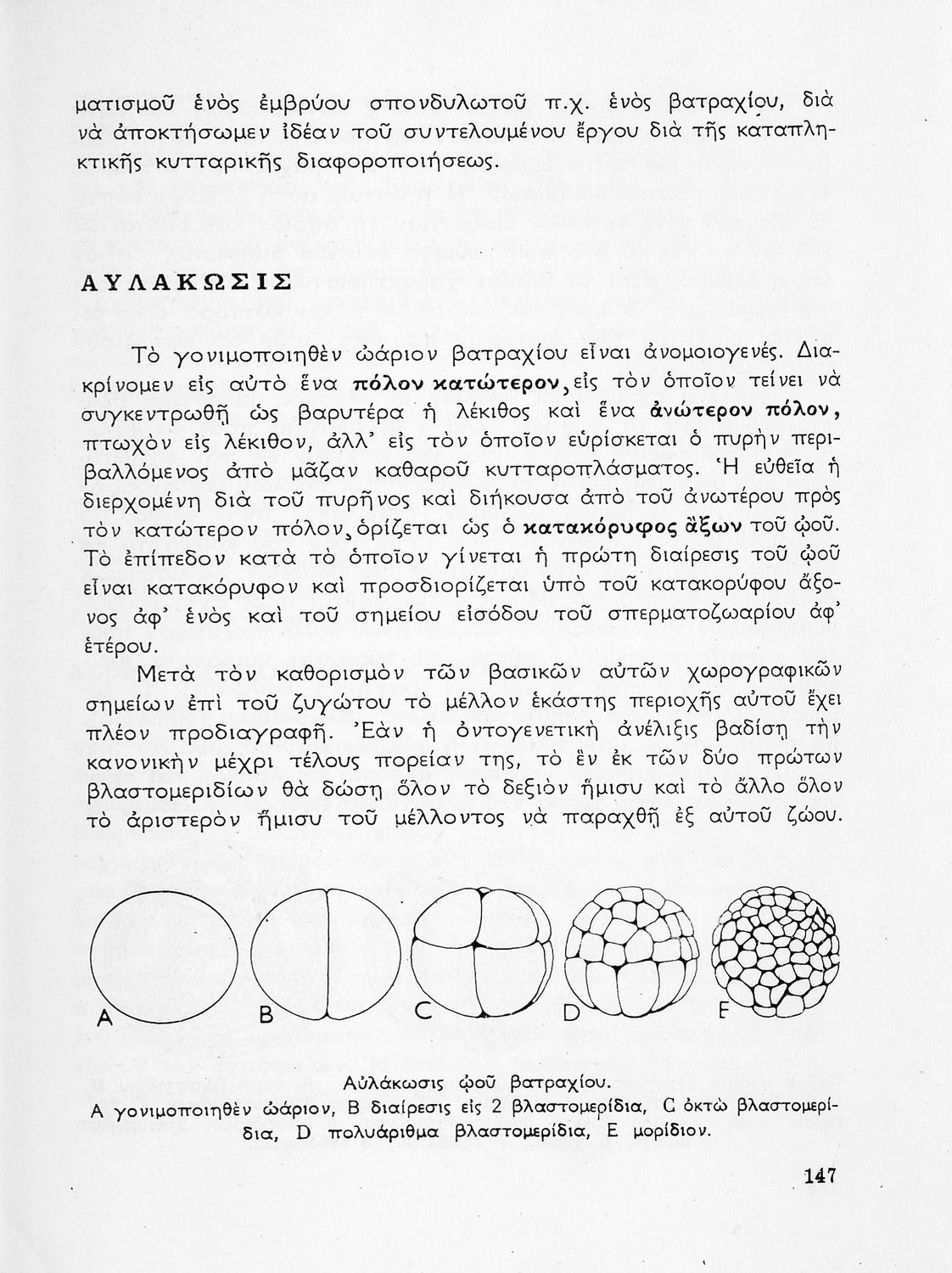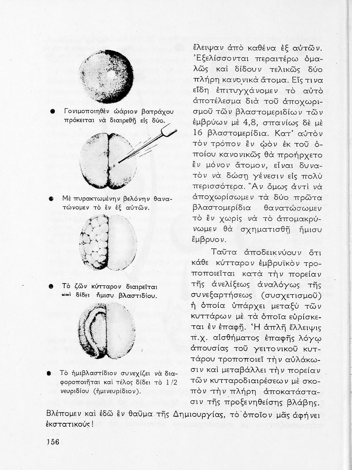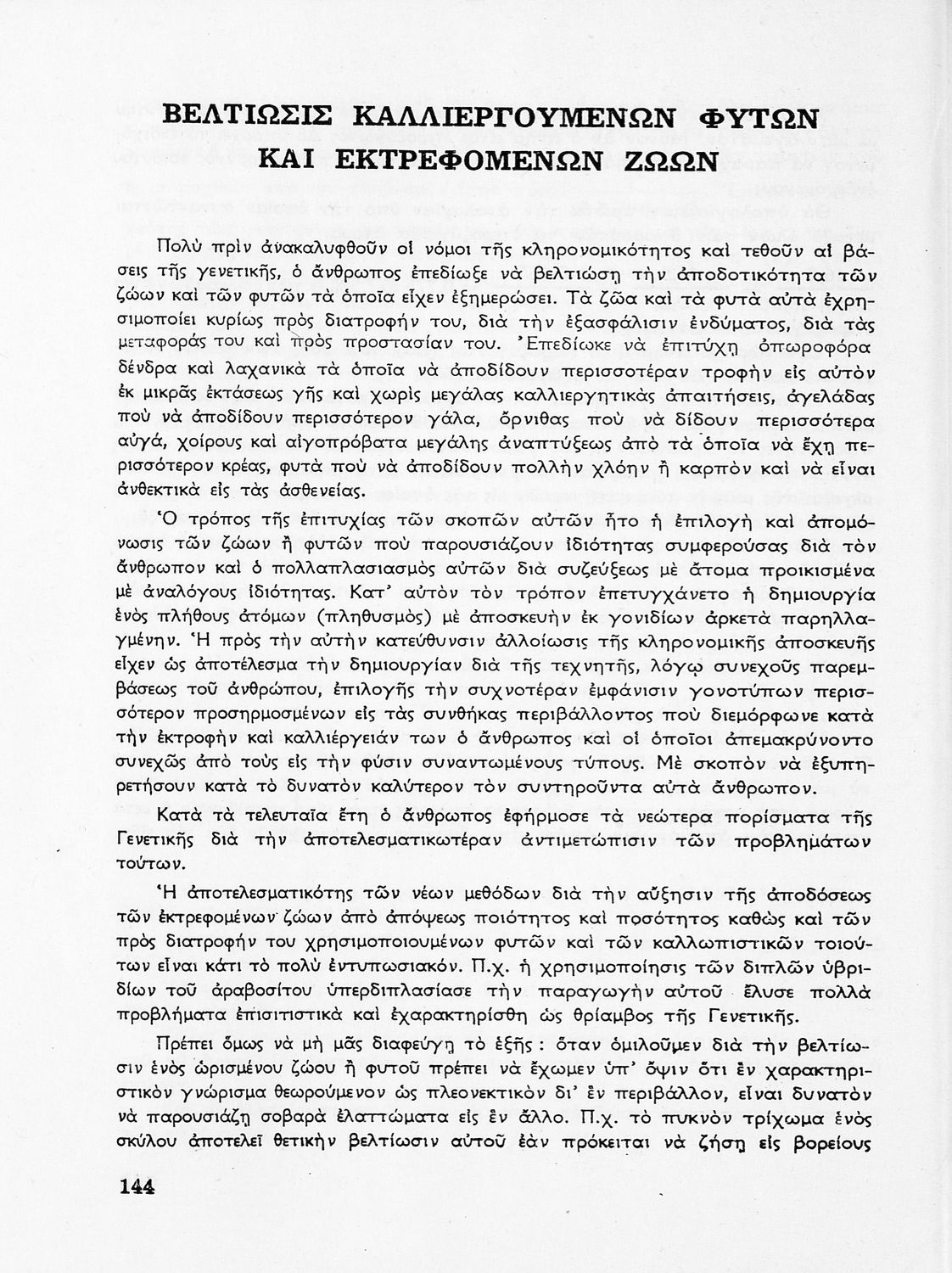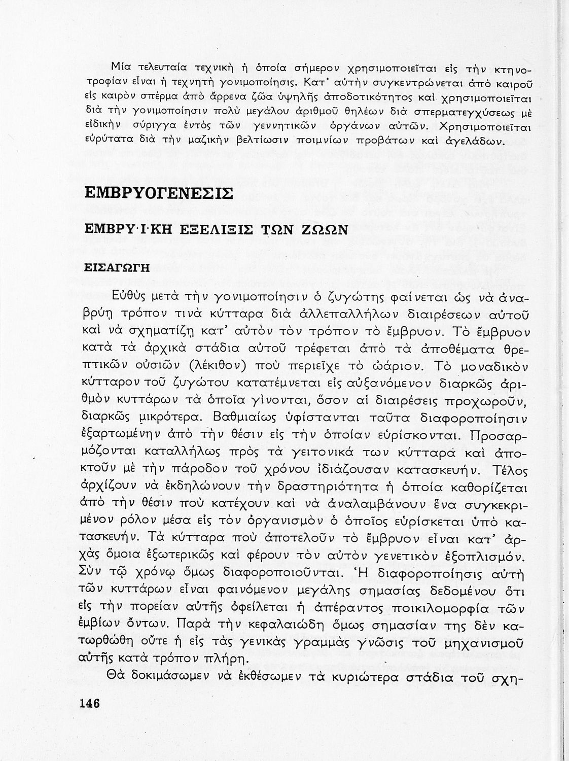 Σχολικό εγχειρίδιο Βιολογίας ΣΤ΄ Γυμνασίου που εστιάζει στις συνθήκες γέννησης, μεταβολής και θανάτου των έμβιων οργανισμών. Φέρει το σύμβολο της δικτατορίας. Ο συγγραφέας ήταν υφηγητής του Πανεπιστημίου Αθηνών.