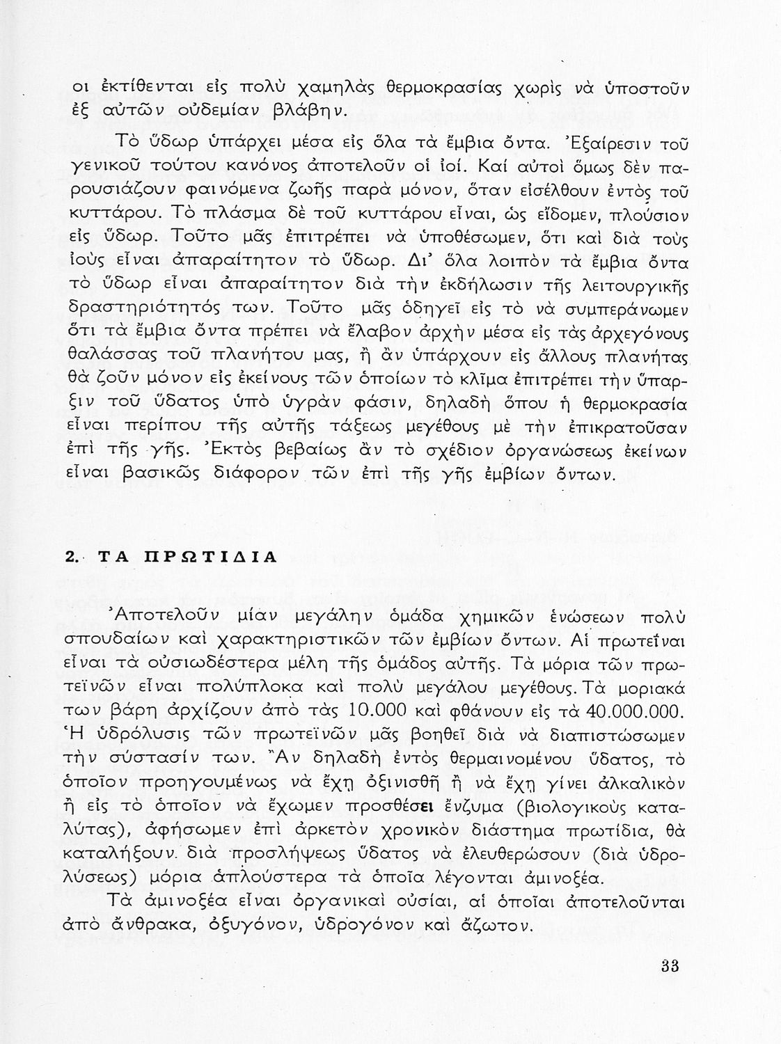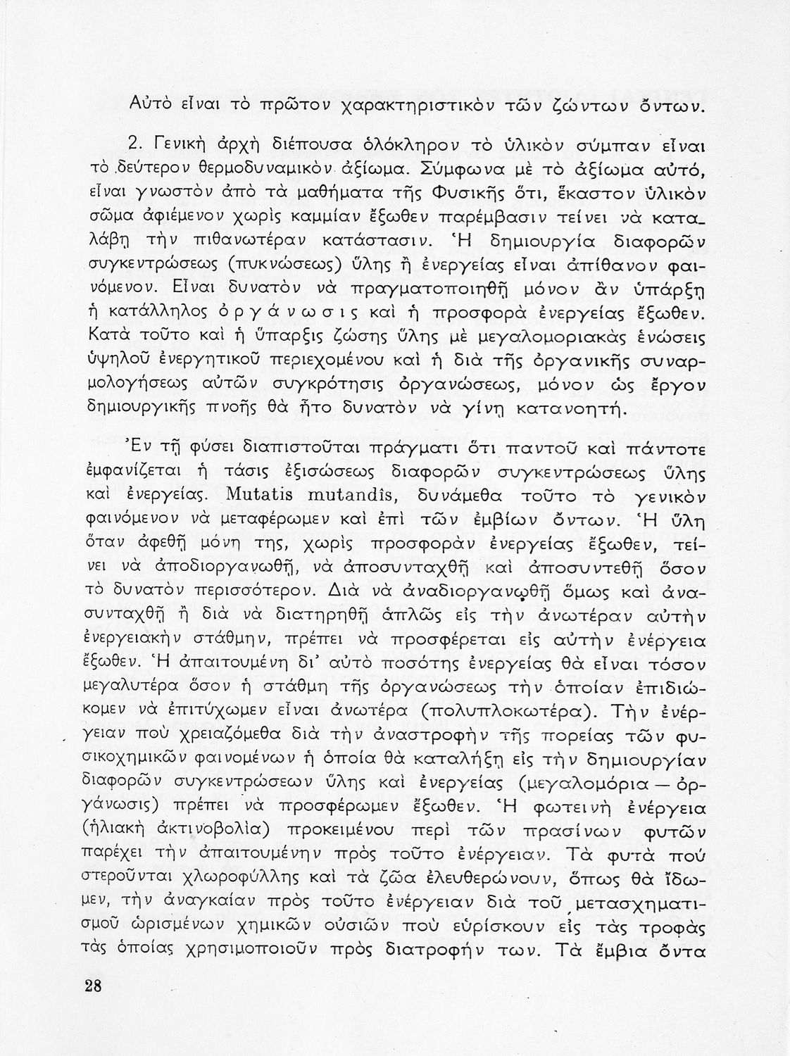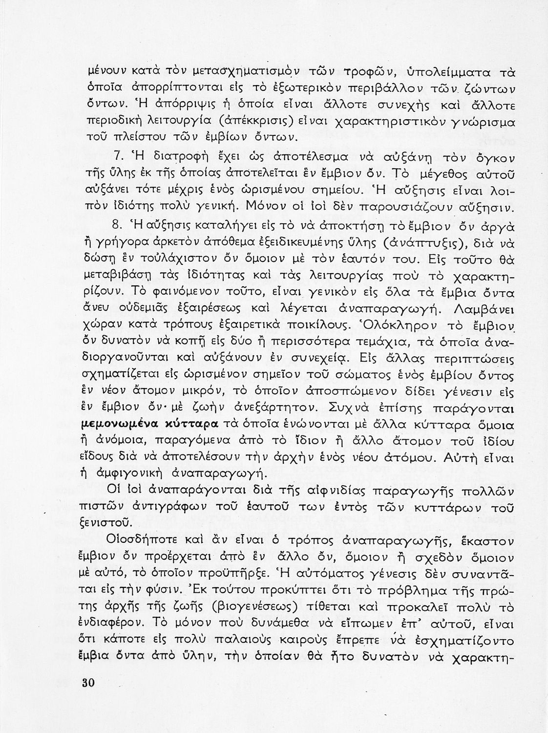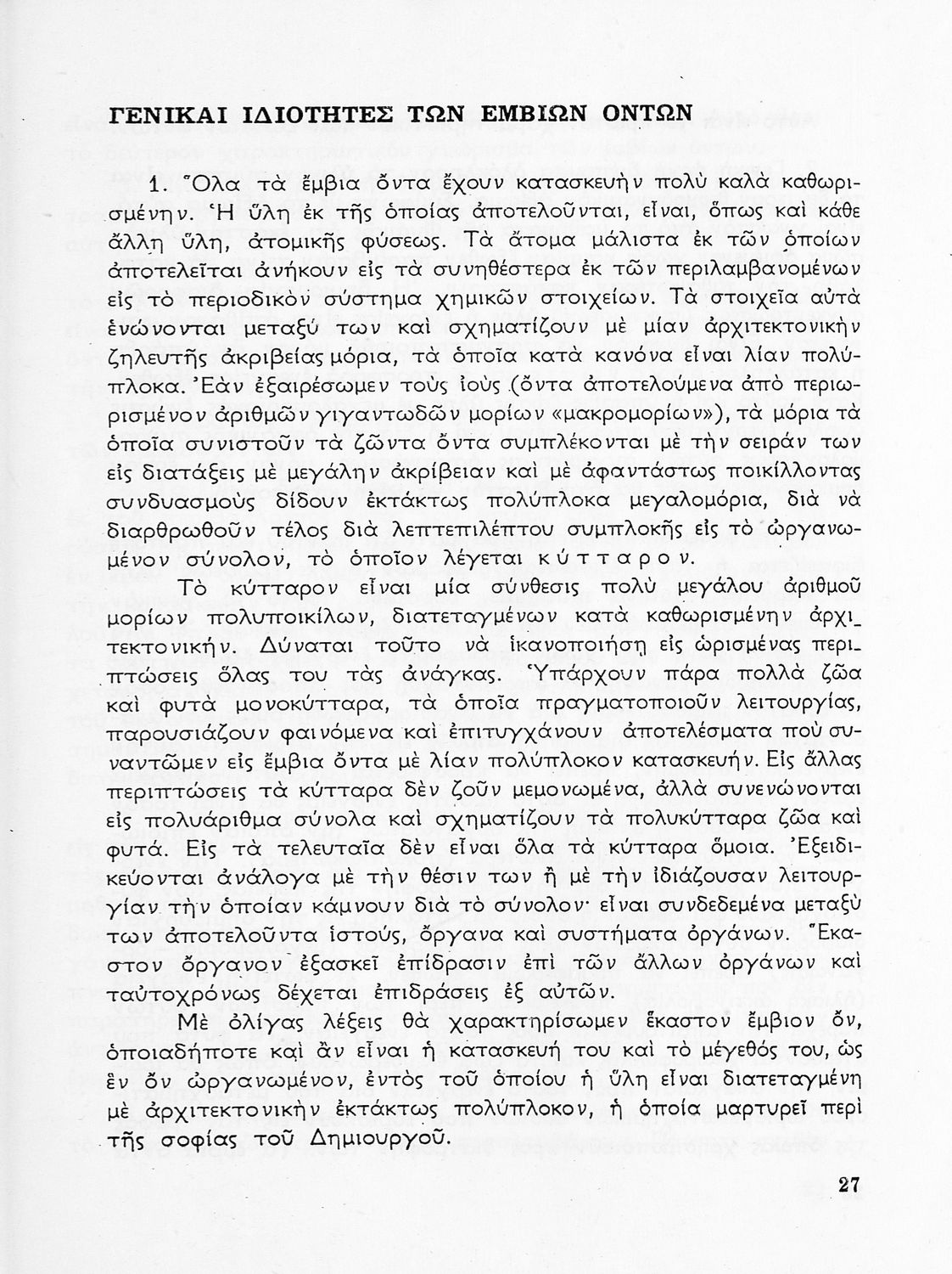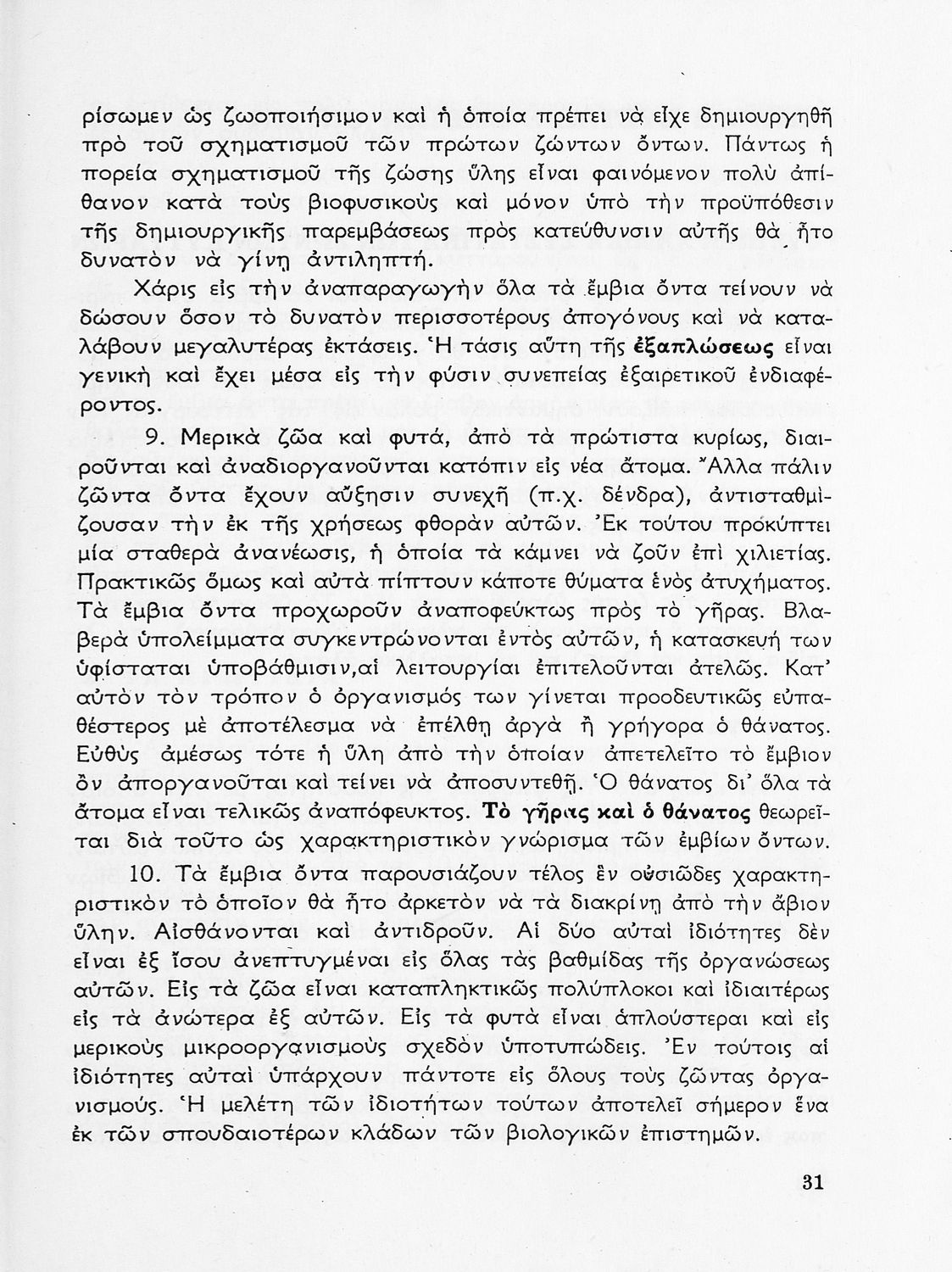 Σχολικό εγχειρίδιο Βιολογίας ΣΤ΄ Γυμνασίου που εστιάζει στις συνθήκες γέννησης, μεταβολής και θανάτου των έμβιων οργανισμών. Φέρει το σύμβολο της δικτατορίας. Ο συγγραφέας ήταν υφηγητής του Πανεπιστημίου Αθηνών.