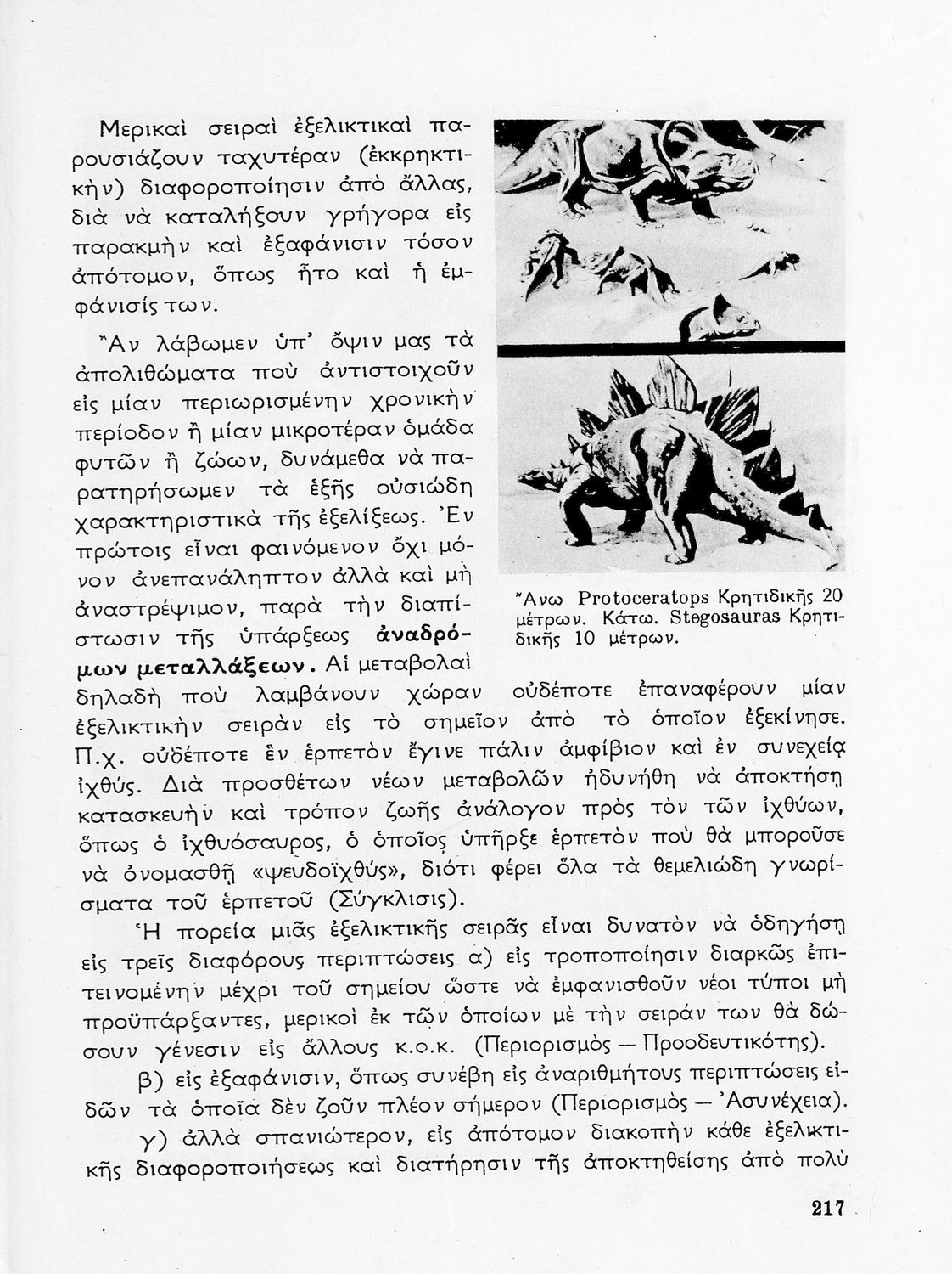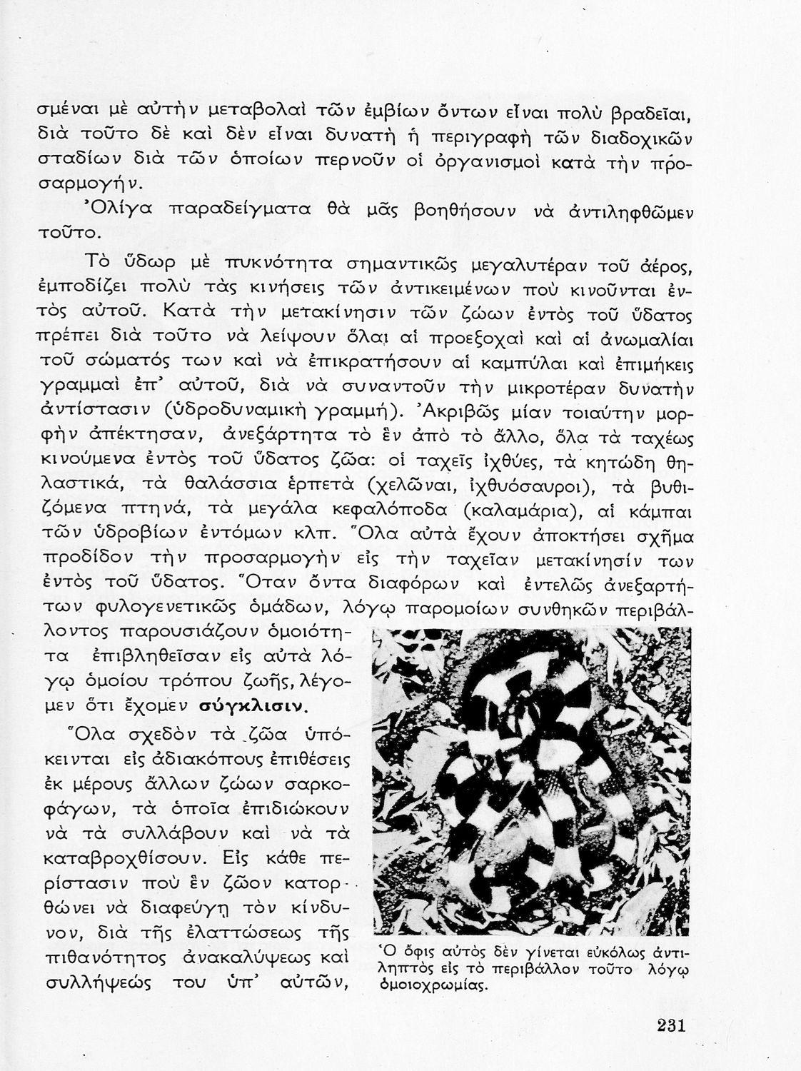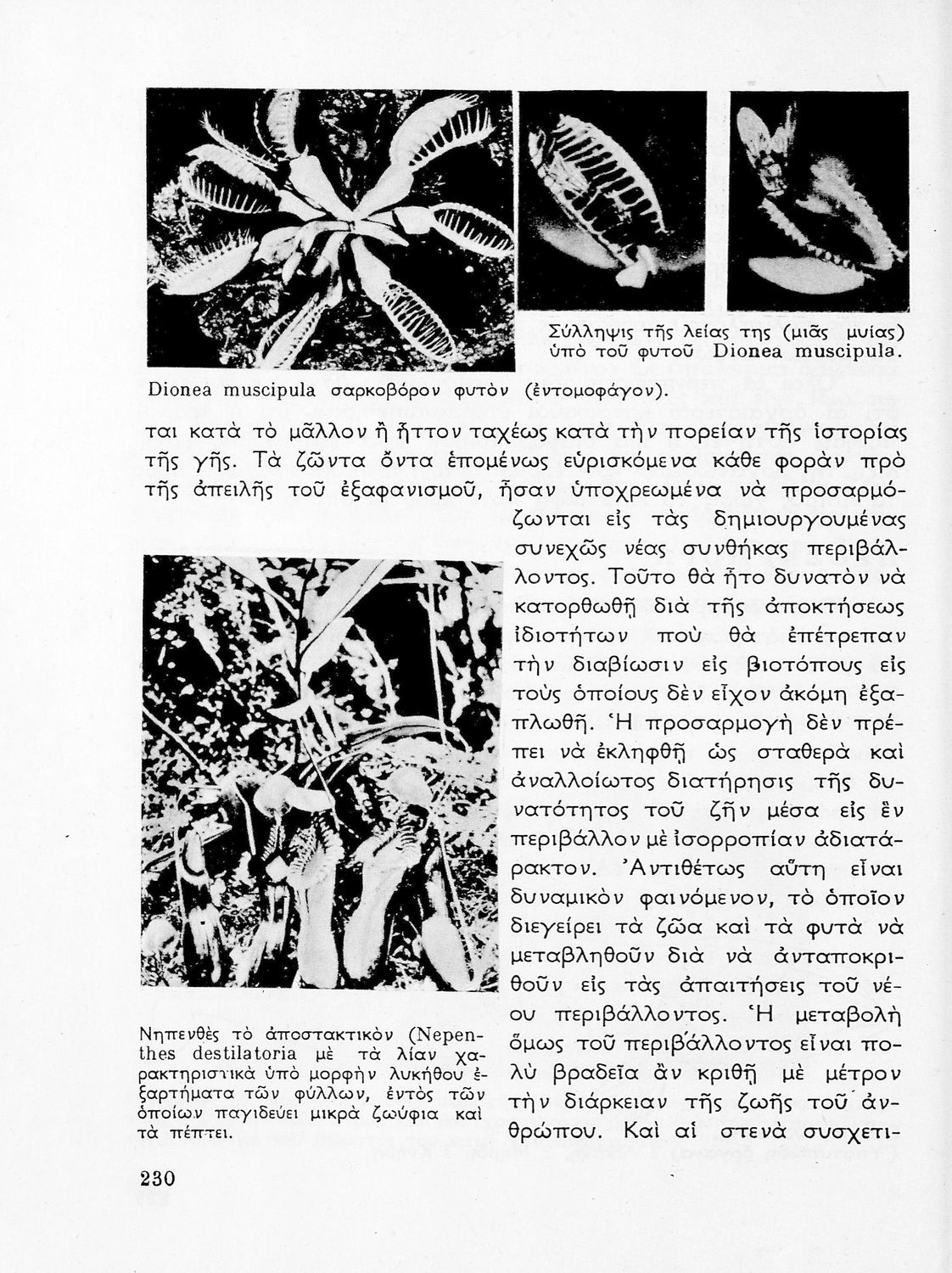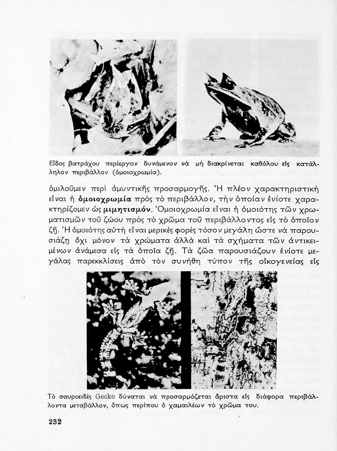 Σχολικό εγχειρίδιο Βιολογίας ΣΤ΄ Γυμνασίου που εστιάζει στις συνθήκες γέννησης, μεταβολής και θανάτου των έμβιων οργανισμών. Φέρει το σύμβολο της δικτατορίας. Ο συγγραφέας ήταν υφηγητής του Πανεπιστημίου Αθηνών.