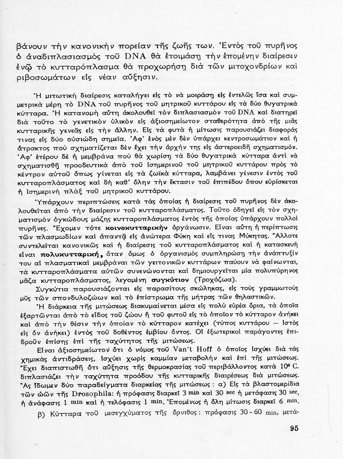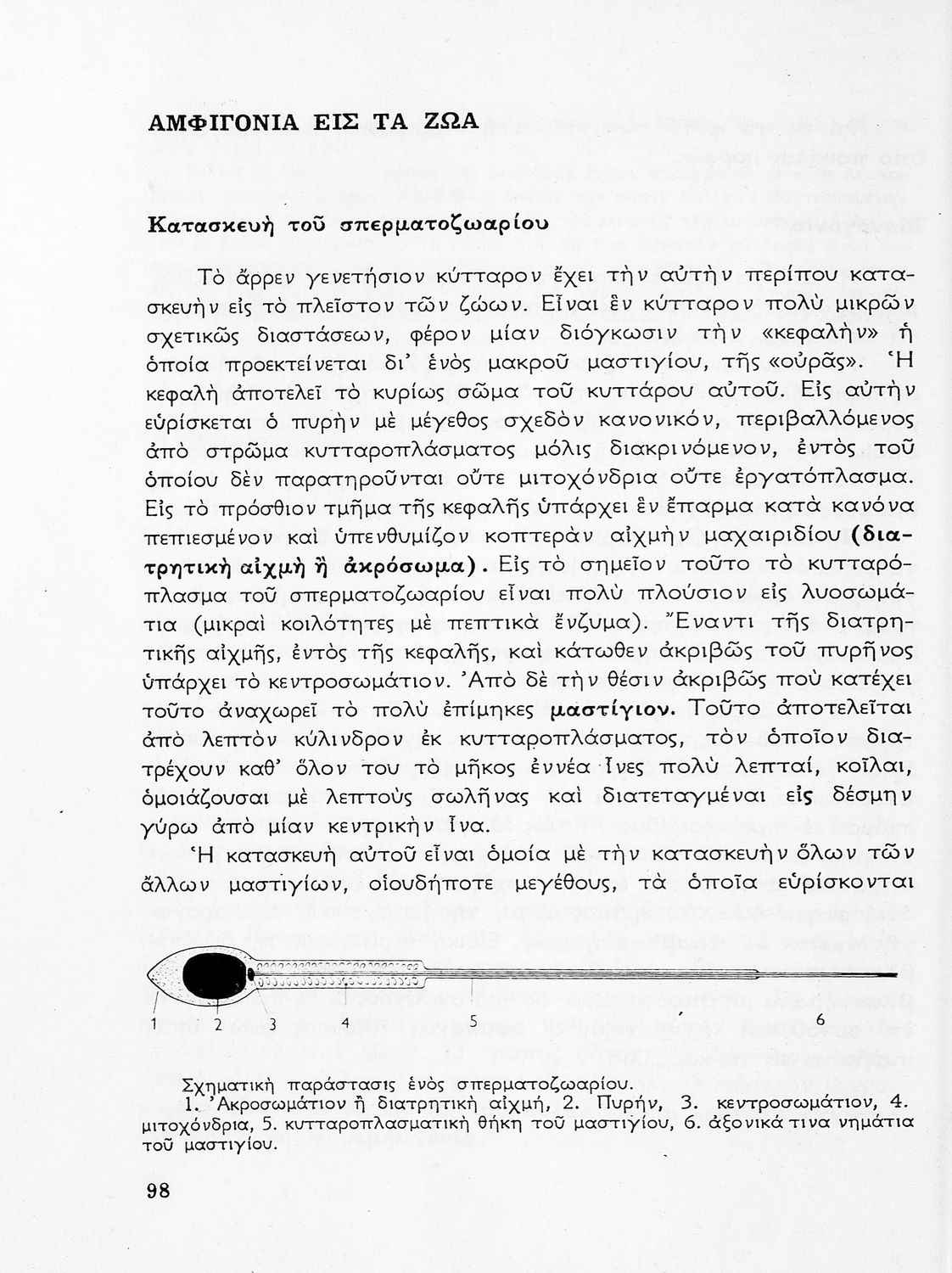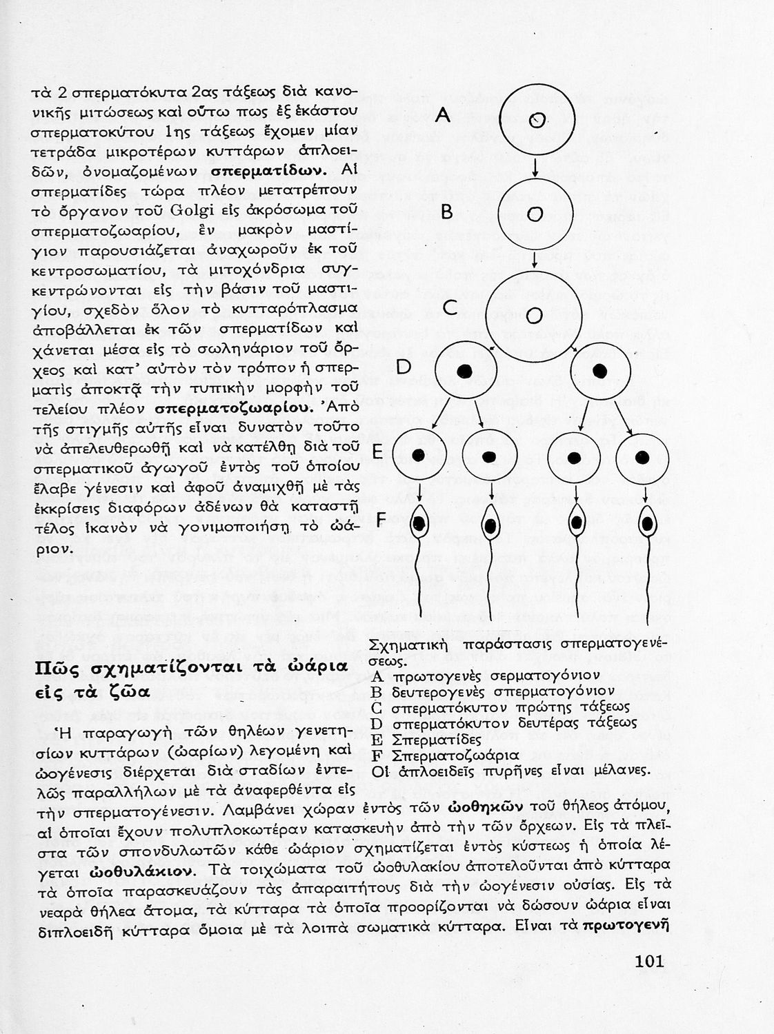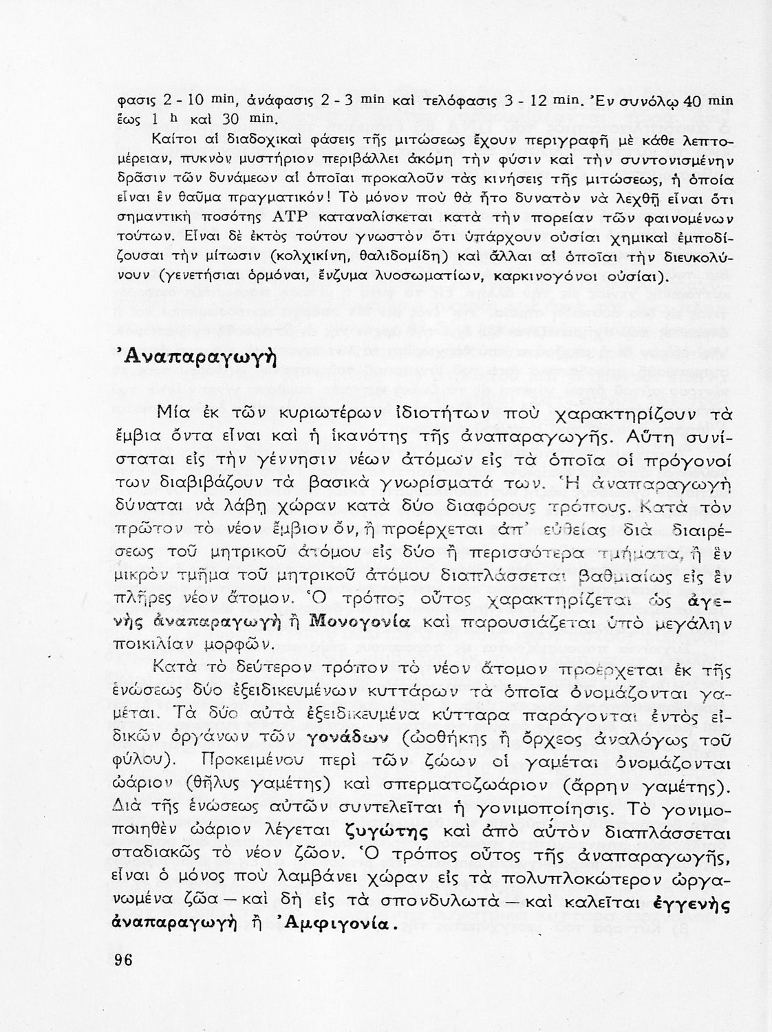 Σχολικό εγχειρίδιο Βιολογίας ΣΤ΄ Γυμνασίου που εστιάζει στις συνθήκες γέννησης, μεταβολής και θανάτου των έμβιων οργανισμών. Φέρει το σύμβολο της δικτατορίας. Ο συγγραφέας ήταν υφηγητής του Πανεπιστημίου Αθηνών.