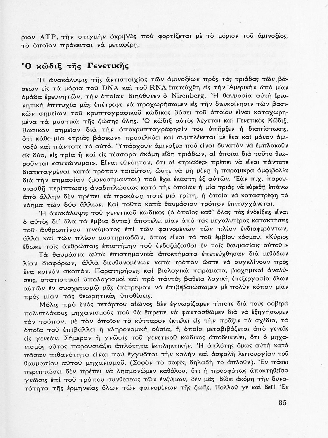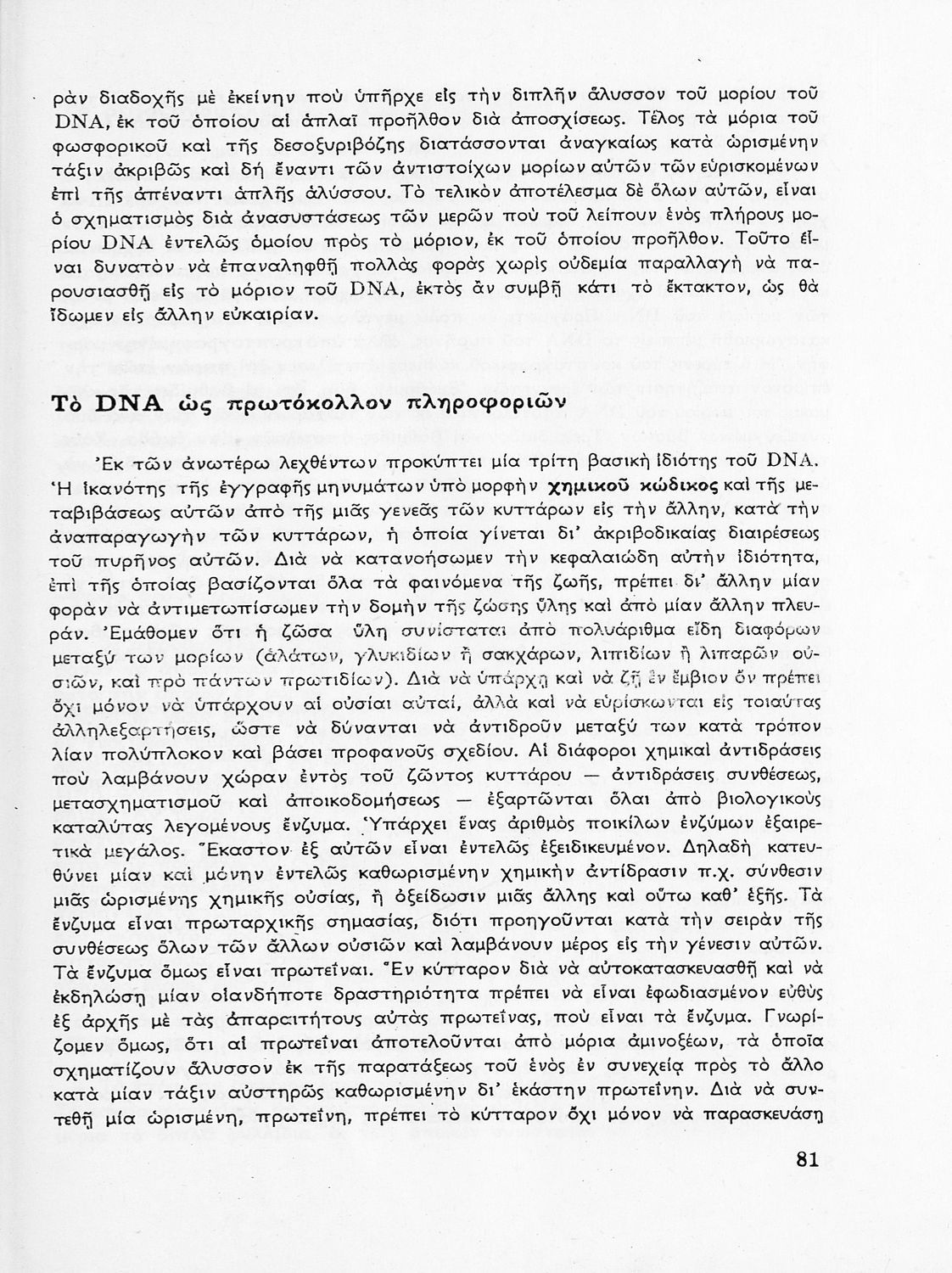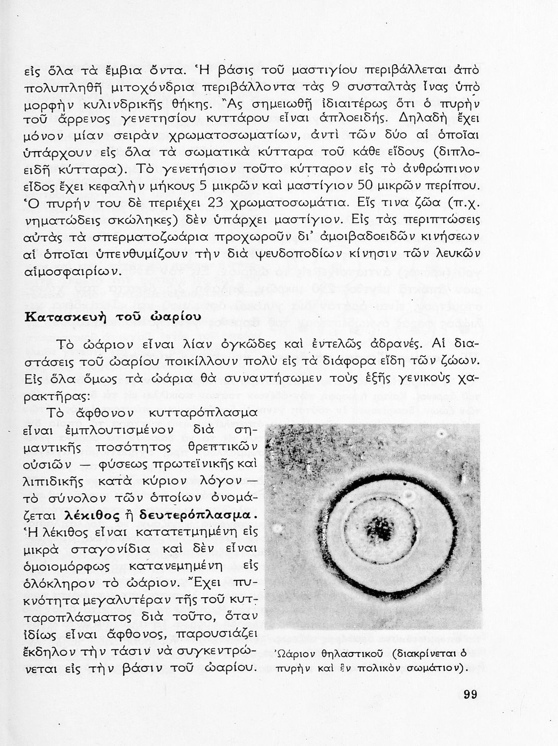 Σχολικό εγχειρίδιο Βιολογίας ΣΤ΄ Γυμνασίου που εστιάζει στις συνθήκες γέννησης, μεταβολής και θανάτου των έμβιων οργανισμών. Φέρει το σύμβολο της δικτατορίας. Ο συγγραφέας ήταν υφηγητής του Πανεπιστημίου Αθηνών.