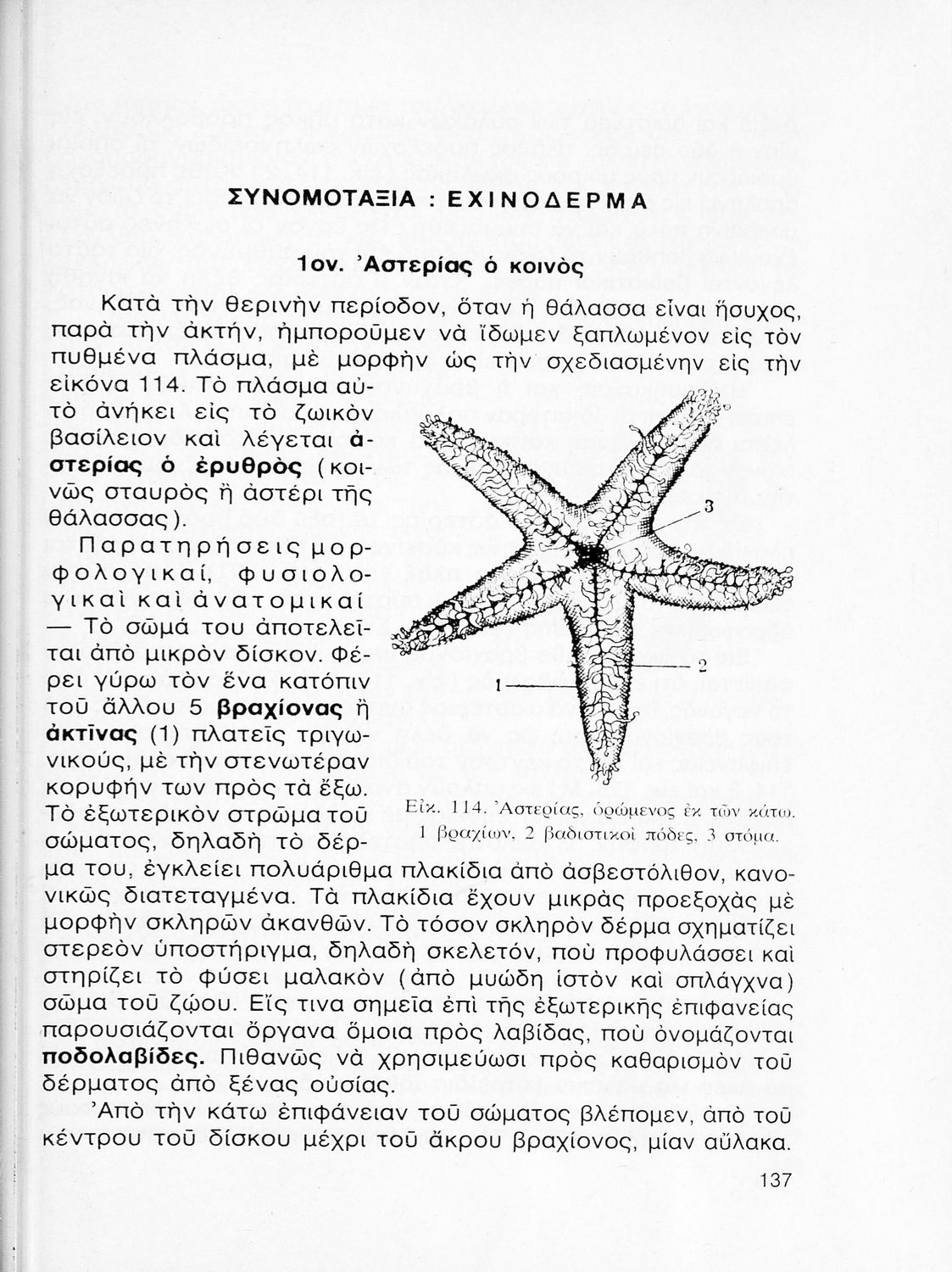 Σχολικό εγχειρίδιο Ζωολογίας Α΄ Γυμνασίου που εστιάζει στη φυσιολογία και ανατομία και παρουσιάζει τα διάφορα ζώα ανάλογα με την συνομοταξία στην οποία ανήκουν. Φέρει το σύμβολο της δικτατορίας.
