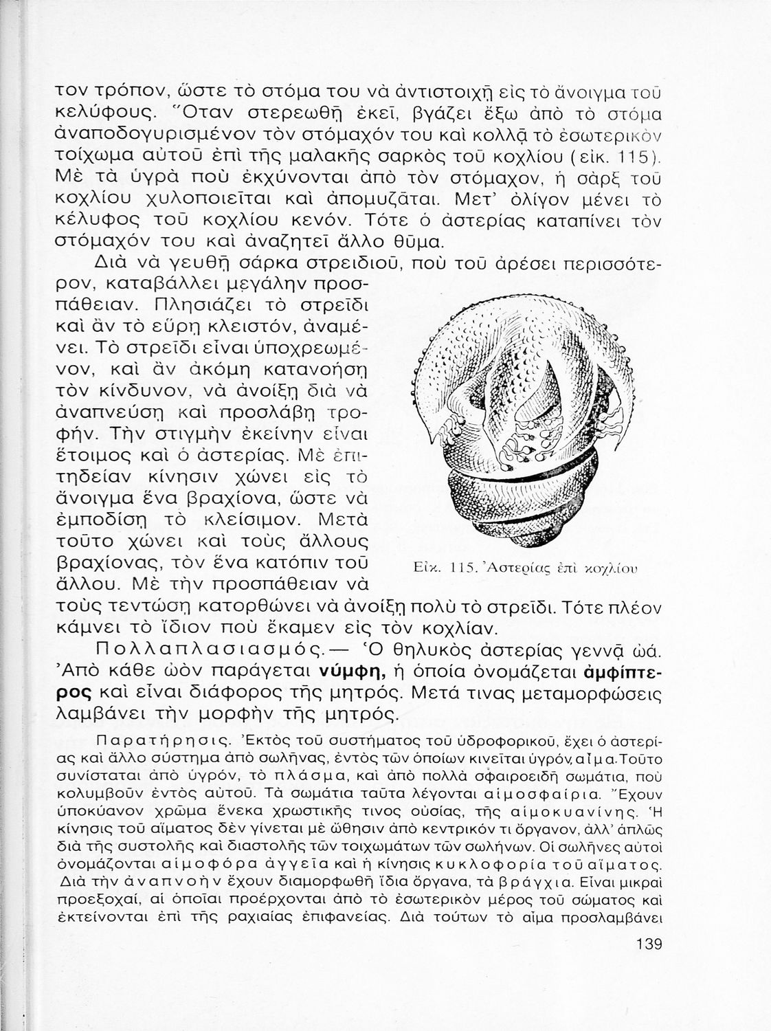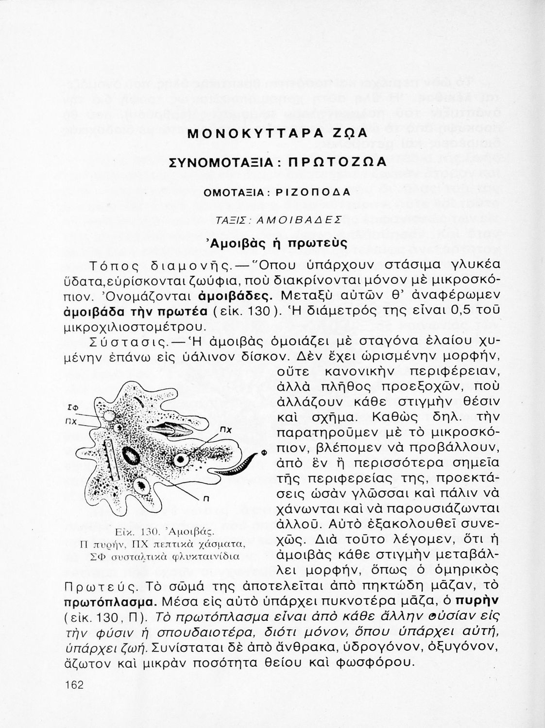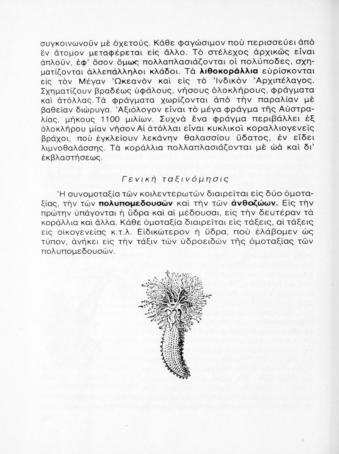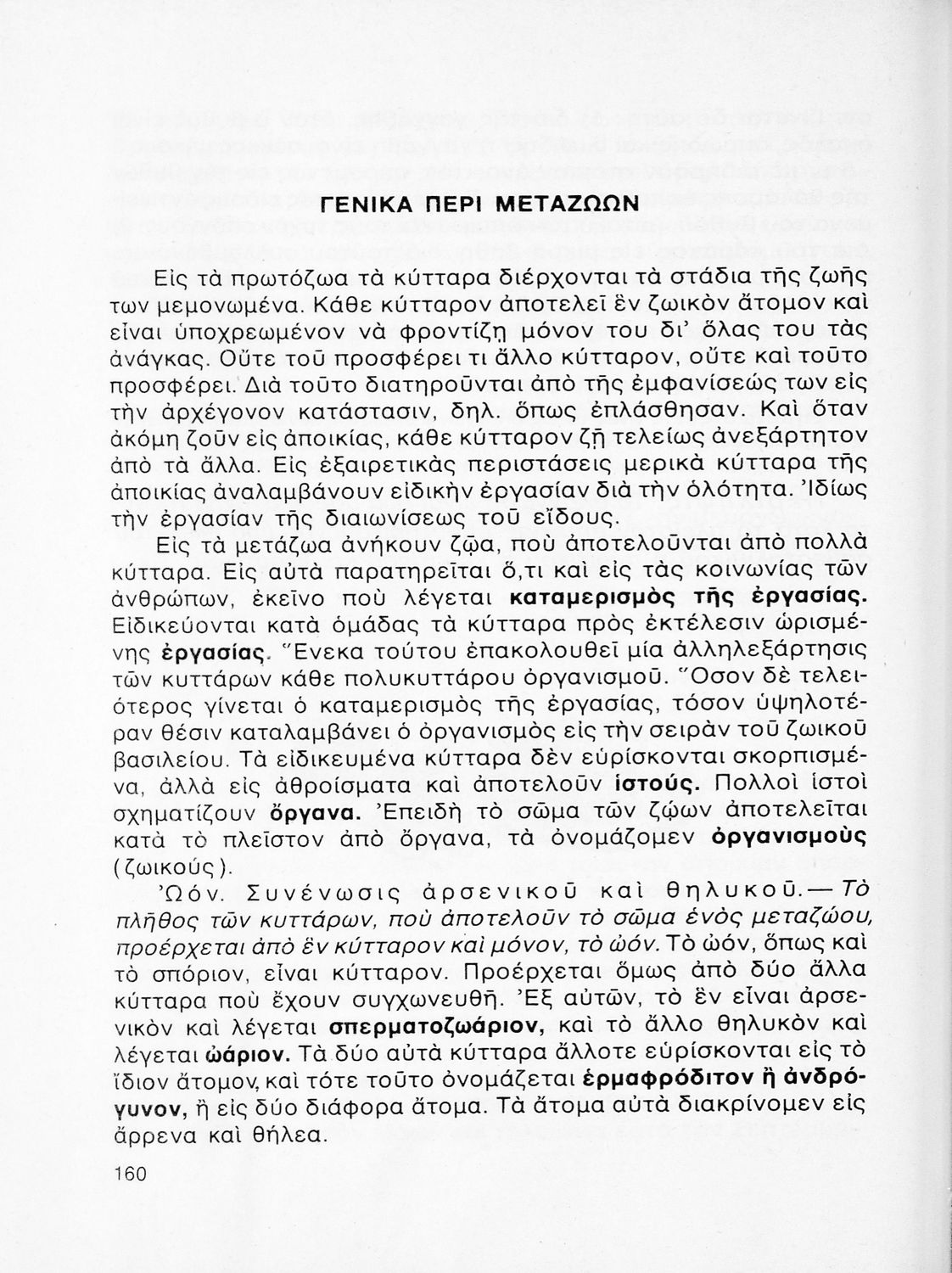 Σχολικό εγχειρίδιο Ζωολογίας Α΄ Γυμνασίου που εστιάζει στη φυσιολογία και ανατομία και παρουσιάζει τα διάφορα ζώα ανάλογα με την συνομοταξία στην οποία ανήκουν. Φέρει το σύμβολο της δικτατορίας.