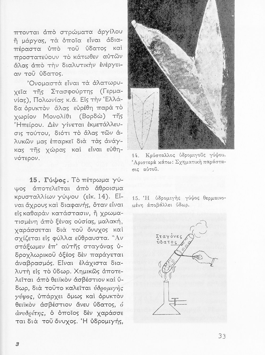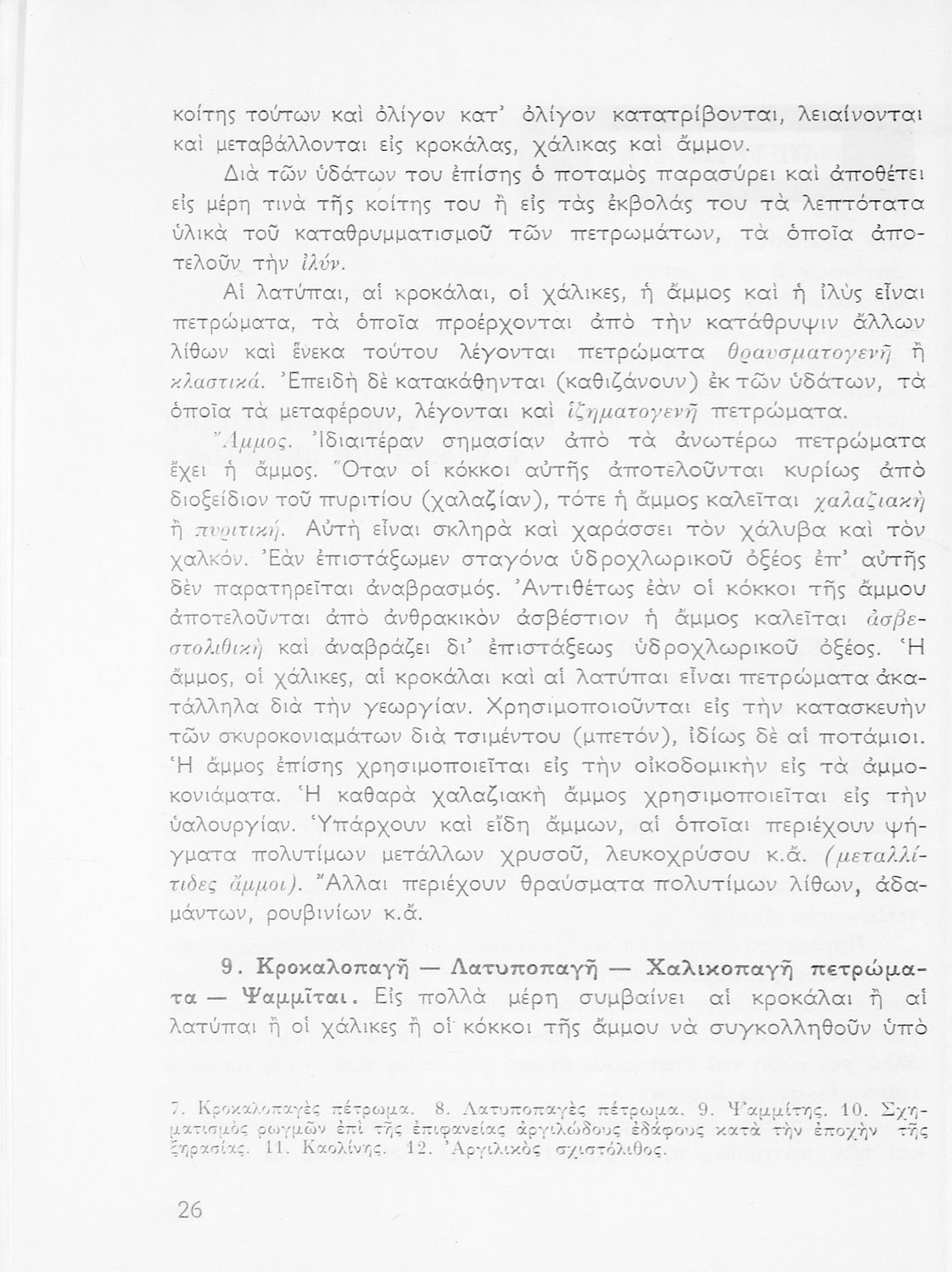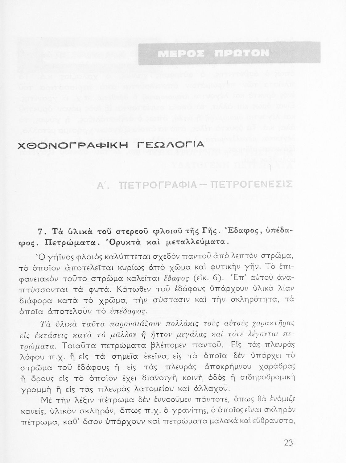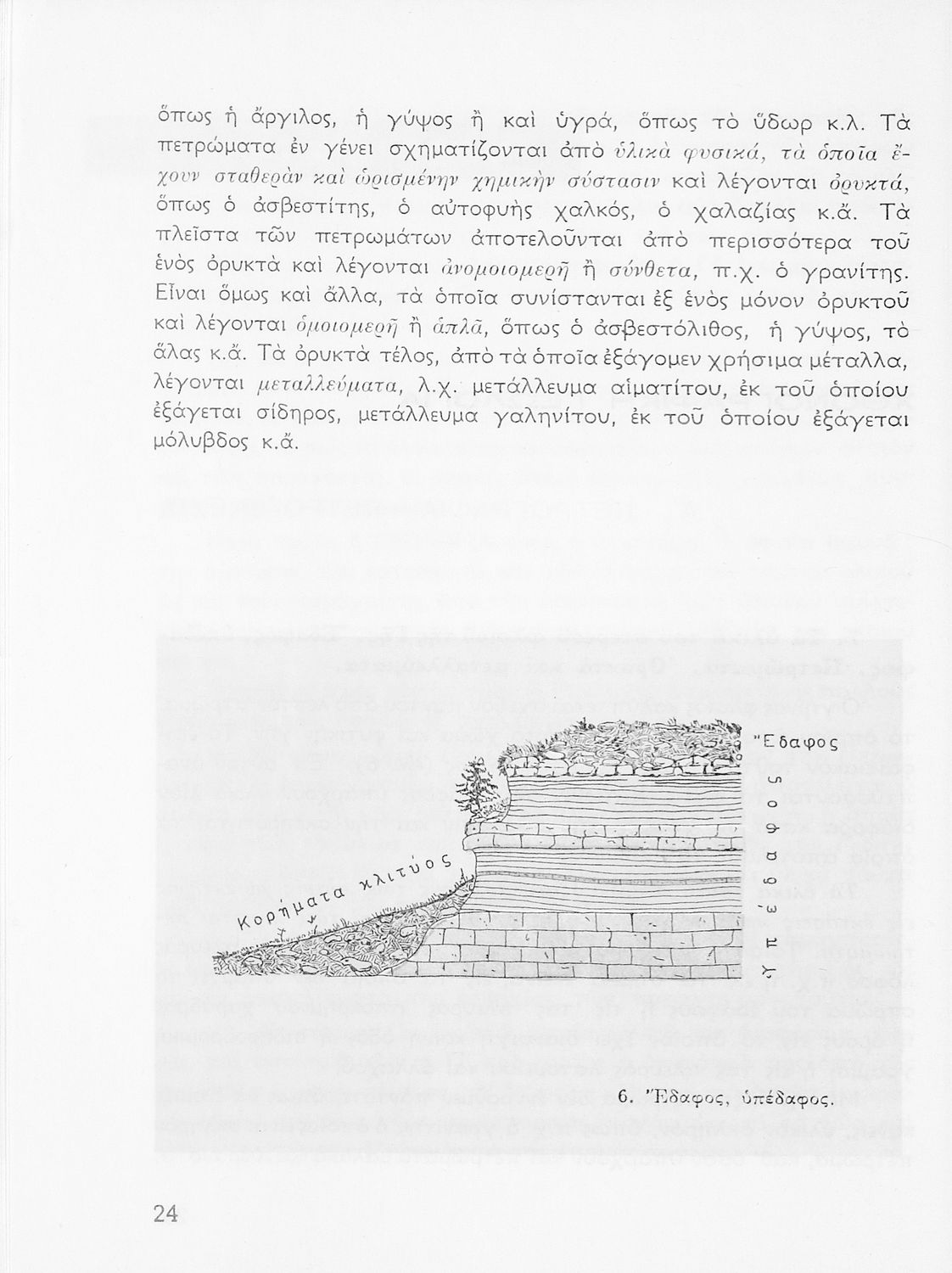 Σχολικό εγχειρίδιο Γεωλογίας/Ορυκτολογίας για την Δ΄ Γυμνασίου που περιλαμβάνει χθονογραφική, δυναμική και ιστορική γεωλογία, και γενική και ειδική ορυκτολογία. Ο συγγραφέας ήταν καθηγητής πανεπιστήμιου και η συγγραφέας φυσικός. Περιέχει παράρτημα με «Στοιχεία Μαθηματικής Γεωγραφίας» από τη γεωγραφία Δ’ τάξης του Αλκίνοου Μάζη (εκδ. 1963).