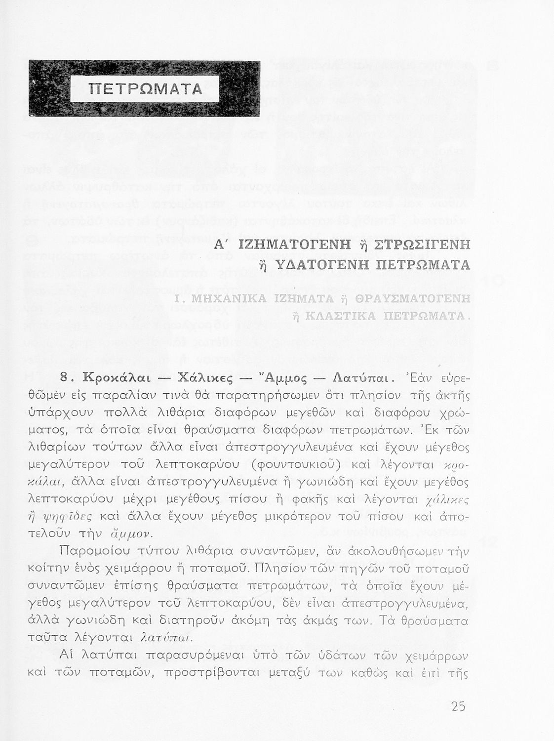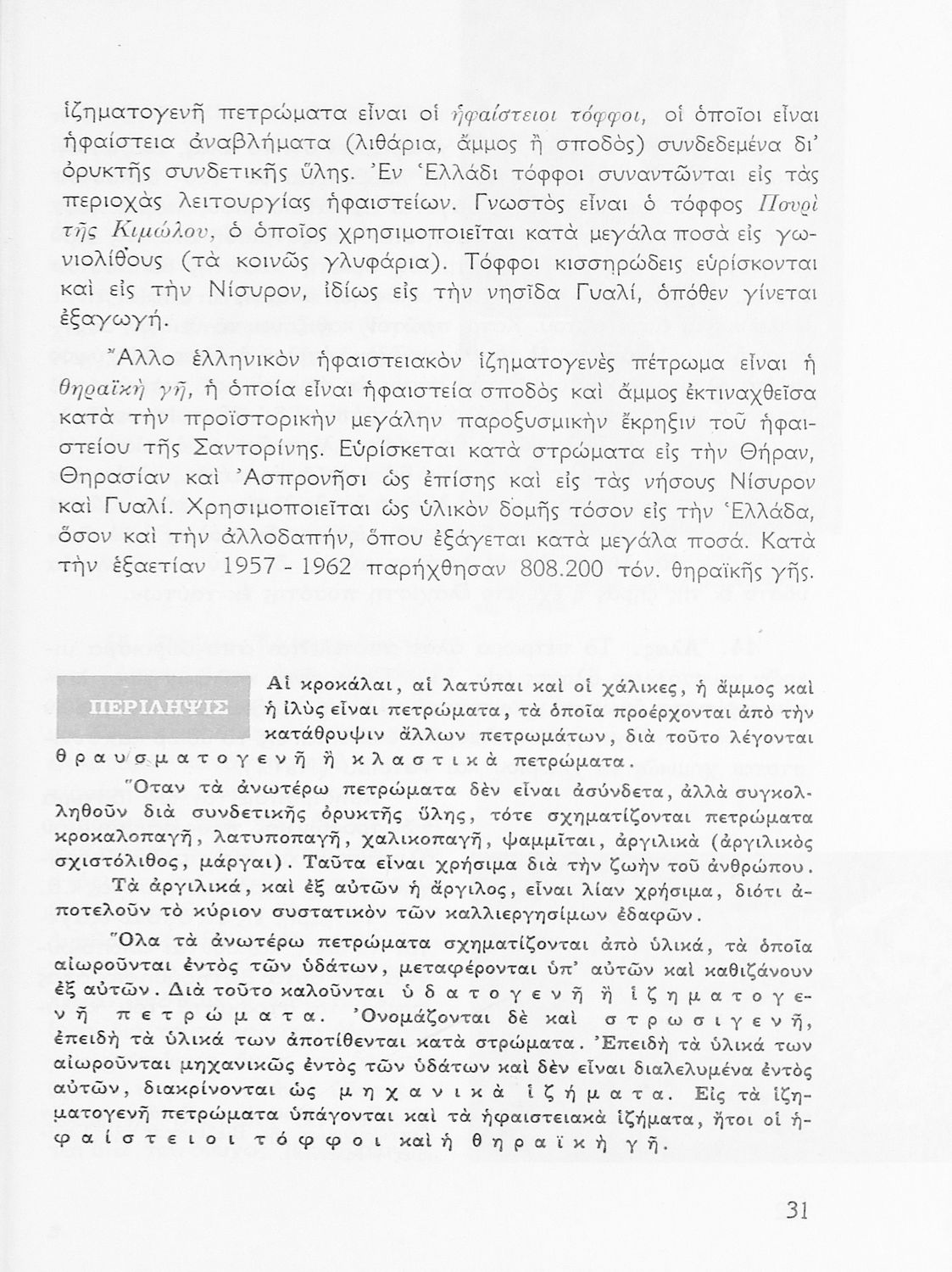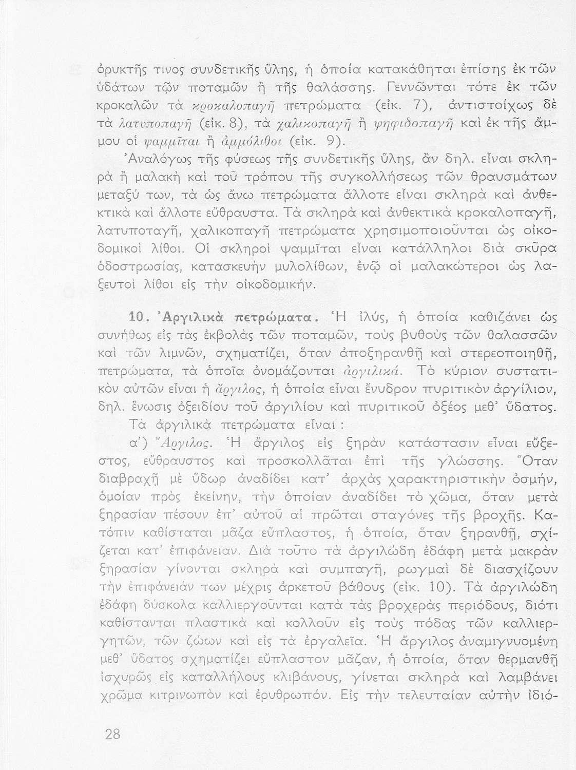 Σχολικό εγχειρίδιο Γεωλογίας/Ορυκτολογίας για την Δ΄ Γυμνασίου που περιλαμβάνει χθονογραφική, δυναμική και ιστορική γεωλογία, και γενική και ειδική ορυκτολογία. Ο συγγραφέας ήταν καθηγητής πανεπιστήμιου και η συγγραφέας φυσικός. Περιέχει παράρτημα με «Στοιχεία Μαθηματικής Γεωγραφίας» από τη γεωγραφία Δ’ τάξης του Αλκίνοου Μάζη (εκδ. 1963).