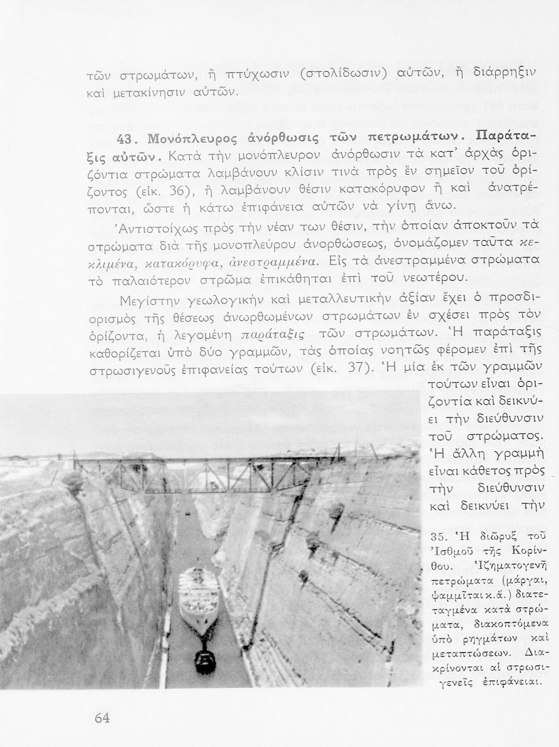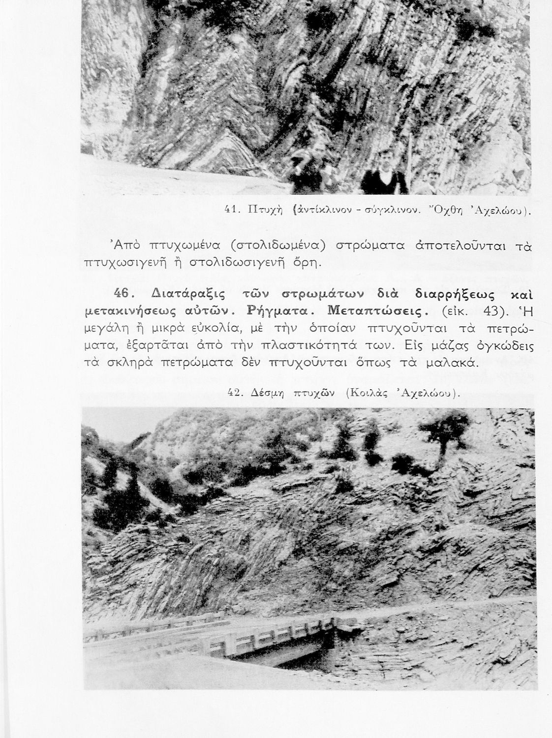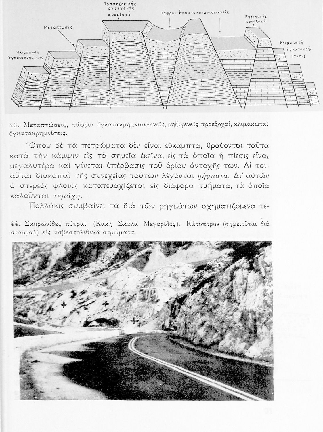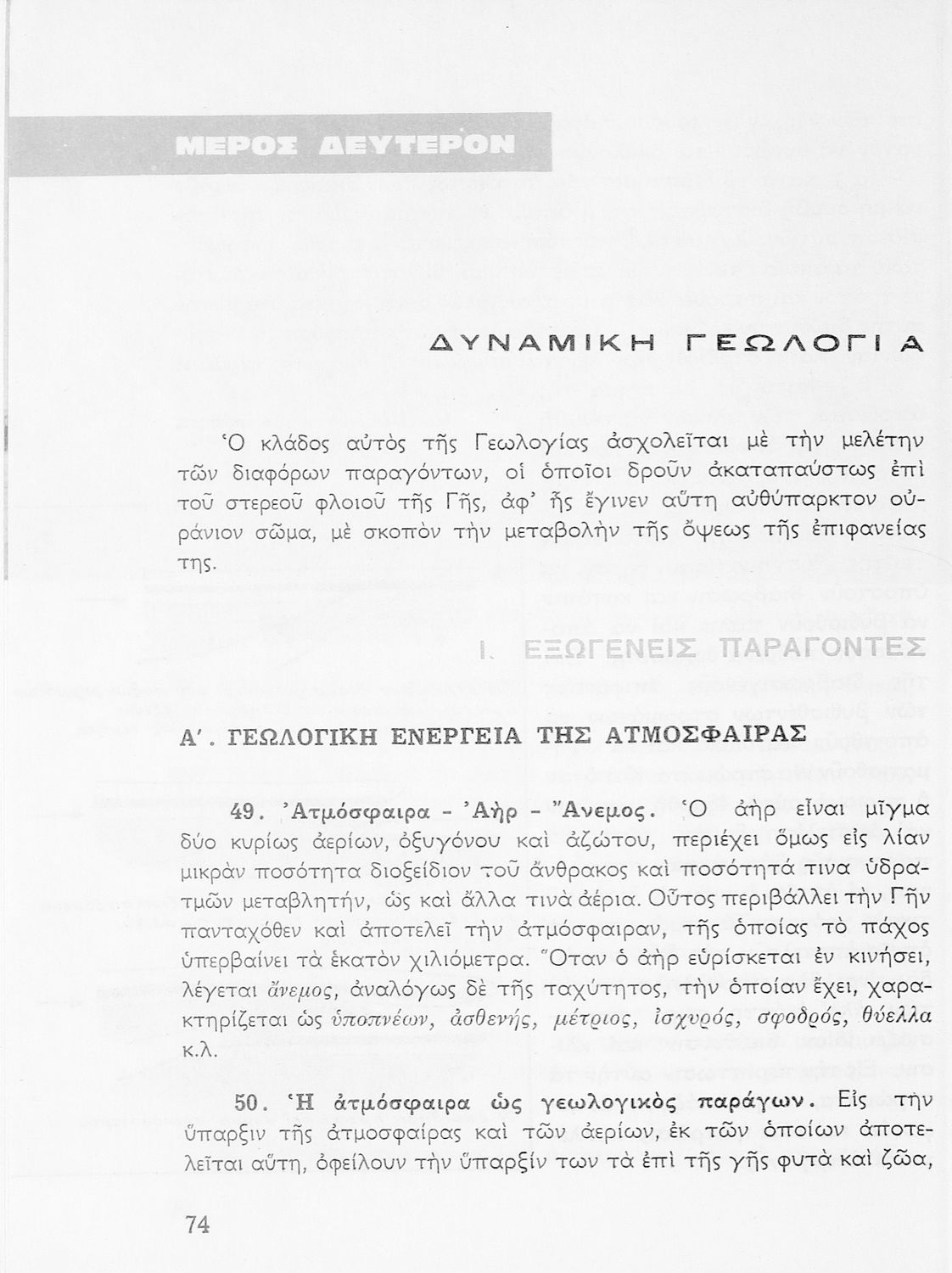 Σχολικό εγχειρίδιο Γεωλογίας/Ορυκτολογίας για την Δ΄ Γυμνασίου που περιλαμβάνει χθονογραφική, δυναμική και ιστορική γεωλογία, και γενική και ειδική ορυκτολογία. Ο συγγραφέας ήταν καθηγητής πανεπιστήμιου και η συγγραφέας φυσικός. Περιέχει παράρτημα με «Στοιχεία Μαθηματικής Γεωγραφίας» από τη γεωγραφία Δ’ τάξης του Αλκίνοου Μάζη (εκδ. 1963).