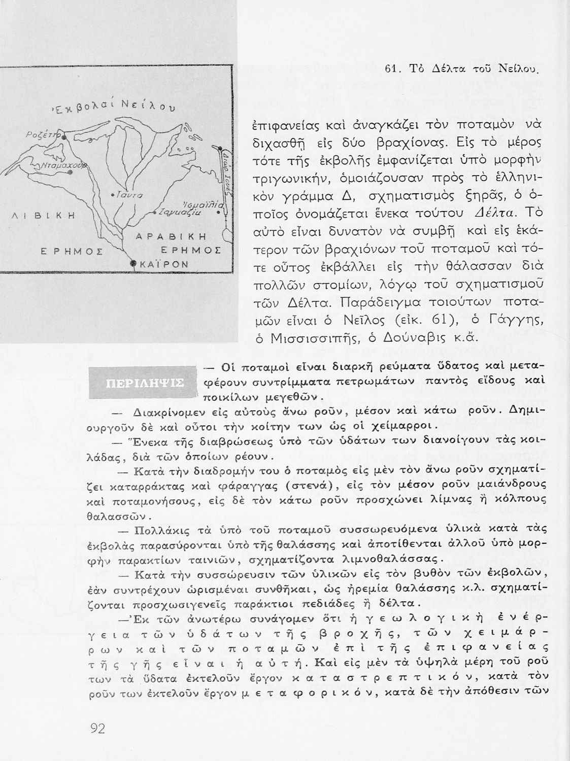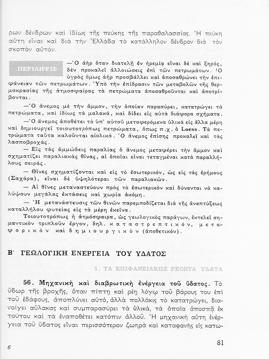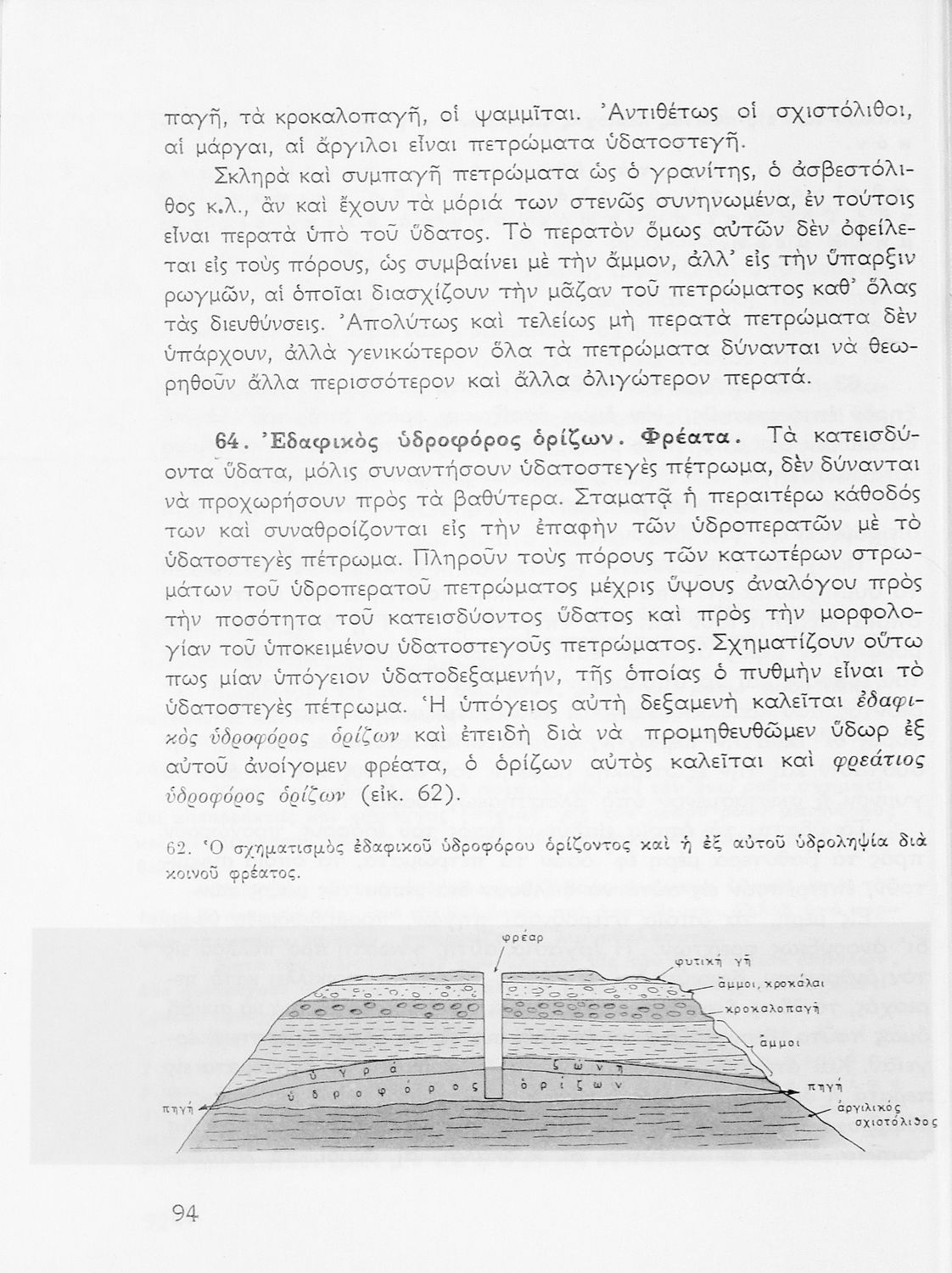 Σχολικό εγχειρίδιο Γεωλογίας/Ορυκτολογίας για την Δ΄ Γυμνασίου που περιλαμβάνει χθονογραφική, δυναμική και ιστορική γεωλογία, και γενική και ειδική ορυκτολογία. Ο συγγραφέας ήταν καθηγητής πανεπιστήμιου και η συγγραφέας φυσικός. Περιέχει παράρτημα με «Στοιχεία Μαθηματικής Γεωγραφίας» από τη γεωγραφία Δ’ τάξης του Αλκίνοου Μάζη (εκδ. 1963).