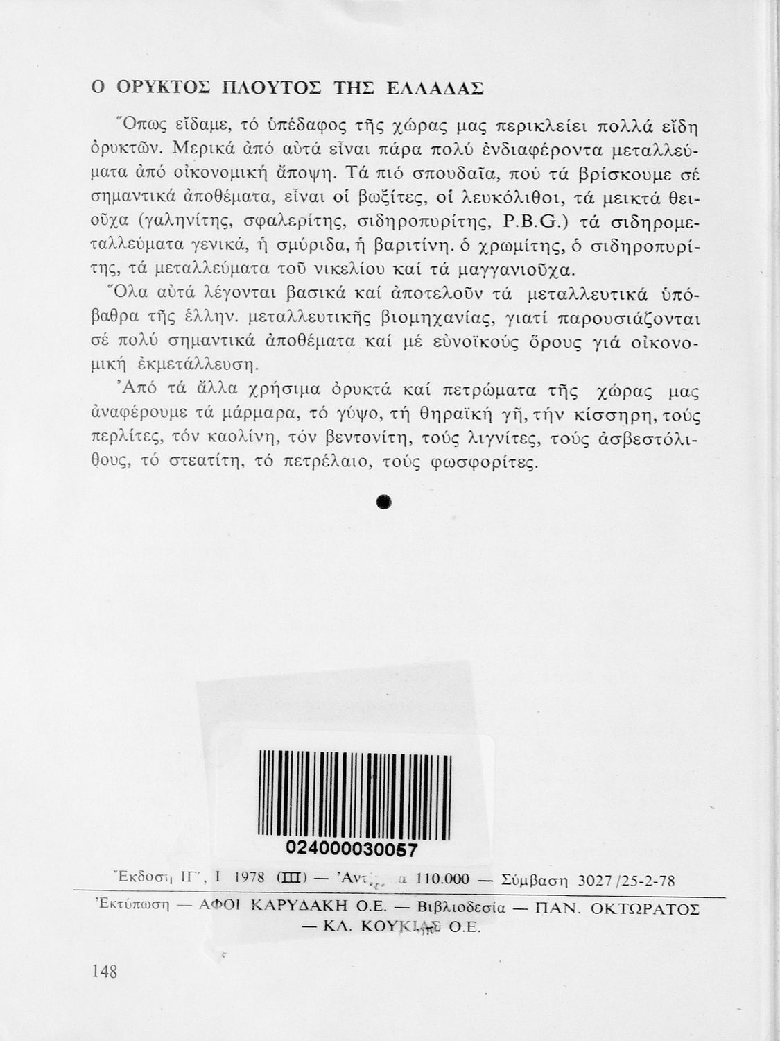 LDR 01438 2200217 4500 035 ## _a01-19645 040 ## _aΙνστιτούτο Εκπαιδευτικής Πολιτικής 041 ## _ael 100 ## _aΓεώργιος Γεωργαλάς _aΑκριβή Μαλλιάρη-Πατέρα 110 ## _a19645 245 0# _aΣτοιχεία γεωλογίας και ορυκτολογίας Α΄ Λυκείου 250 ## _a13η Έκδοση 260 ## _aΑθήνα _bΟργανισμός Εκδόσεως Διδακτικών Βιβλίων _c1978 300 ## _a148 _bΣχεδιαγράμματα και φωτογραφίες (ασπρόμαυρα και έγχρωμα), εξώφυλλο έγχρωμο _c19 520 ## _aΣχολικό εγχειρίδιο Γεωλογίας/Ορυκτολογίας για την Α΄ Λυκείου που περιλαμβάνει χθονογραφική, δυναμική και ιστορική γεωλογία, και γενική και ειδική ορυκτολογία. Ο συγγραφέας ήταν καθηγητής πανεπιστημίου και η συγγραφέας φυσικός. 521 ## _aΑ' Λυκείου 522 ## _aΕλλάδα 546 ## _aΔημοτική 563 ## _aΜαλακό Εξώφυλλο 583 ## _a3027/25-2-1978 _c1978 650 #4 _aΆνθρακας _aΗφαίστεια _aΠαγετώνες _aΠετρώματα _aΦλοιός της γης _aΧαλκός