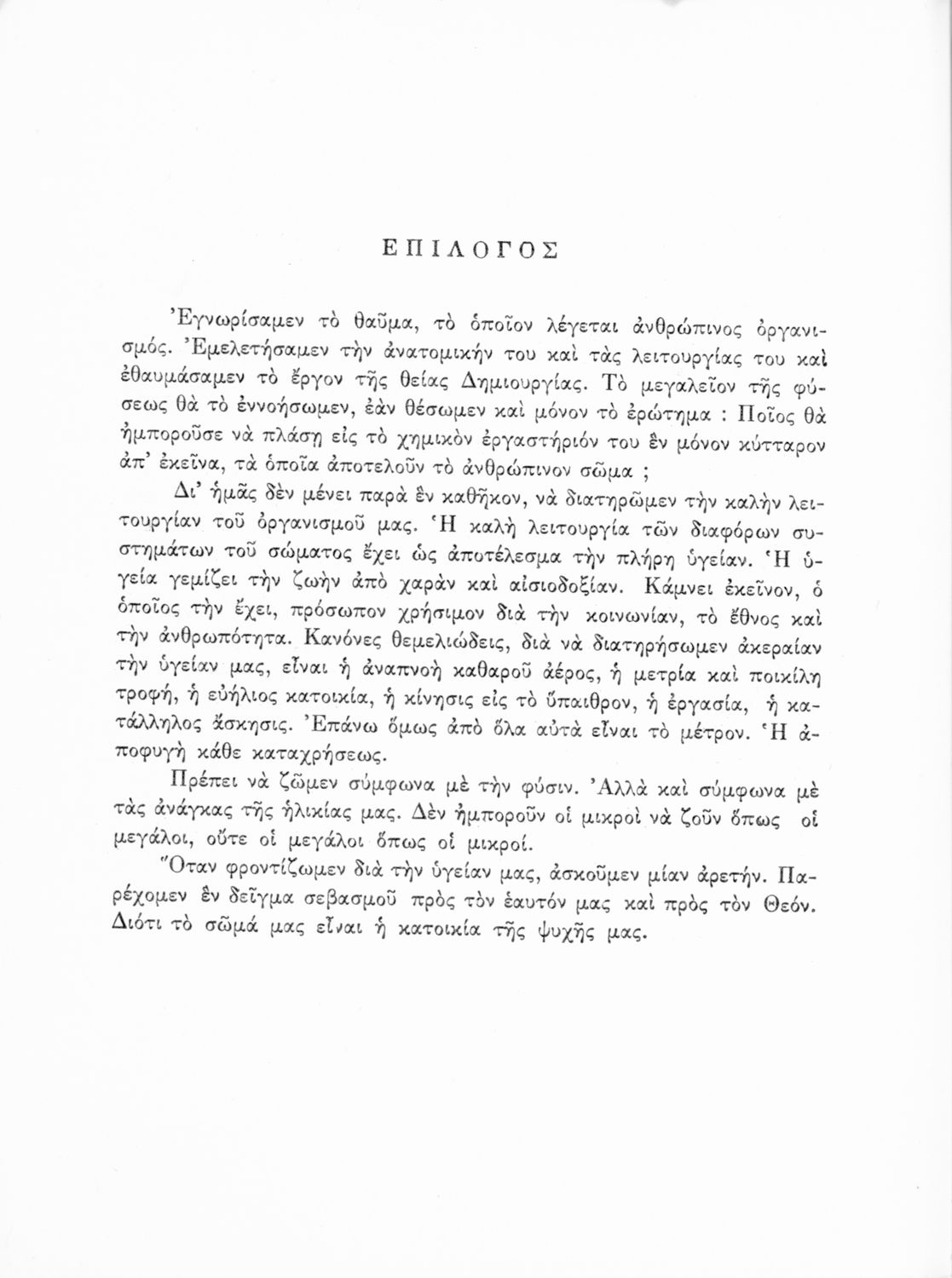 Βαθμίδα εκπαίδευσης: Δευτεροβάθμια Μάθημα: Ανθρωπολογία Γλώσσα: Απλή καθαρεύουσα Παρουσίαση περιεχομένου: Σχολικό εγχειρίδιο Ανθρωπολογίας που εστιάζει στην ανατομία και φυσιολογία του ανθρώπινου σώματος καθώς και στα μικρόβια και νοσήματα. |