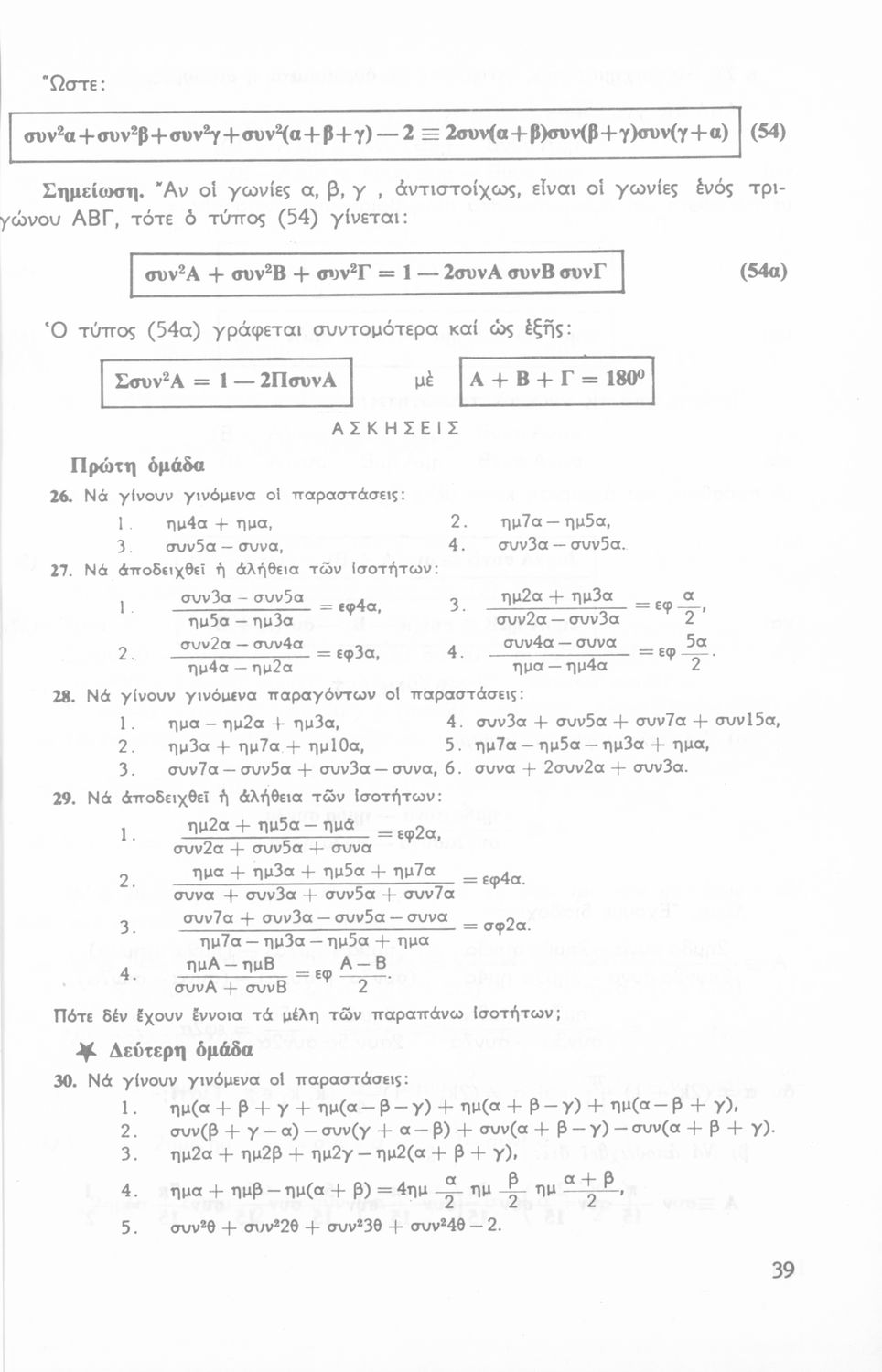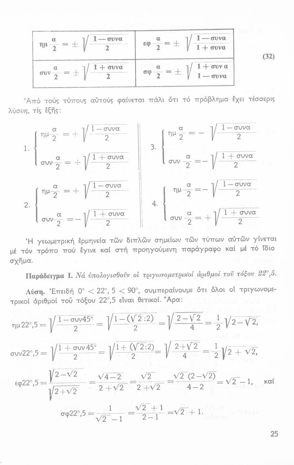 Παρουσίαση περιεχομένου: Σχολικό εγχειρίδιο Τριγωνομετρίας για την Β΄ Λυκείου χωρισμένο σε προβλήματα, εφαρμογές και ασκήσεις. Το εγχειρίδιο μεταγλωττίστηκε στη δημοτική από τους Βασίλειο Θεοδωρακόπουλο, Απόστολο Ζορμπά και τον συγγραφέα.