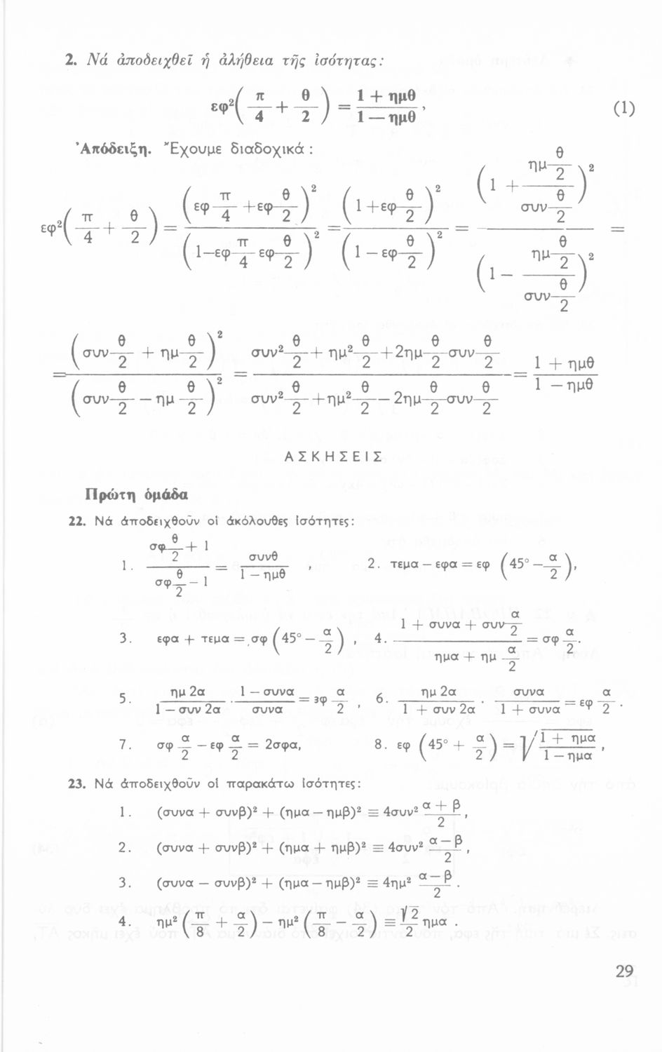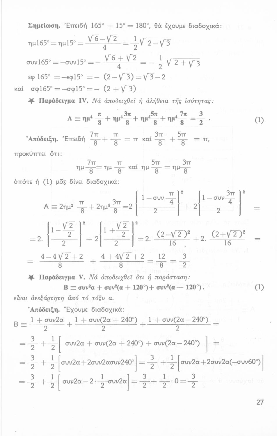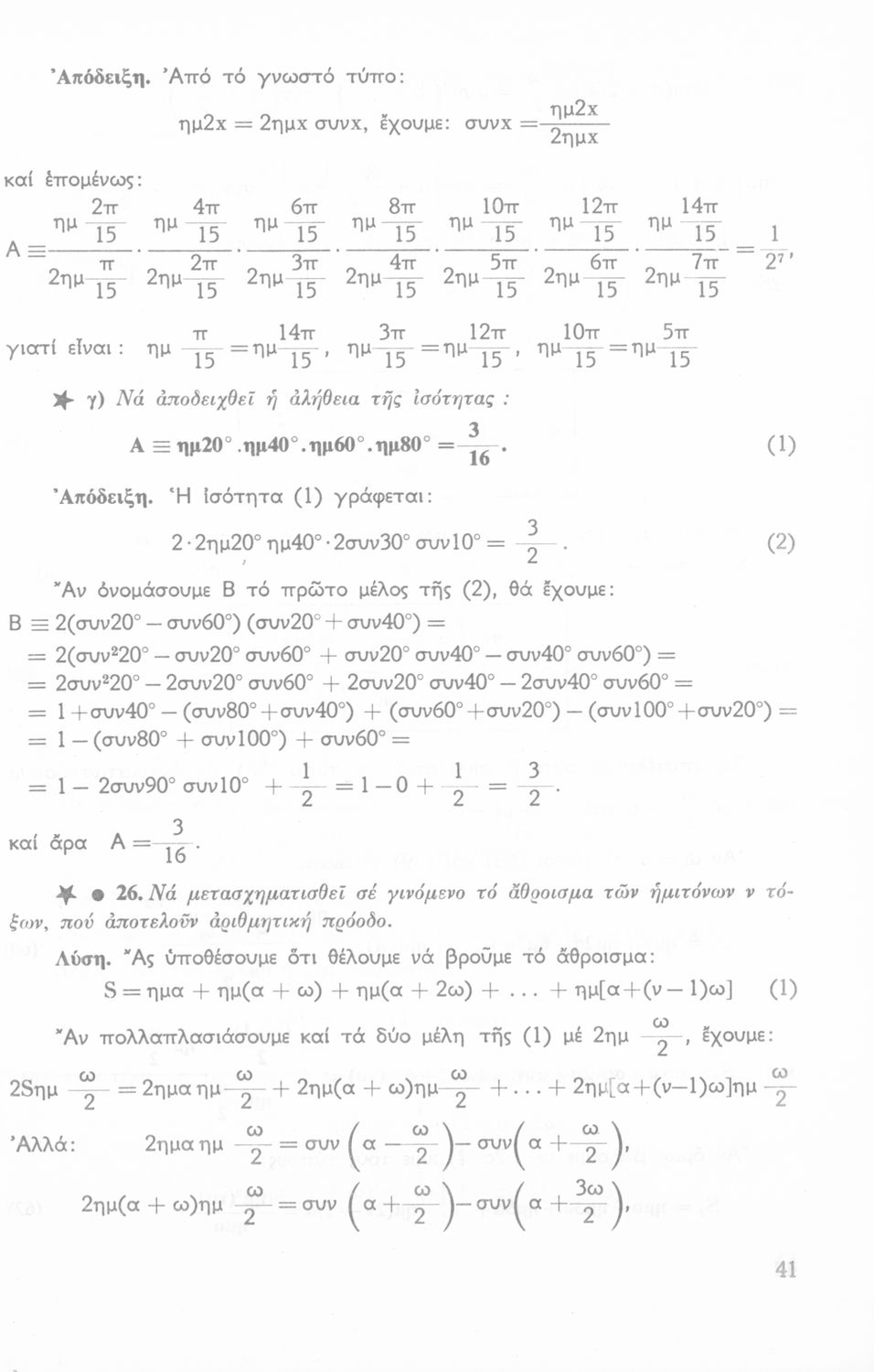 Σχολικό εγχειρίδιο Τριγωνομετρίας για την Β΄ Λυκείου χωρισμένο σε προβλήματα, εφαρμογές και ασκήσεις. Το εγχειρίδιο μεταγλωττίστηκε στη δημοτική από τους Βασίλειο Θεοδωρακόπουλο, Απόστολο Ζορμπά και τον συγγραφέα.
