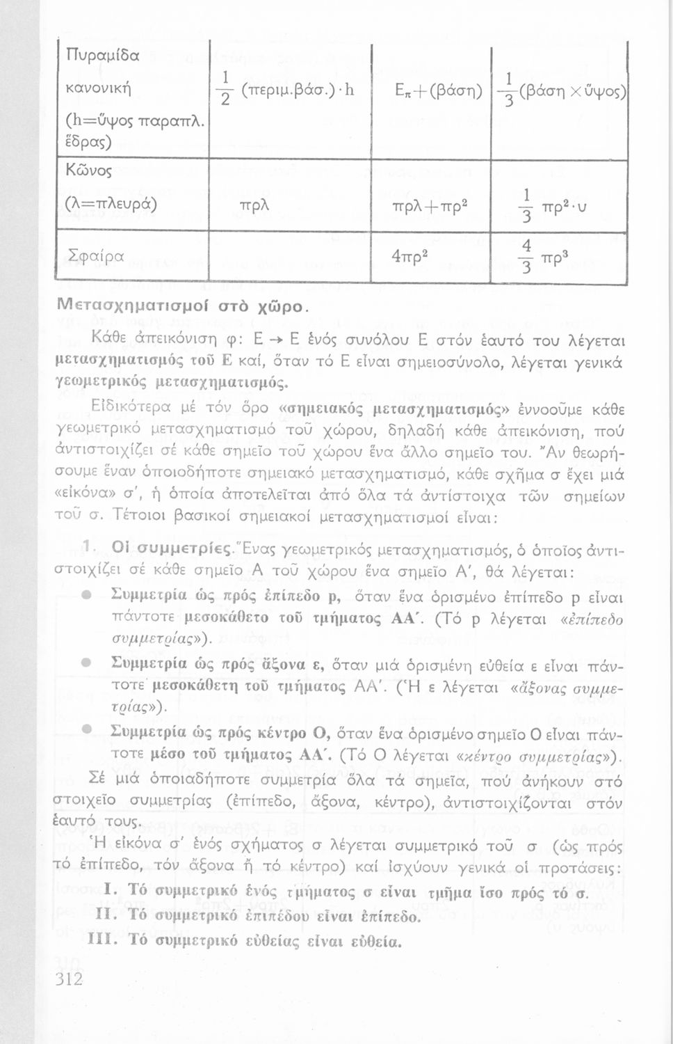 Σχολικό εγχειρίδιο Γεωμετρίας για τις Γ΄, Δ΄, Ε΄, ΣΤ΄ Γυμνασίου που περιλαμβάνει θεωρία και ασκήσεις και είναι χωρισμένο σε Επιπεδομετρία και Στερεομετρία. Φέρει το σύμβολο της δικτατορίας.
