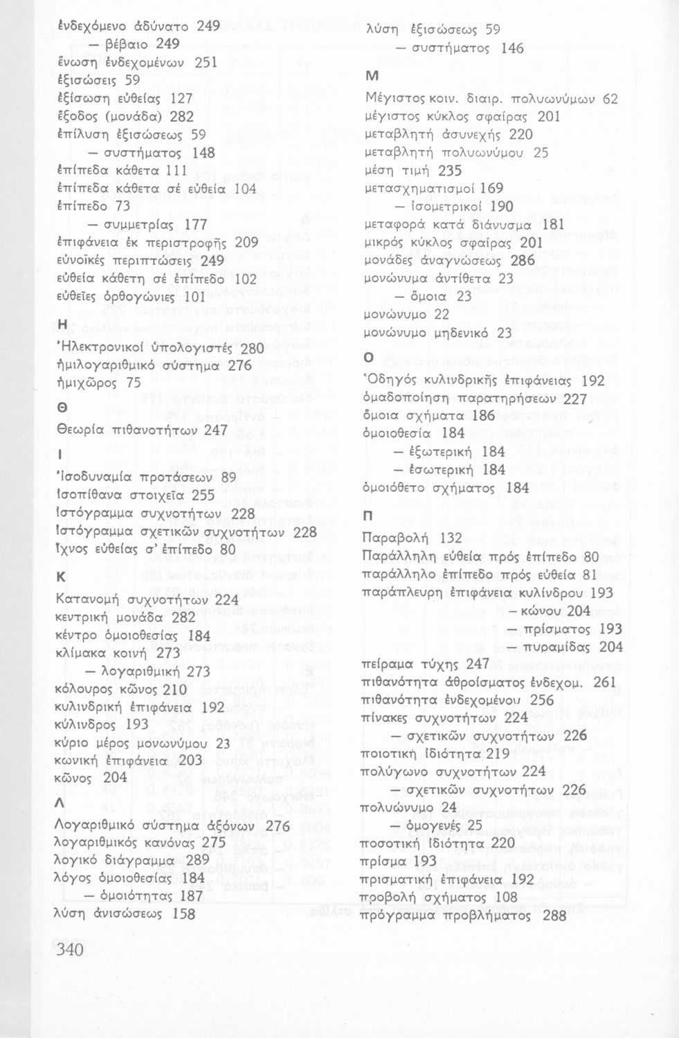 Σχολικό εγχειρίδιο Γεωμετρίας για τις Γ΄, Δ΄, Ε΄, ΣΤ΄ Γυμνασίου που περιλαμβάνει θεωρία και ασκήσεις και είναι χωρισμένο σε Επιπεδομετρία και Στερεομετρία. Φέρει το σύμβολο της δικτατορίας.