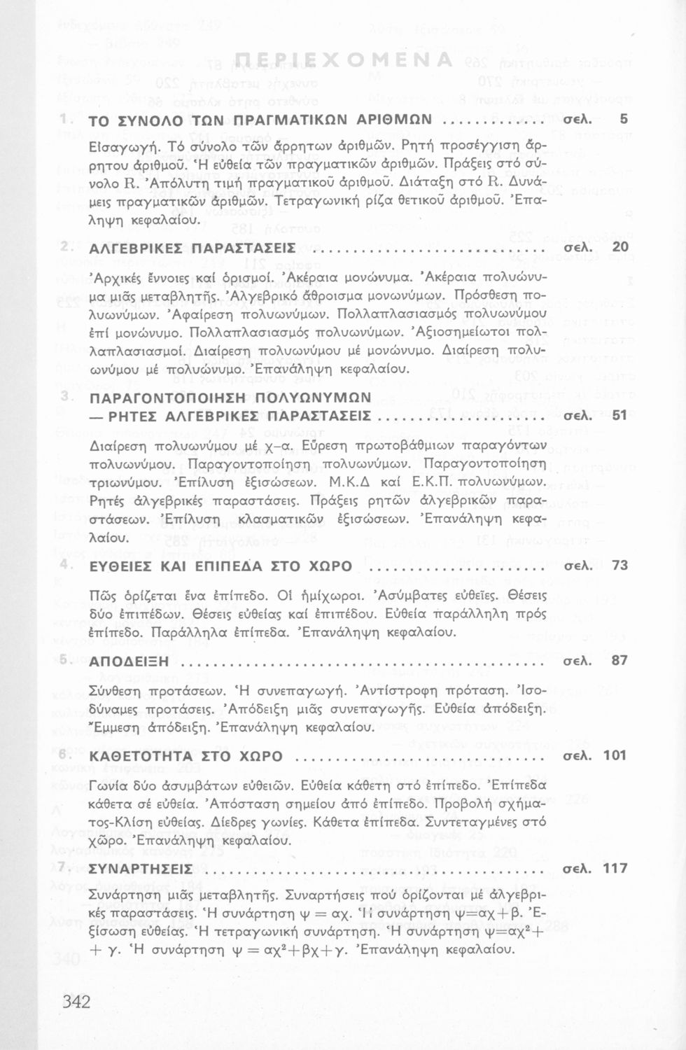 Σχολικό εγχειρίδιο Γεωμετρίας για τις Γ΄, Δ΄, Ε΄, ΣΤ΄ Γυμνασίου που περιλαμβάνει θεωρία και ασκήσεις και είναι χωρισμένο σε Επιπεδομετρία και Στερεομετρία.