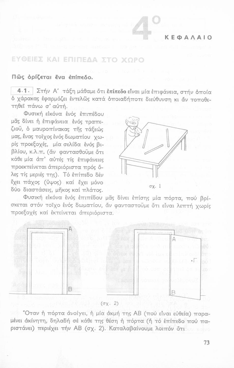 Σχολικό εγχειρίδιο Γεωμετρίας για τις Γ΄, Δ΄, Ε΄, ΣΤ΄ Γυμνασίου που περιλαμβάνει θεωρία και ασκήσεις και είναι χωρισμένο σε Επιπεδομετρία και Στερεομετρία. Φέρει το σύμβολο της δικτατορίας.