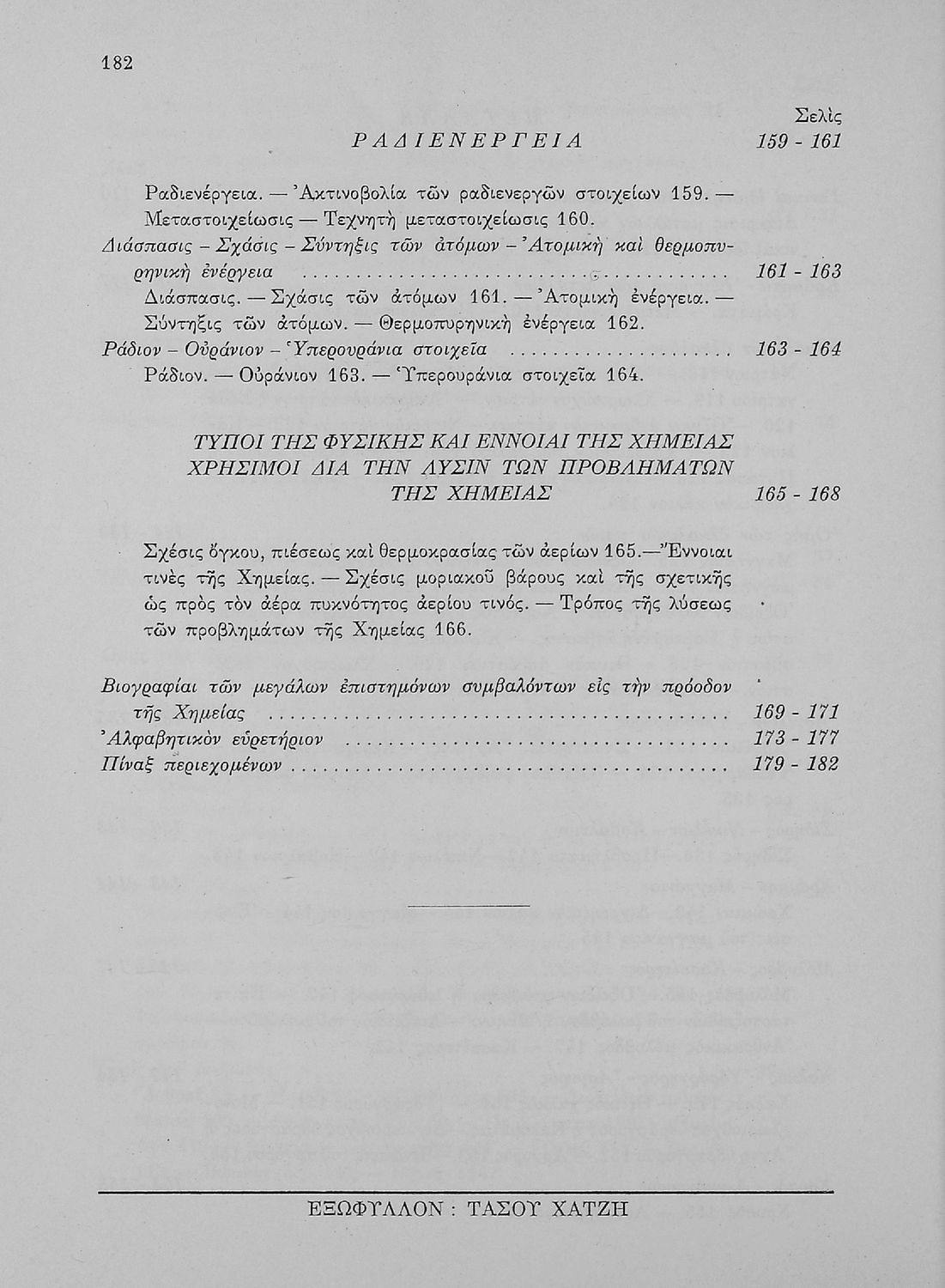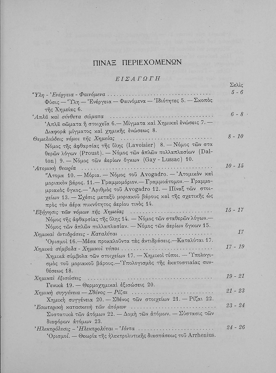 Σχολικό εγχειρίδιο Χημείας για τους μαθητές της Ε' Γυμνασίου. Χωρίζεται σε τρία μέρη. Στο πρώτο μέρος είναι μια γενική εισαγωγή στους θεμελιώδεις νόμους της Χημείας, τις χημικές αντιδράσεις, τα χημικά σύμβολα.