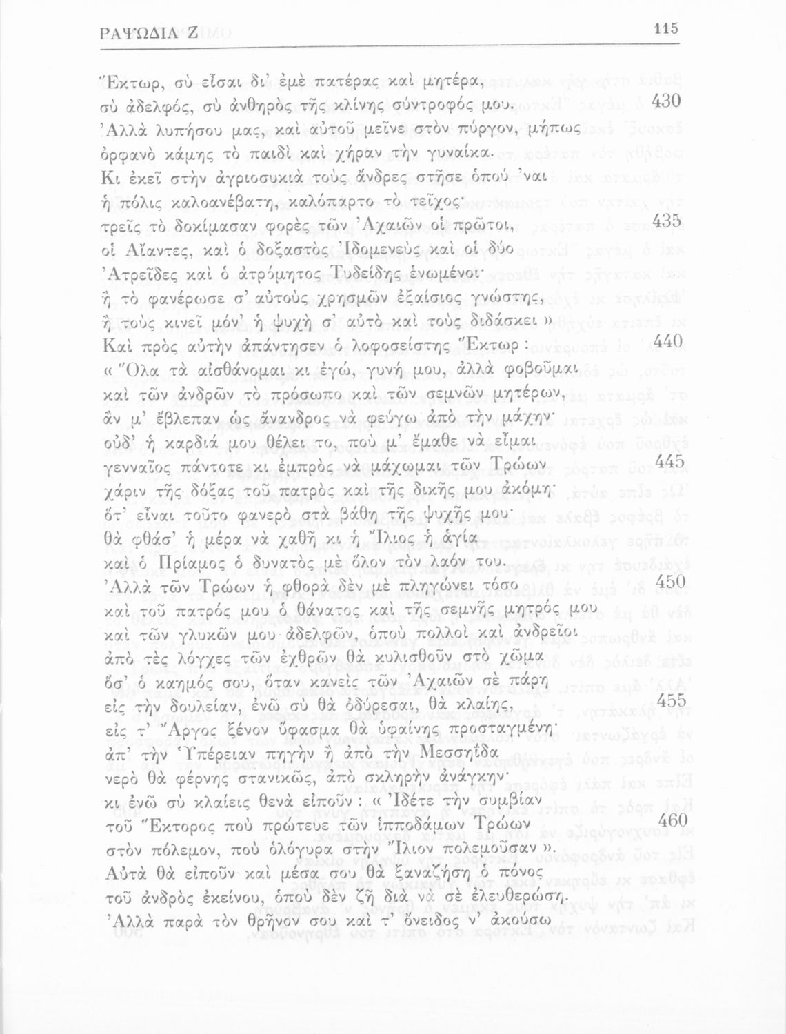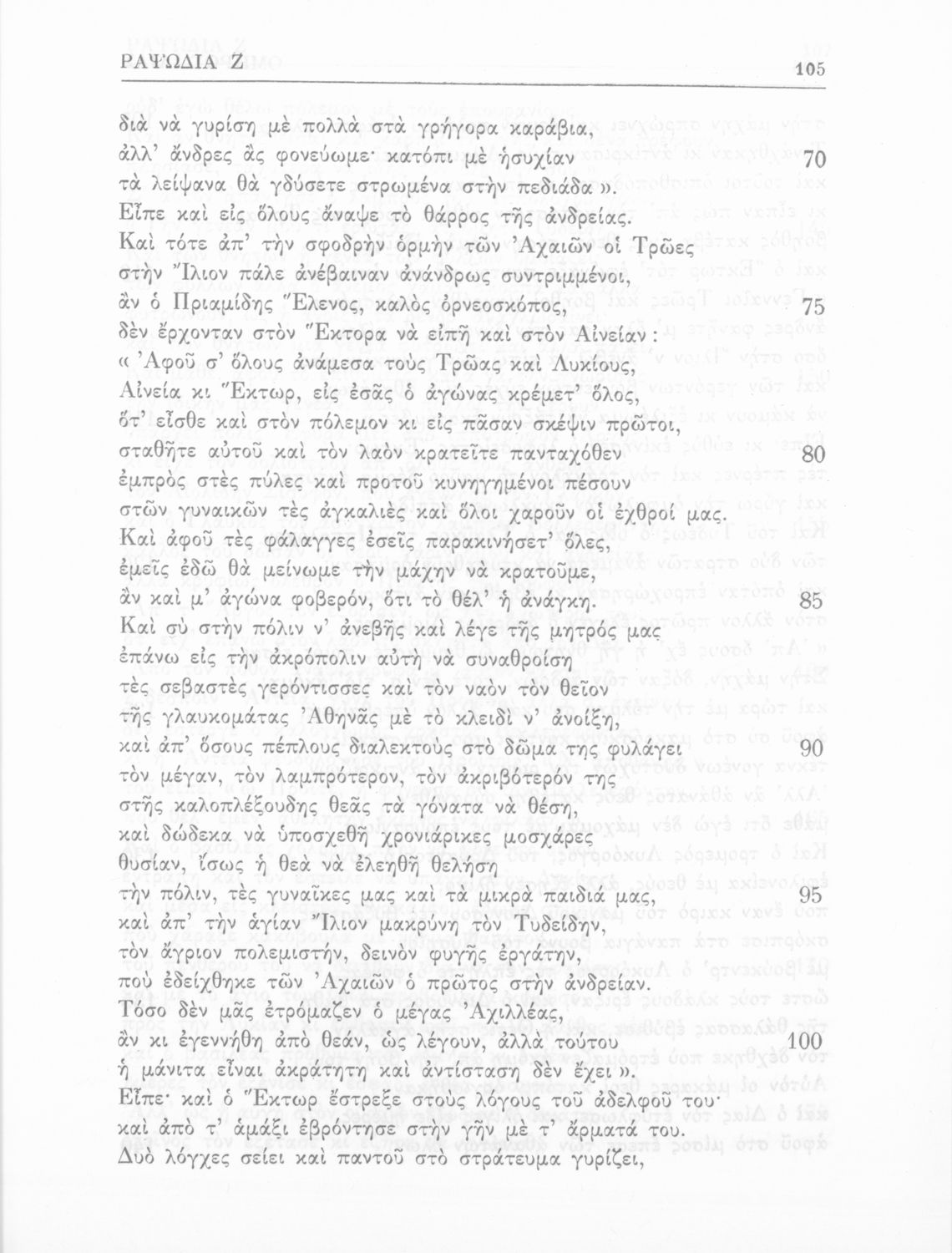 Μαθητικό βοήθημα του Ελληνικού Σχολείου, των Παρθεναγωγείων και του Γυμνασίου για το μάθημα των Αρχαίων Ελληνικών. Περιέχει τις ραψωδίες Ο, Π, Ρ, Σ, Τ, Χ, ψ, Ω από το πρωτότυπο με σχόλια και ερμηνευτικές ...