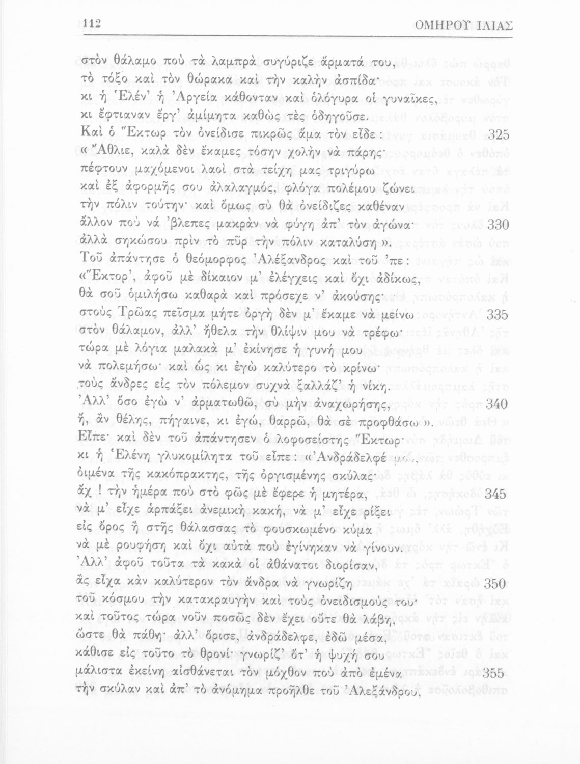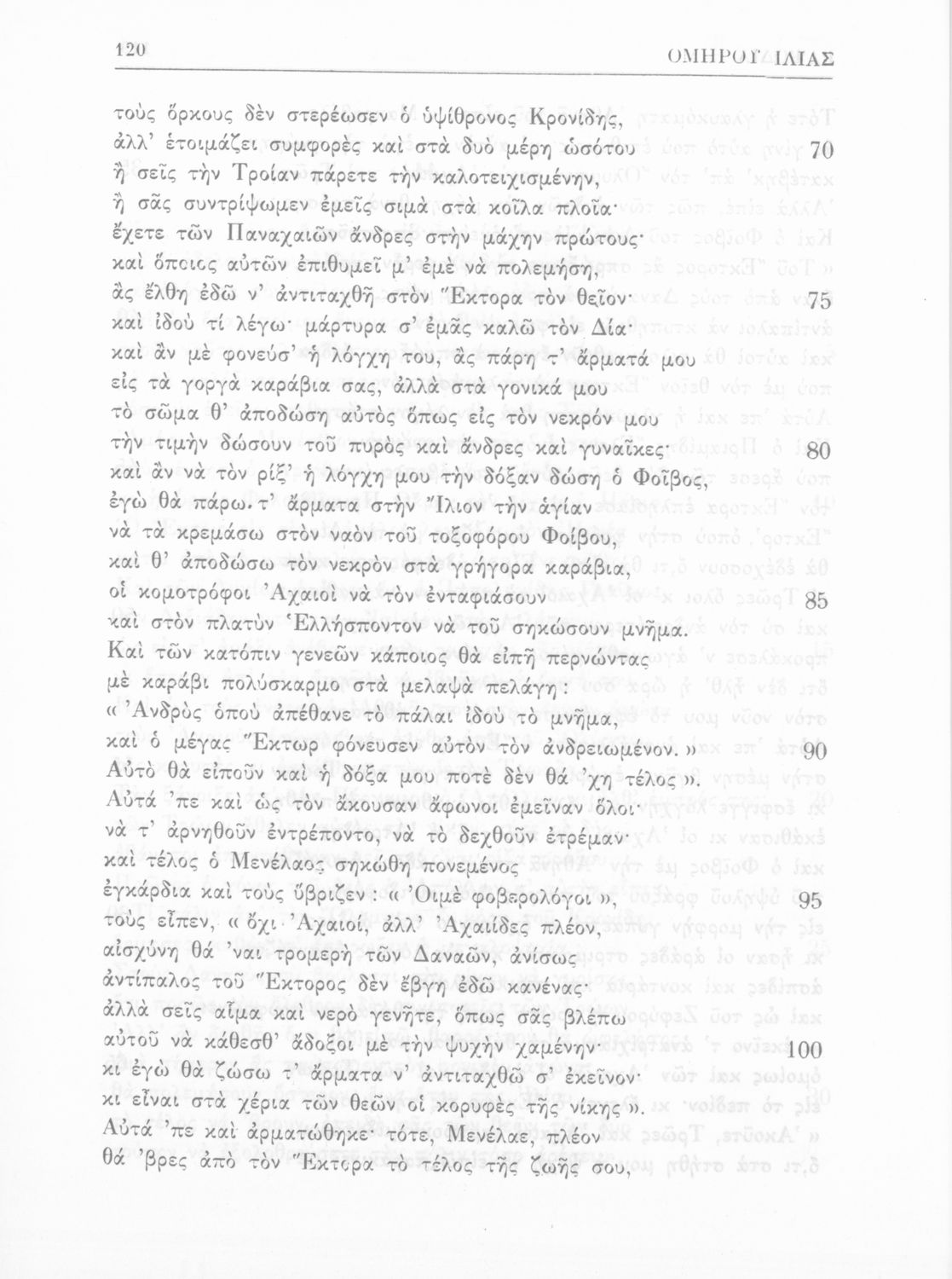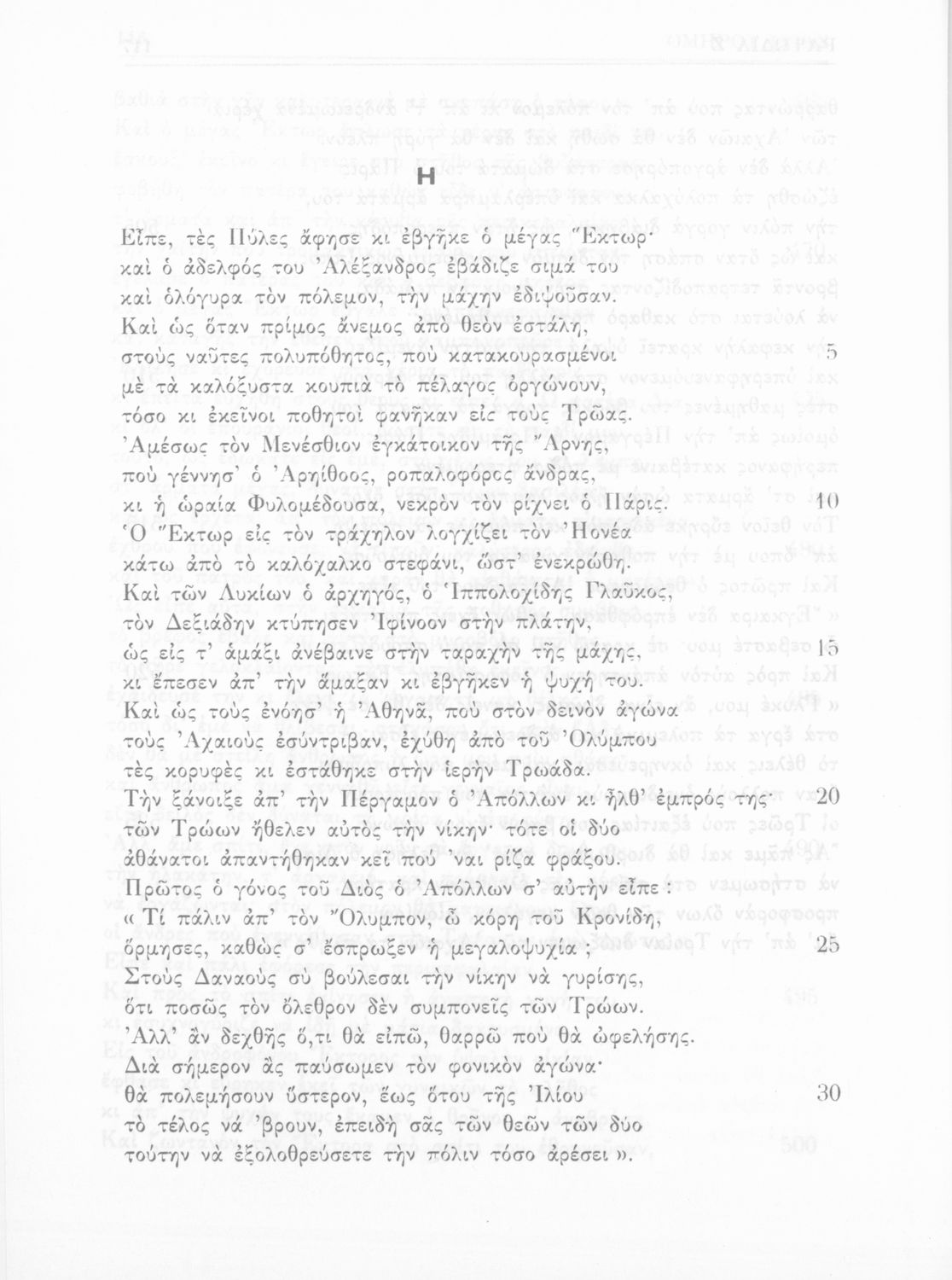 Σχολικό εγχειρίδιο της Δευτεροβάθμιας Εκπαίδευσης για το μάθημα των Αρχαίων Ελληνικών. Πρόκειται για το κείμενο της Ιλιάδας μεταφρασμένο, με πραγματολογικές παρατηρήσεις. Στο τέλος περιλαμβάνει λεξιλόγιο.