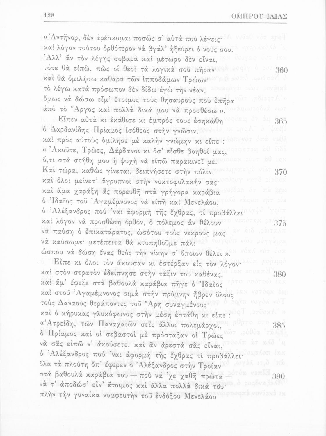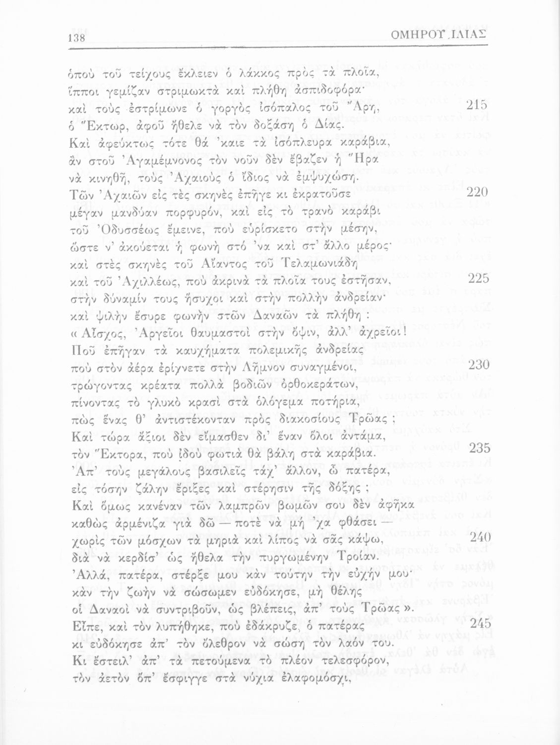 Σχολικό εγχειρίδιο της Δευτεροβάθμιας Εκπαίδευσης για το μάθημα των Αρχαίων Ελληνικών. Πρόκειται για το κείμενο της Ιλιάδας μεταφρασμένο, με πραγματολογικές παρατηρήσεις. Στο τέλος περιλαμβάνει λεξιλόγιο.