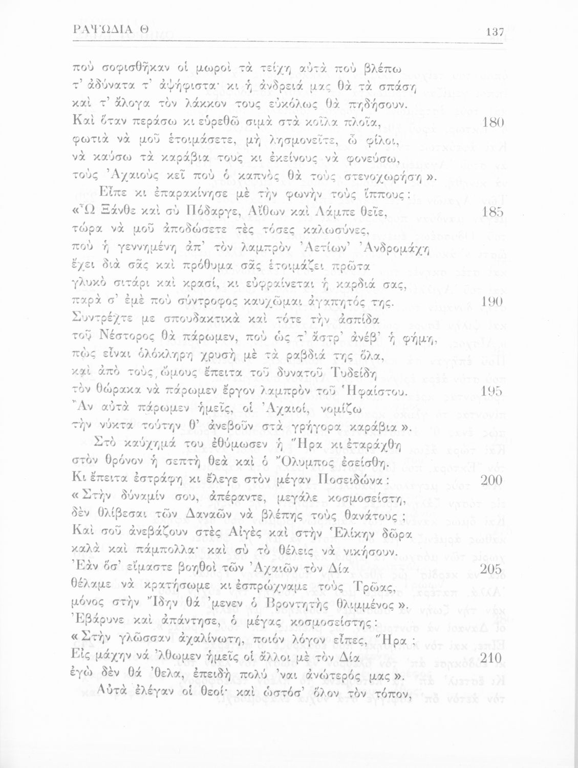 Μαθητικό βοήθημα του Ελληνικού Σχολείου, των Παρθεναγωγείων και του Γυμνασίου για το μάθημα των Αρχαίων Ελληνικών. Περιέχει τις ραψωδίες Ο, Π, Ρ, Σ, Τ, Χ, ψ, Ω από το πρωτότυπο με σχόλια και ερμηνευτικές ...