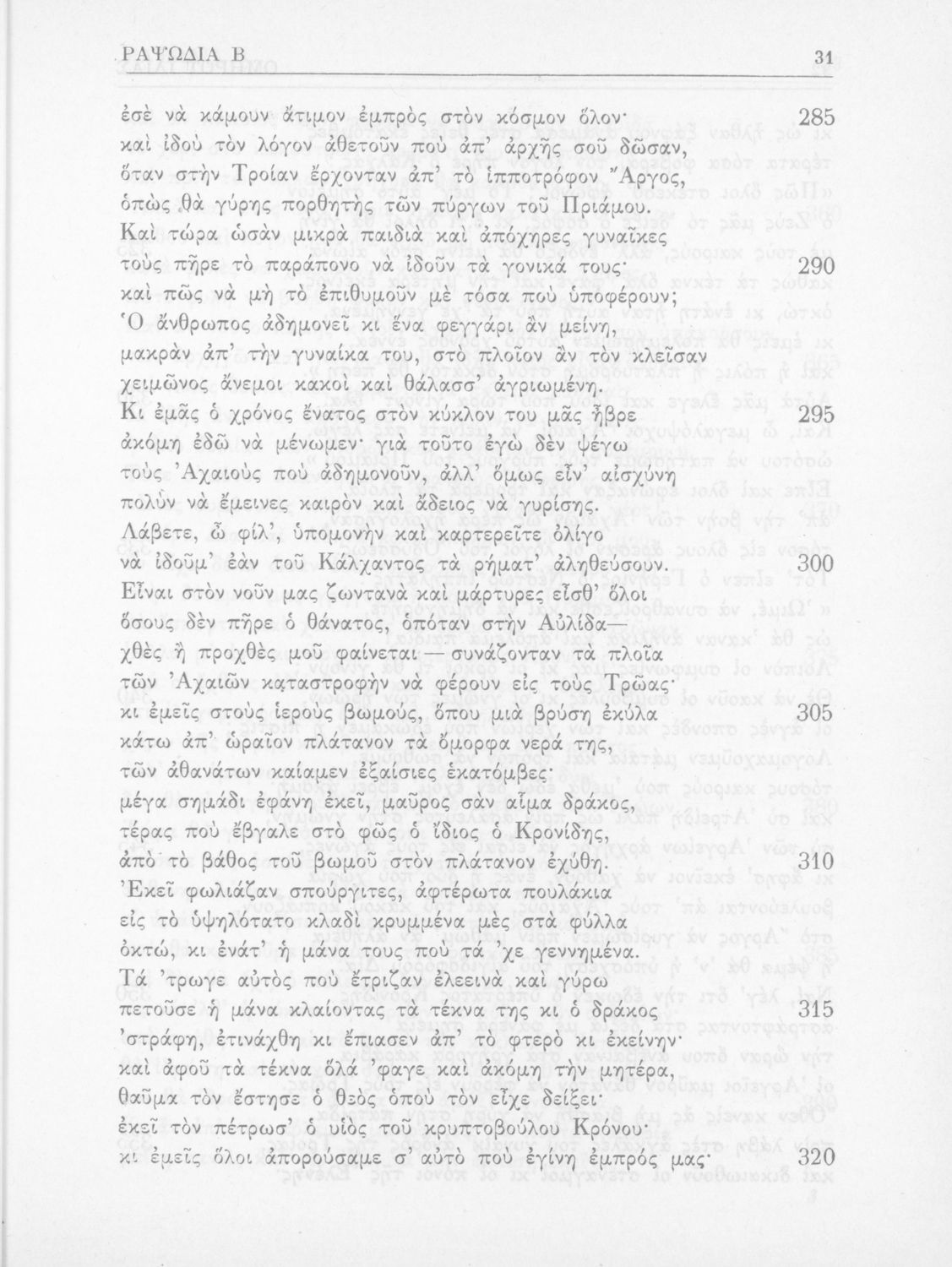Μαθητικό βοήθημα του Ελληνικού Σχολείου, των Παρθεναγωγείων και του Γυμνασίου για το μάθημα των Αρχαίων Ελληνικών. Περιέχει τις ραψωδίες Ο, Π, Ρ, Σ, Τ, Χ, ψ, Ω από το πρωτότυπο με σχόλια και ερμηνευτικές ...