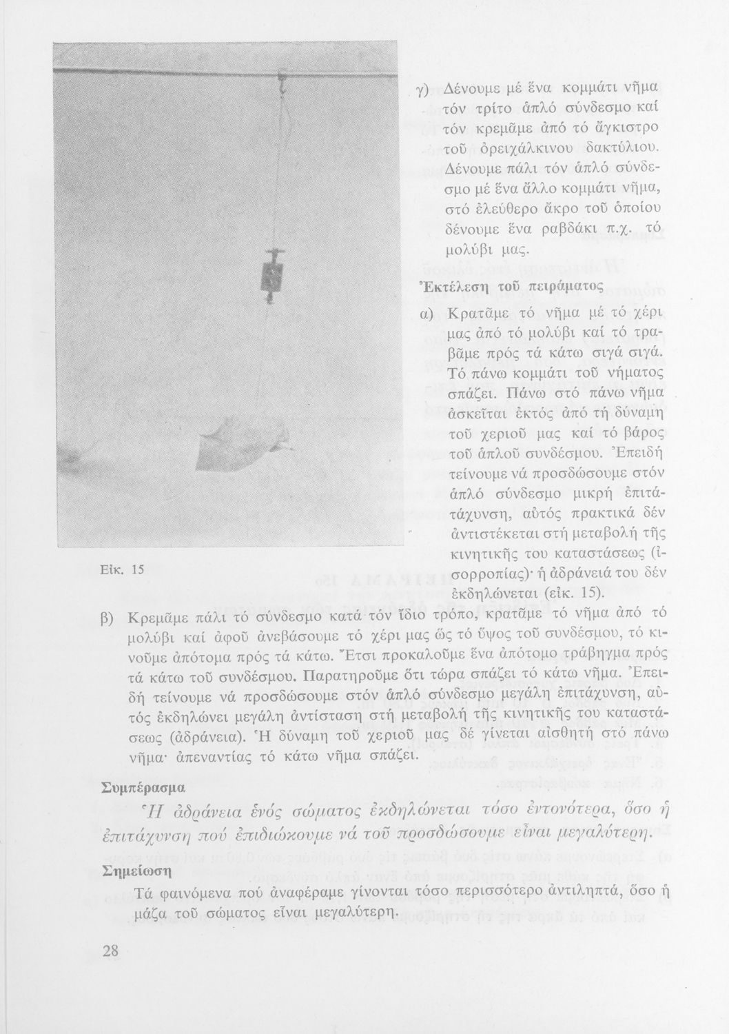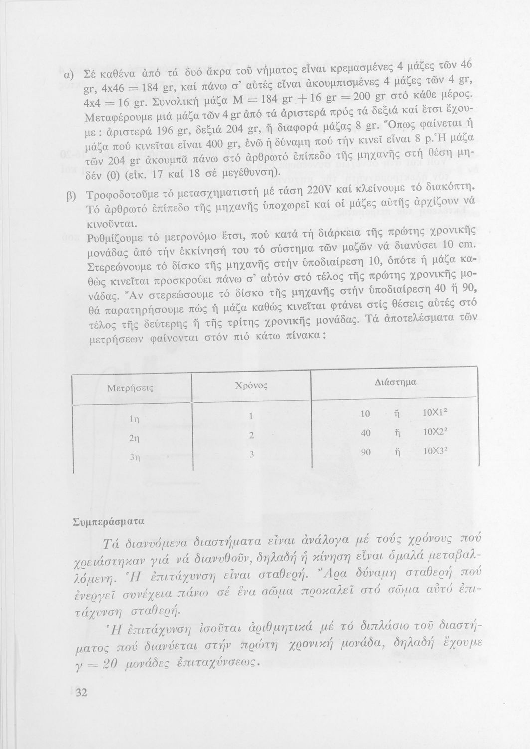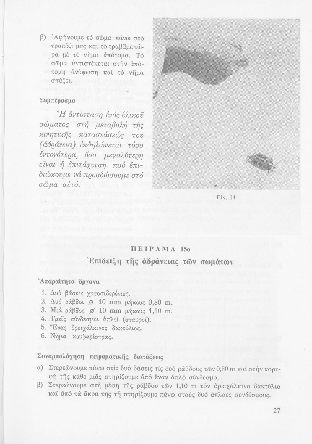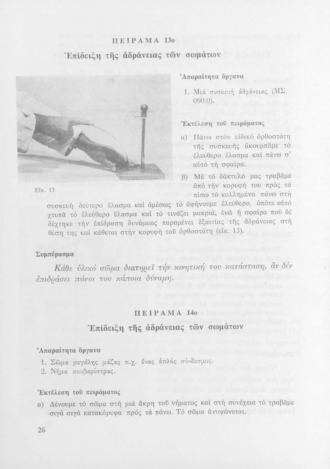 Παρουσίαση περιεχομένου: Σχολικό εγχειρίδιο Φυσικής που περιλαμβάνει πειράματα στον τομέα της μηχανικής και των κινήσεων στερεών και υγρών σωμάτων καθώς και πειράματα που μελετούν την μεταβολή των σωμάτων αυτών στις αλλαγές της θερμοκρασίας.