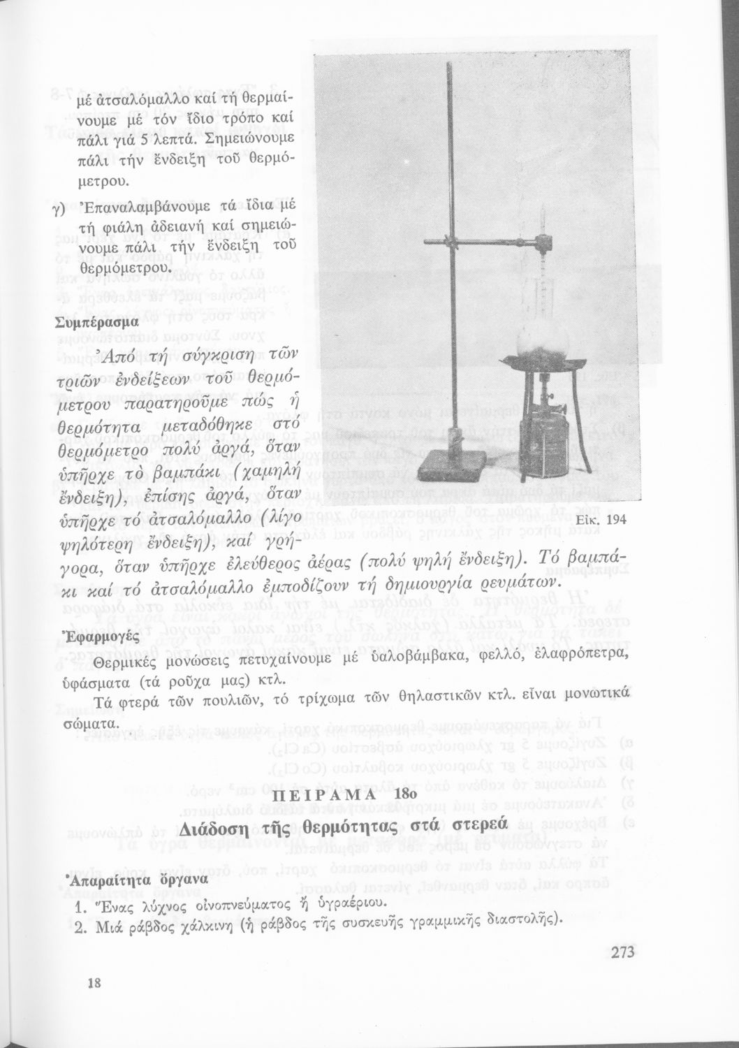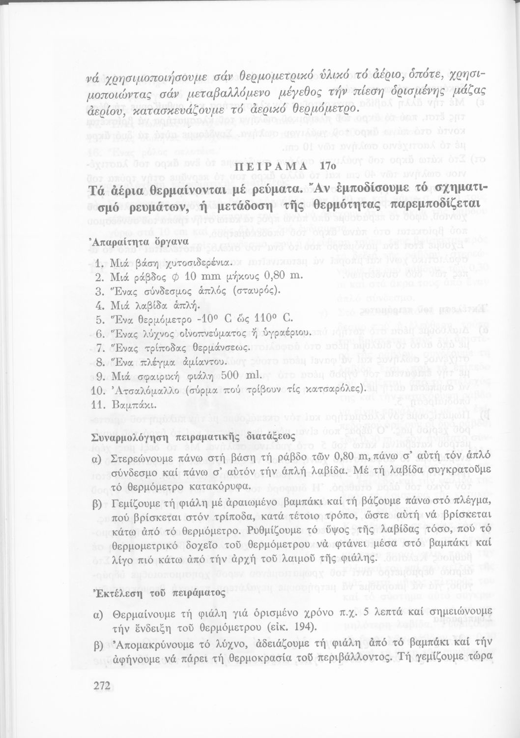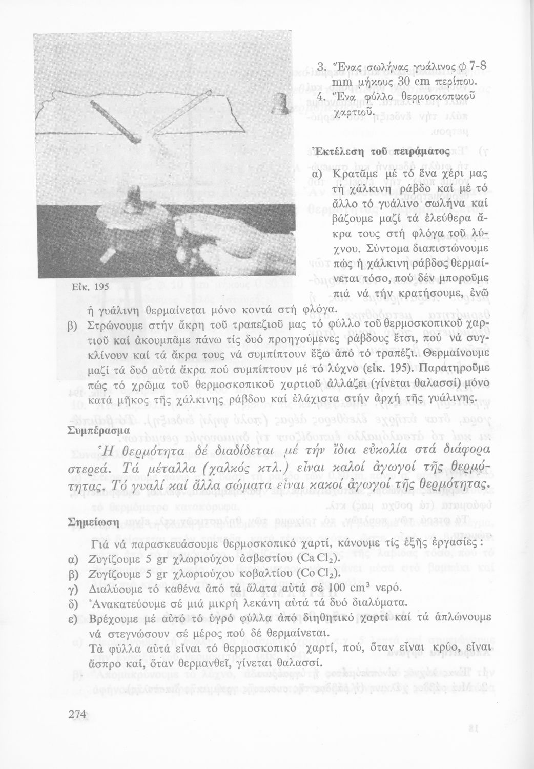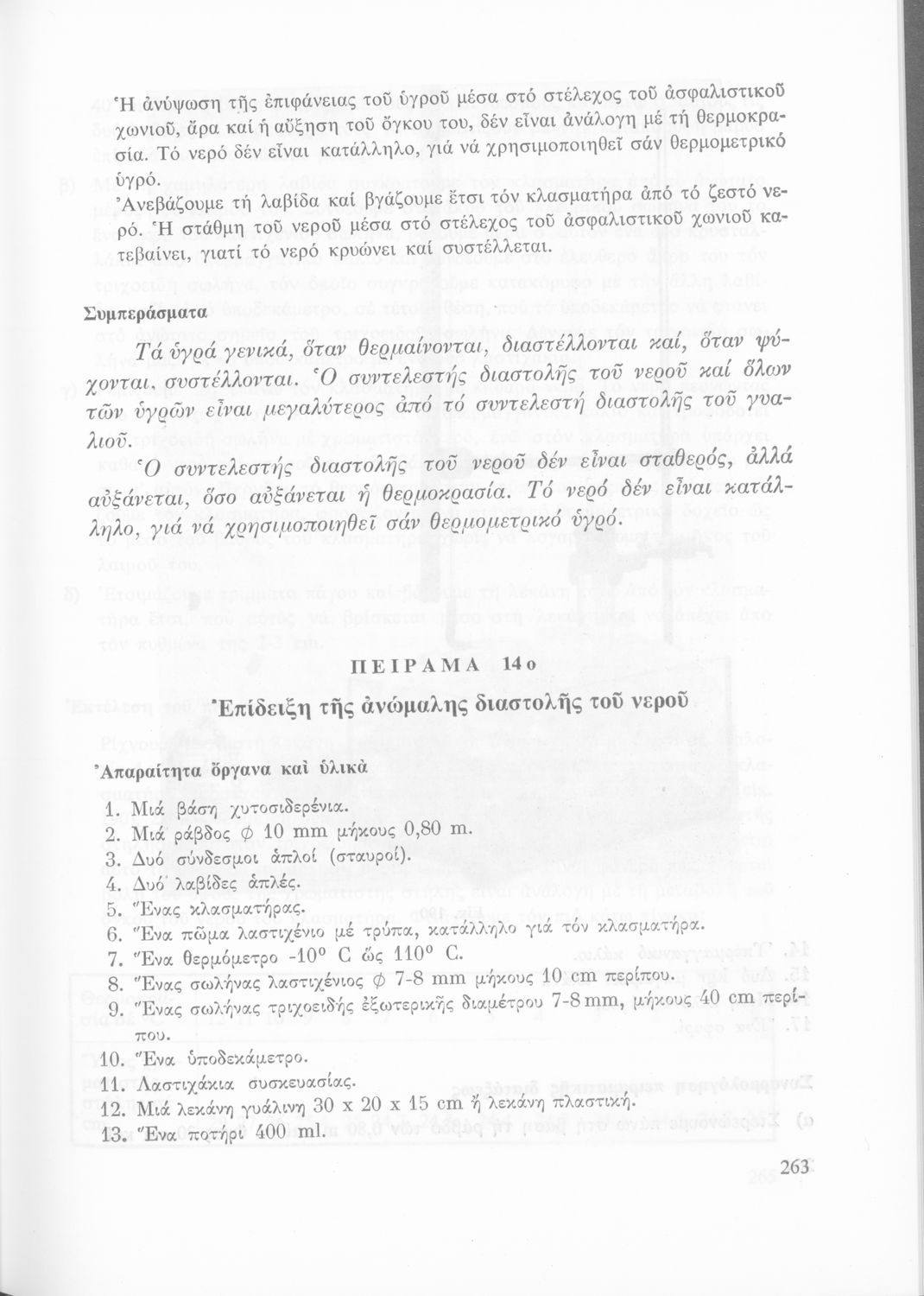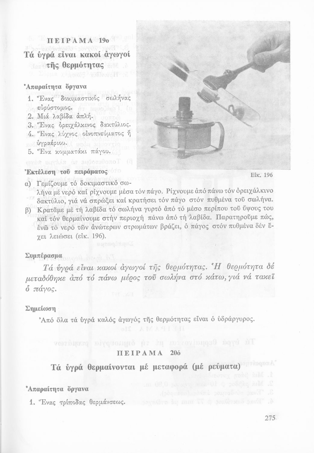 Παρουσίαση περιεχομένου: Σχολικό εγχειρίδιο Φυσικής που περιλαμβάνει πειράματα στον τομέα της μηχανικής και των κινήσεων στερεών και υγρών σωμάτων καθώς και πειράματα που μελετούν την μεταβολή των σωμάτων αυτών στις αλλαγές της θερμοκρασίας.