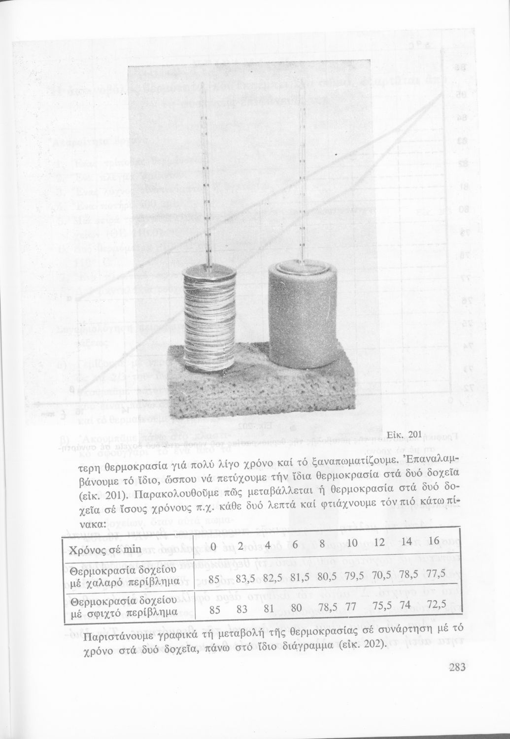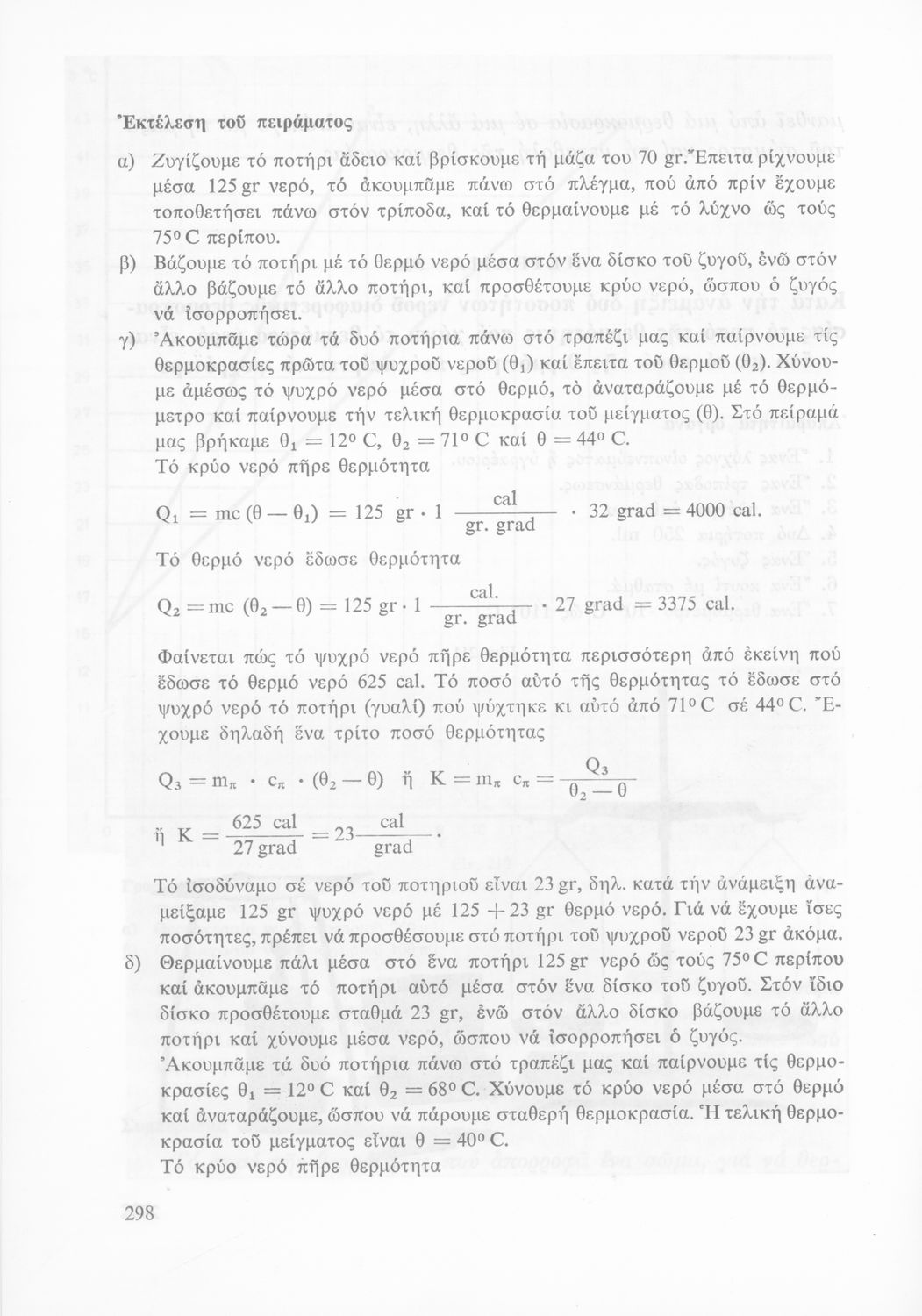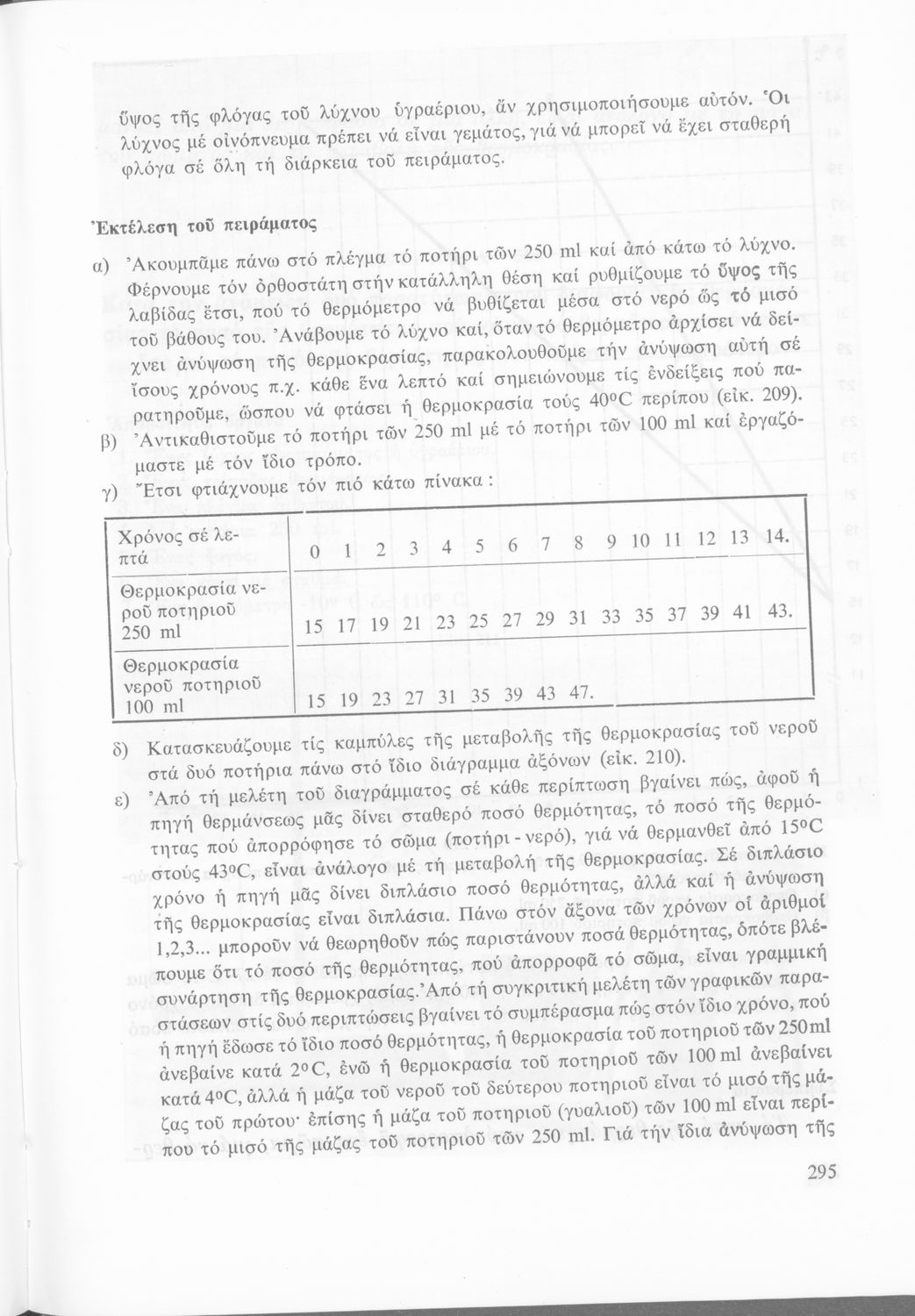 Παρουσίαση περιεχομένου: Σχολικό εγχειρίδιο Φυσικής που περιλαμβάνει πειράματα στον τομέα της μηχανικής και των κινήσεων στερεών και υγρών σωμάτων καθώς και πειράματα που μελετούν την μεταβολή των σωμάτων αυτών στις αλλαγές της θερμοκρασίας.