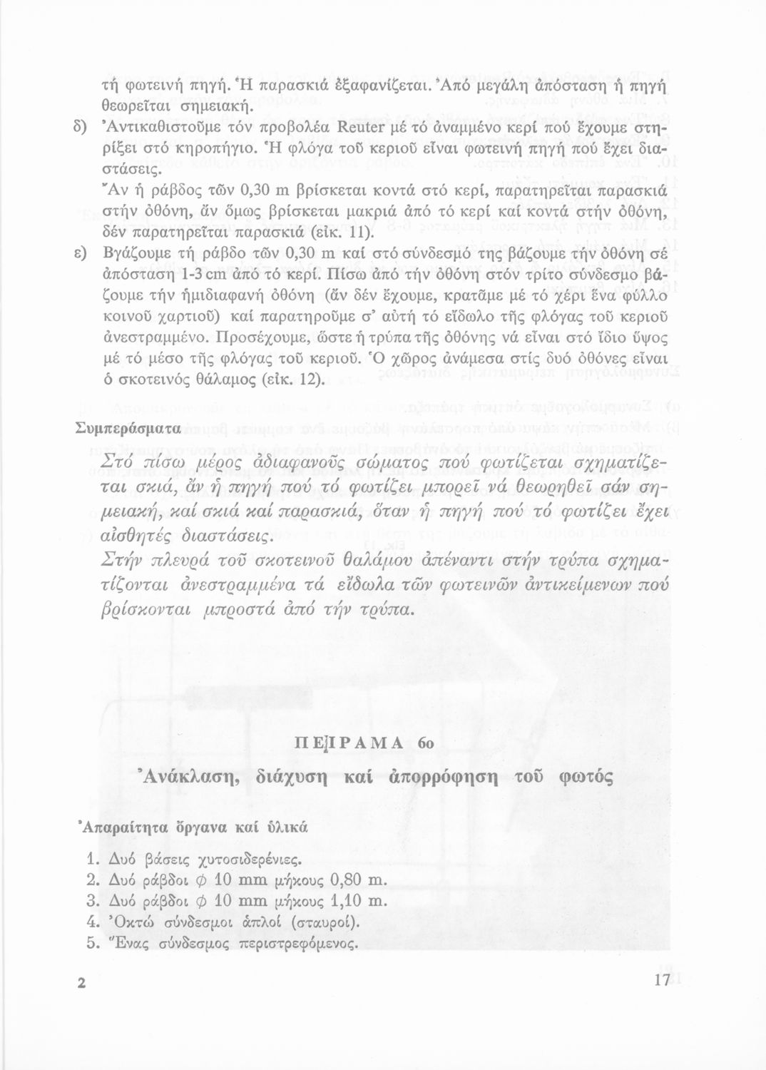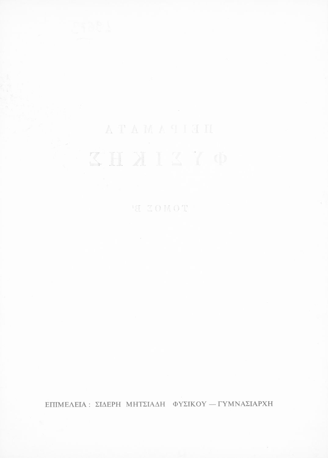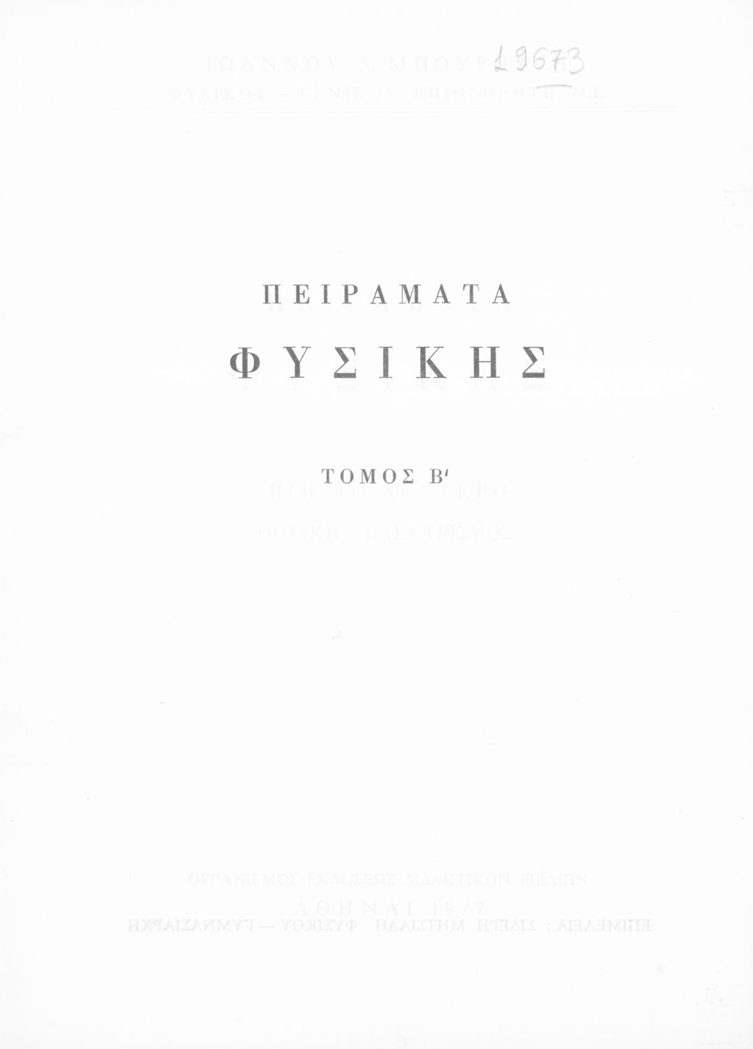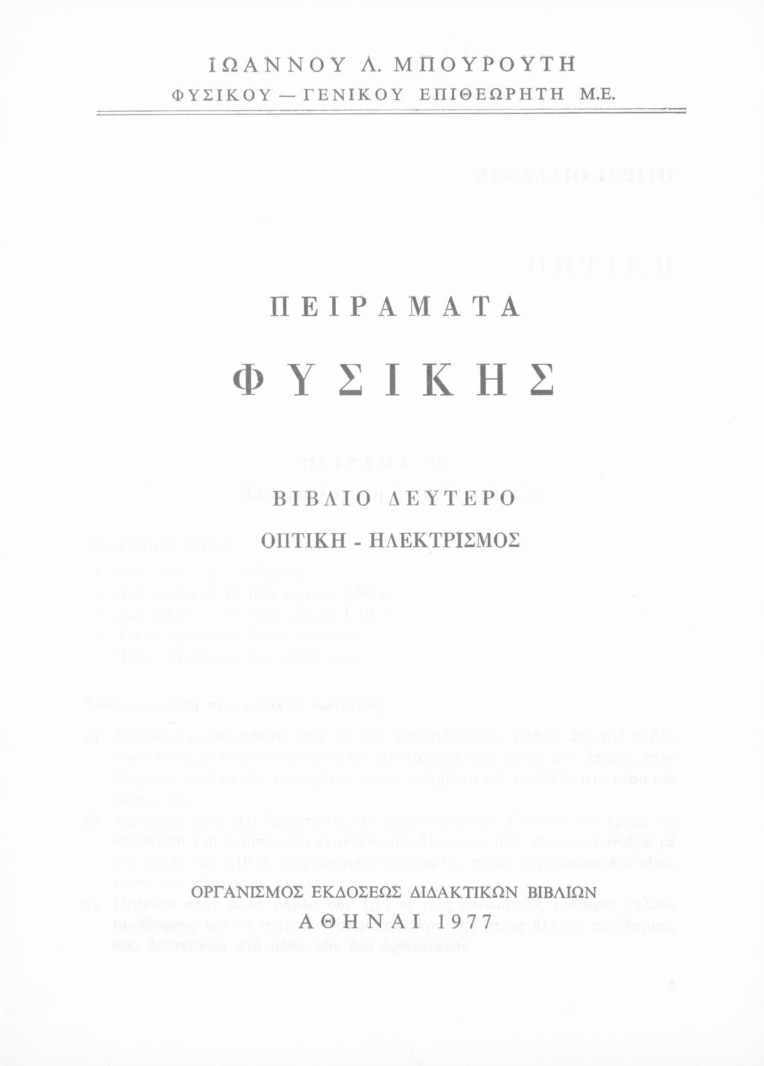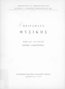 Σχολικό εγχειρίδιο Φυσικής που περιλαμβάνει πειράματα οπτικής, ηλεκτρισμού και μαγνητισμού.