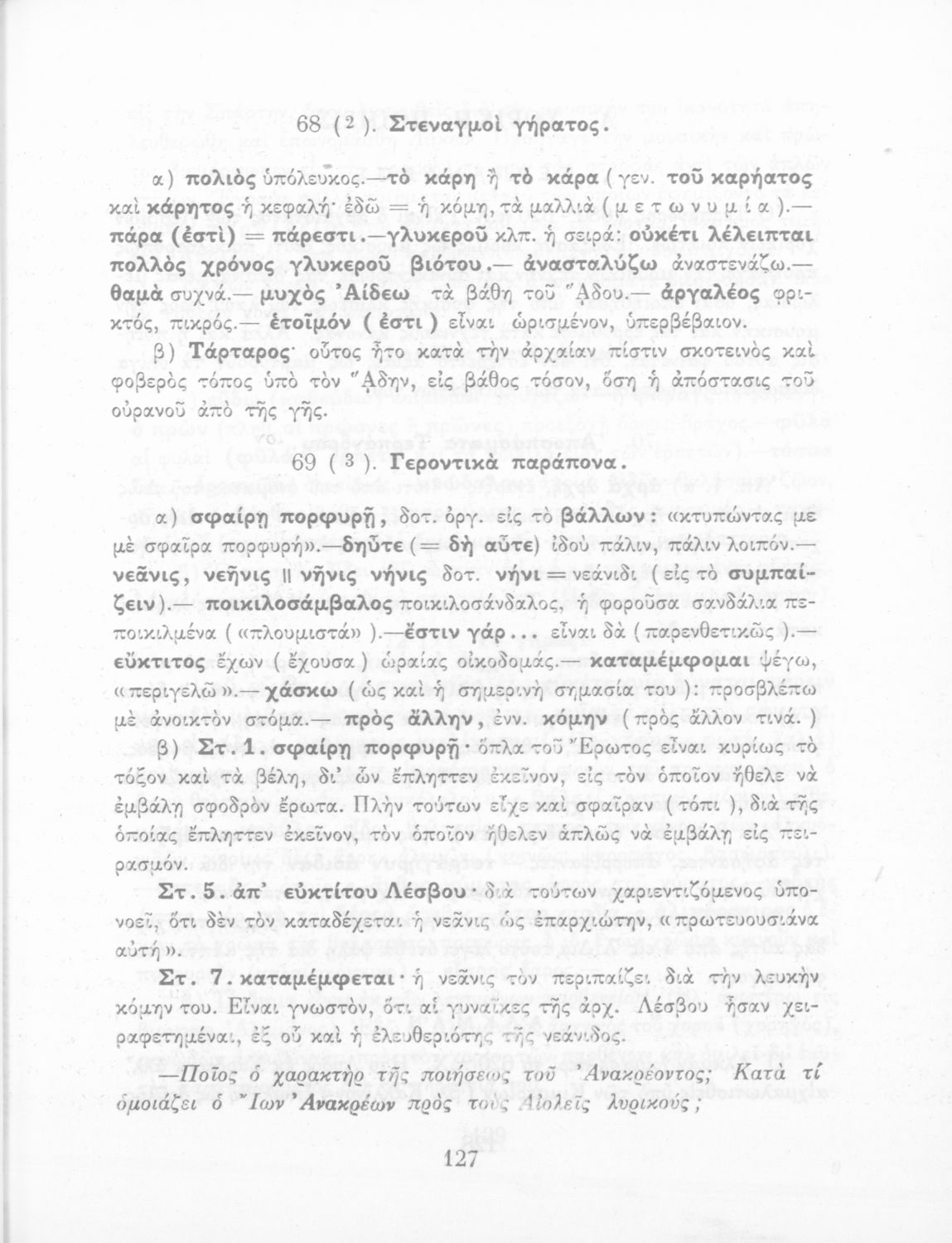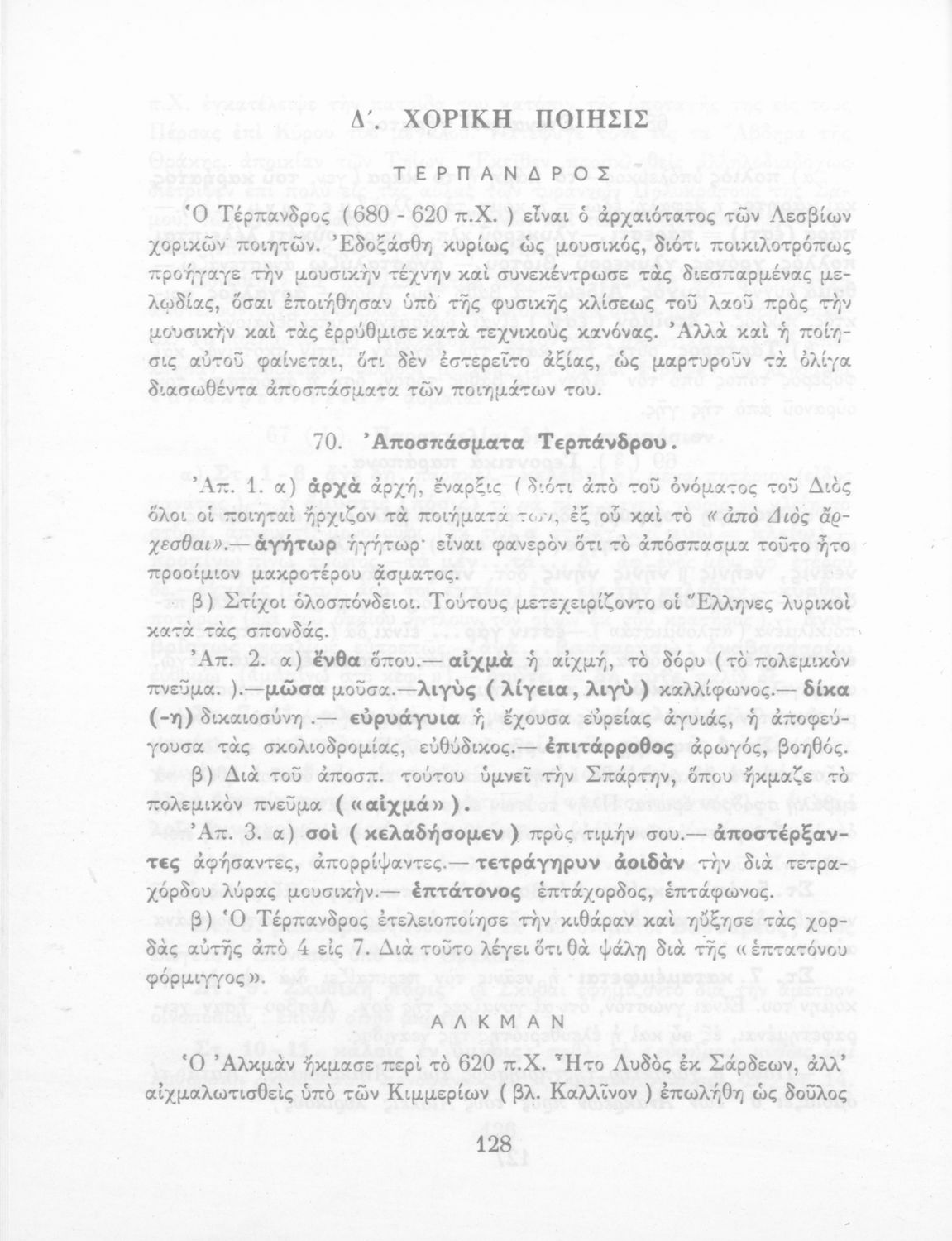 Σχολικό εγχειρίδιο Αρχαίων Ελληνικών που περιέχει αποσπάσματα αρχαίων Ελλήνων λυρικών, εισαγωγή και ερμηνευτικά σχόλια. Κοσμείται από μικρά διακοσμητικά σχέδια.