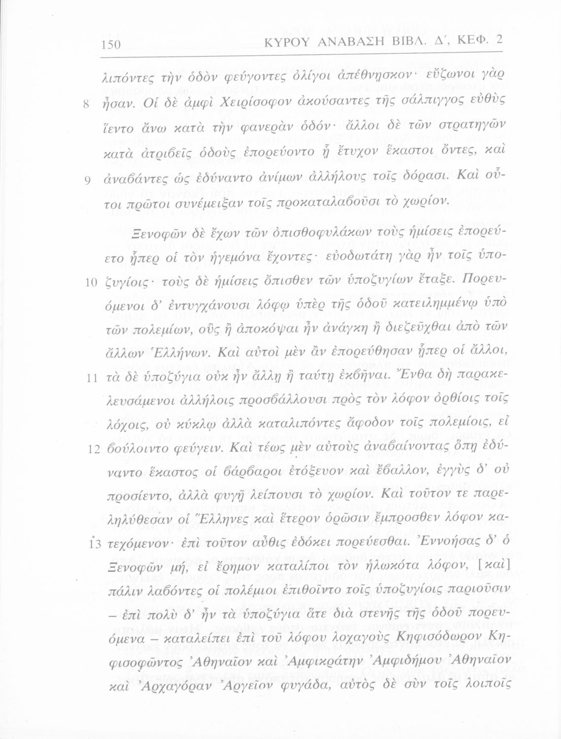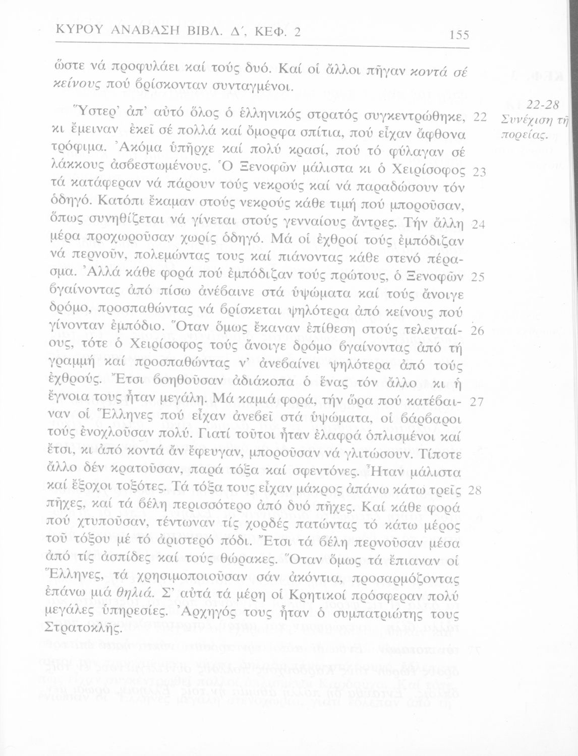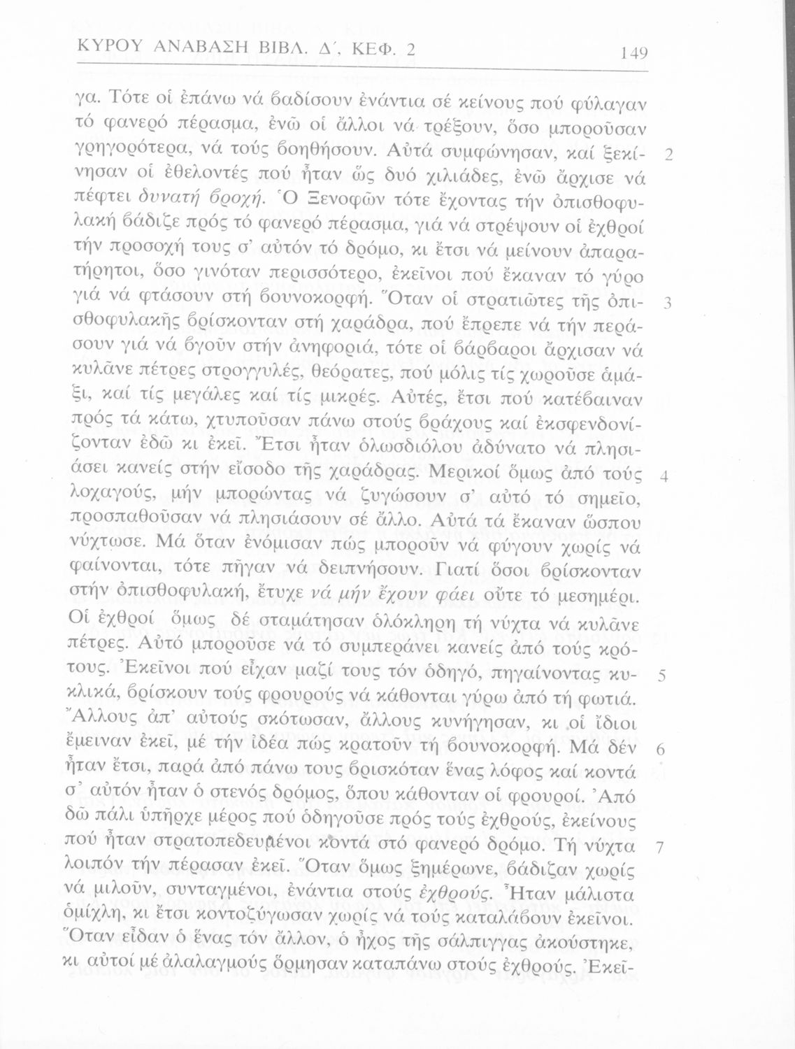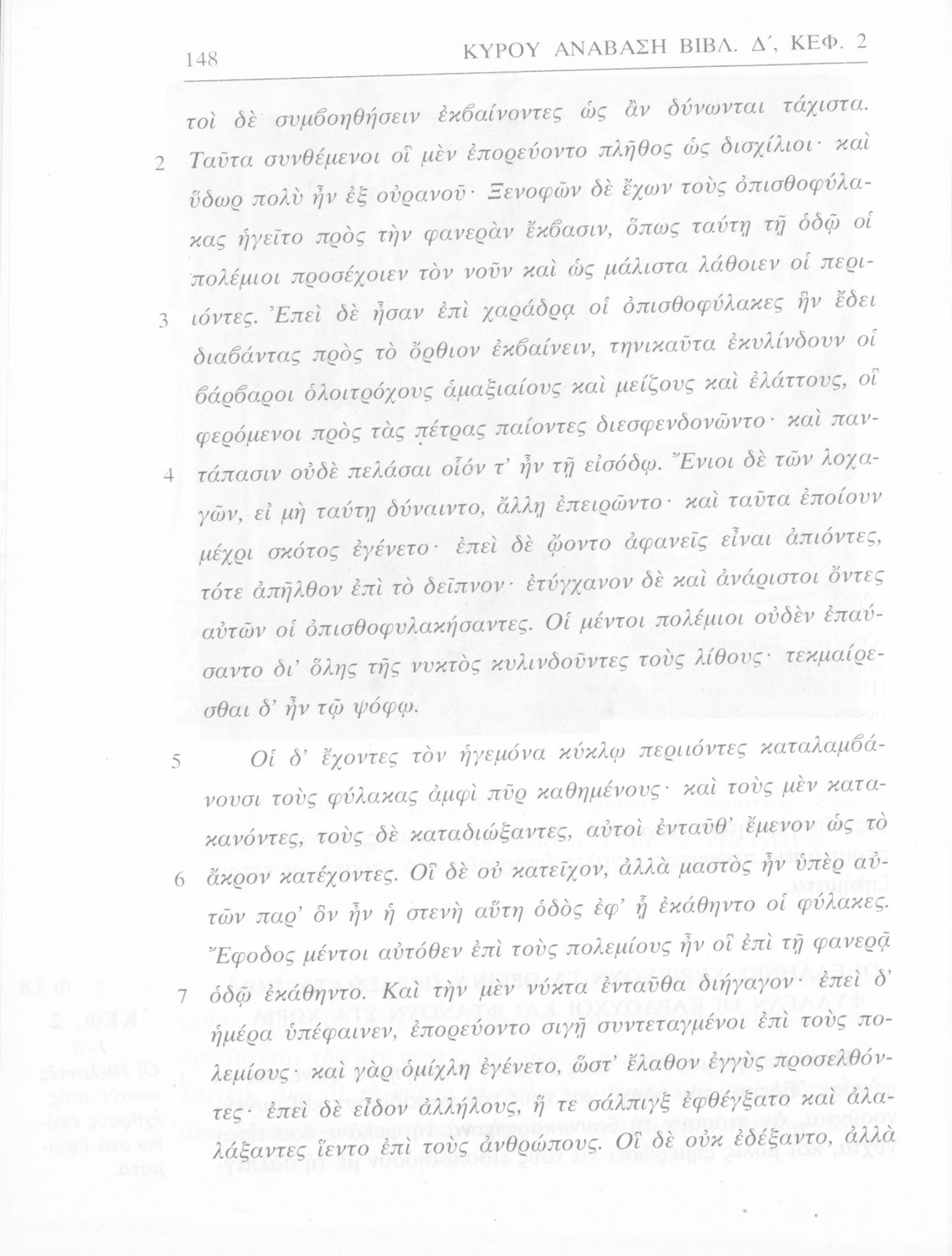 Σχολικό εγχειρίδιο Αρχαίων Ελληνικών. Από τα εφτά μέρη της "Κύρου Ανάβασις" του Ξενοφώντα που περιέχονται στο εγχειρίδιο το Πρώτο και το Έβδομο αναφέρονται περιληπτικά. Στο βιβλίο περιλαμβάνονται εισαγωγικό σημείωμα για τη ζωή και το έργο του Ξενοφώντα, σημειώσεις πάνω στα κείμενα ενώ διανθίζεται από εικόνες, χάρτες και διαγράμματα.