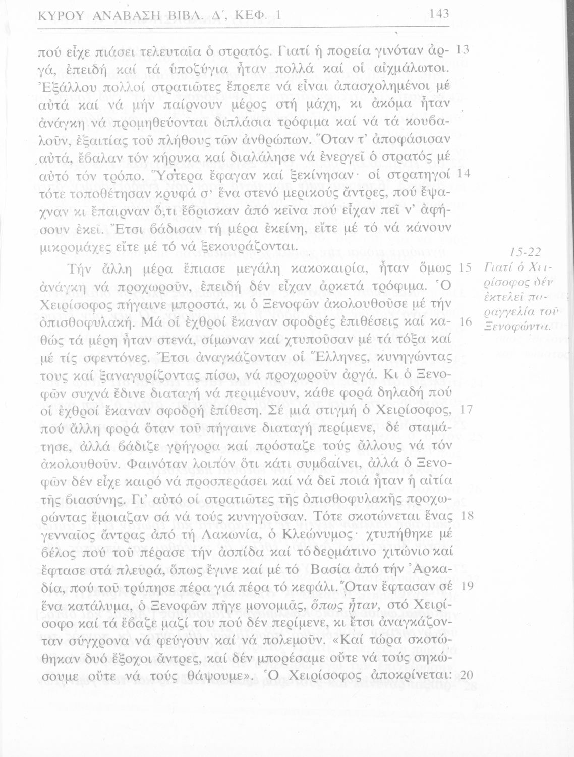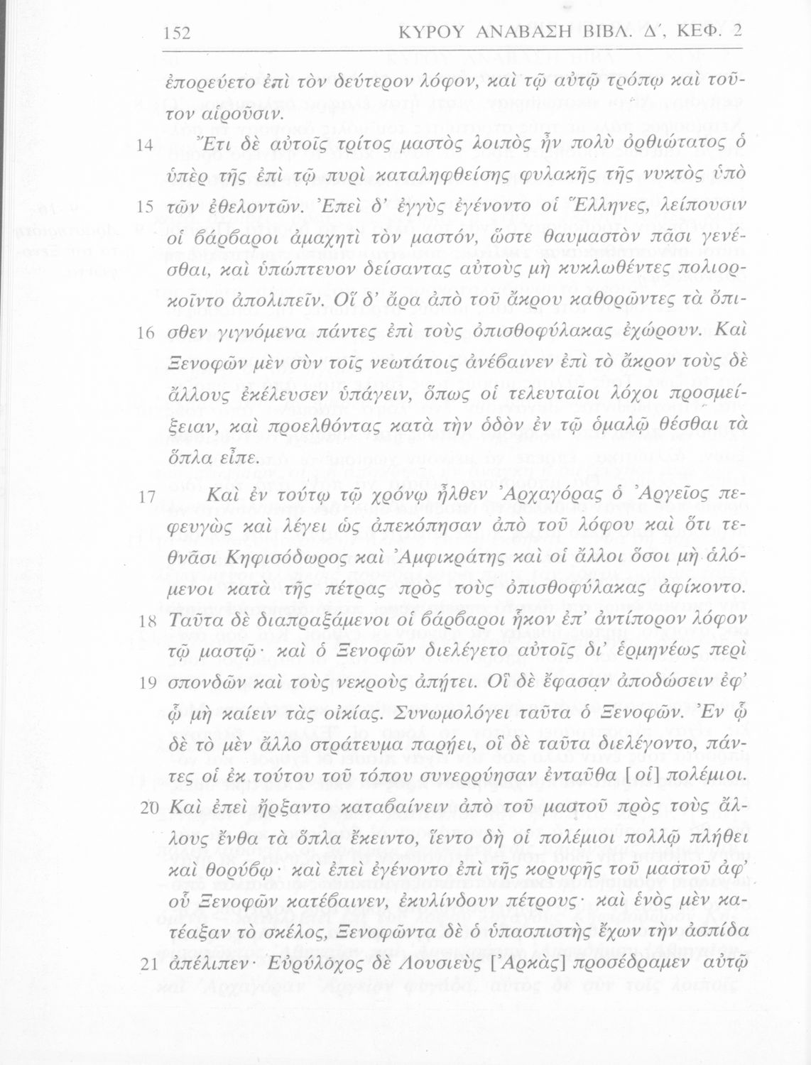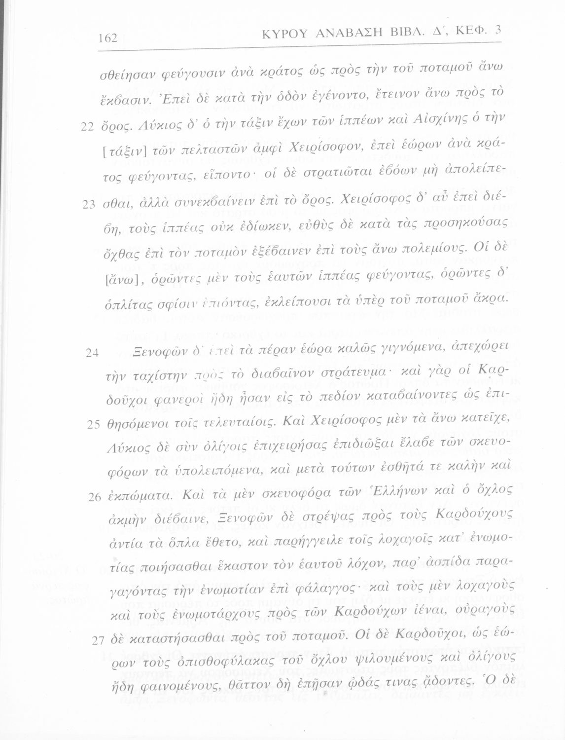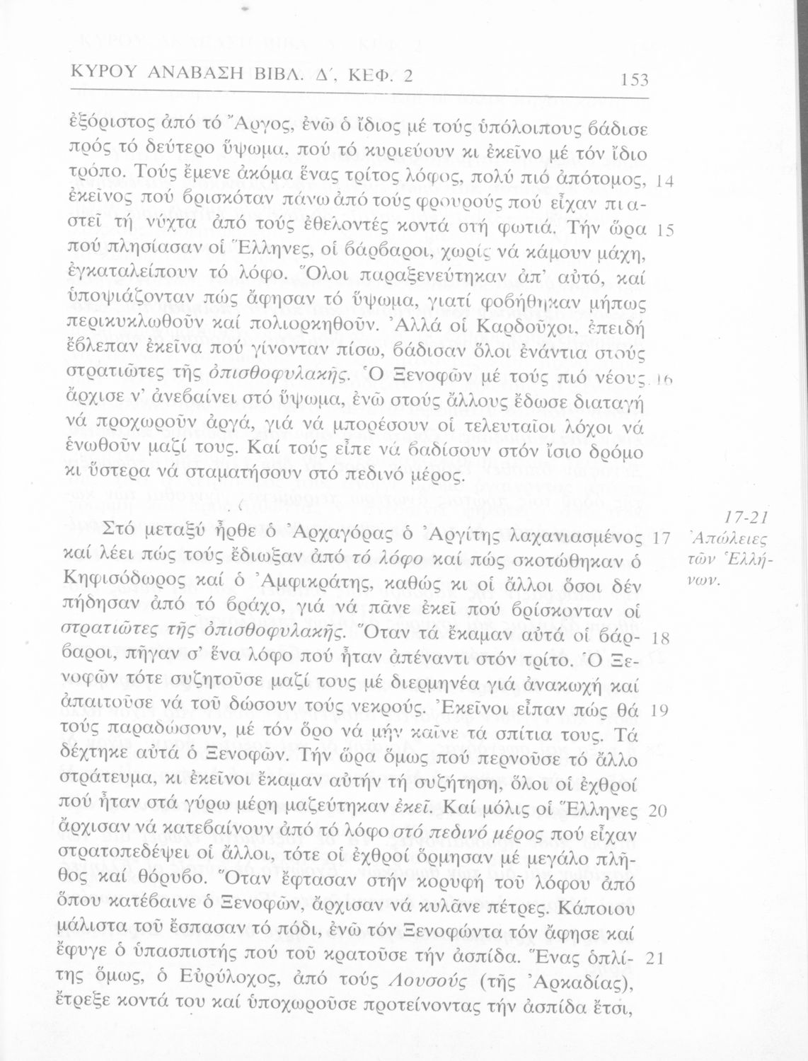 Σχολικό εγχειρίδιο Αρχαίων Ελληνικών. Από τα εφτά μέρη της "Κύρου Ανάβασις" του Ξενοφώντα που περιέχονται στο εγχειρίδιο το Πρώτο και το Έβδομο αναφέρονται περιληπτικά. Στο βιβλίο περιλαμβάνονται εισαγωγικό σημείωμα για τη ζωή και το έργο του Ξενοφώντα, σημειώσεις πάνω στα κείμενα ενώ διανθίζεται από εικόνες, χάρτες και διαγράμματα.