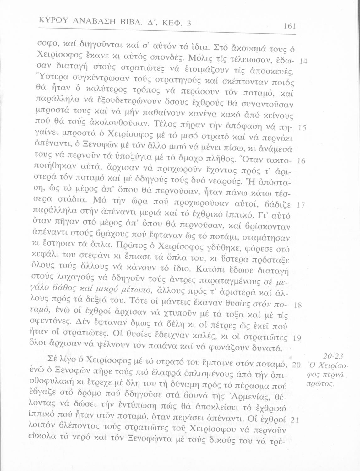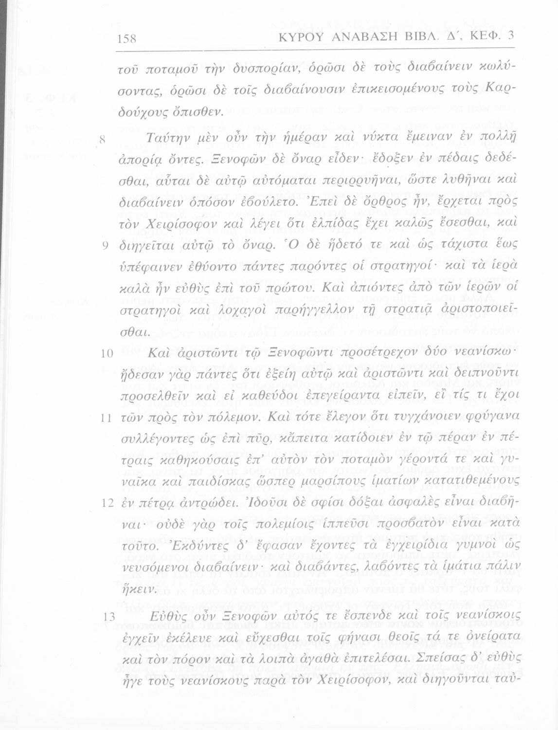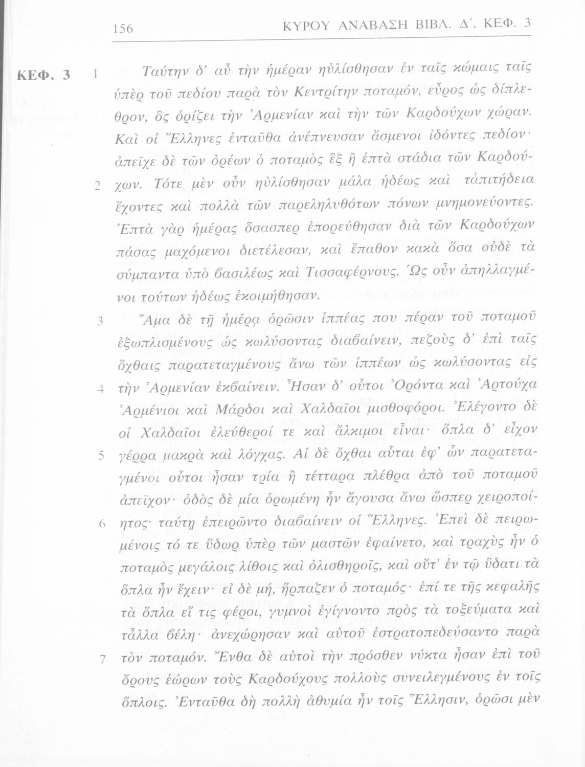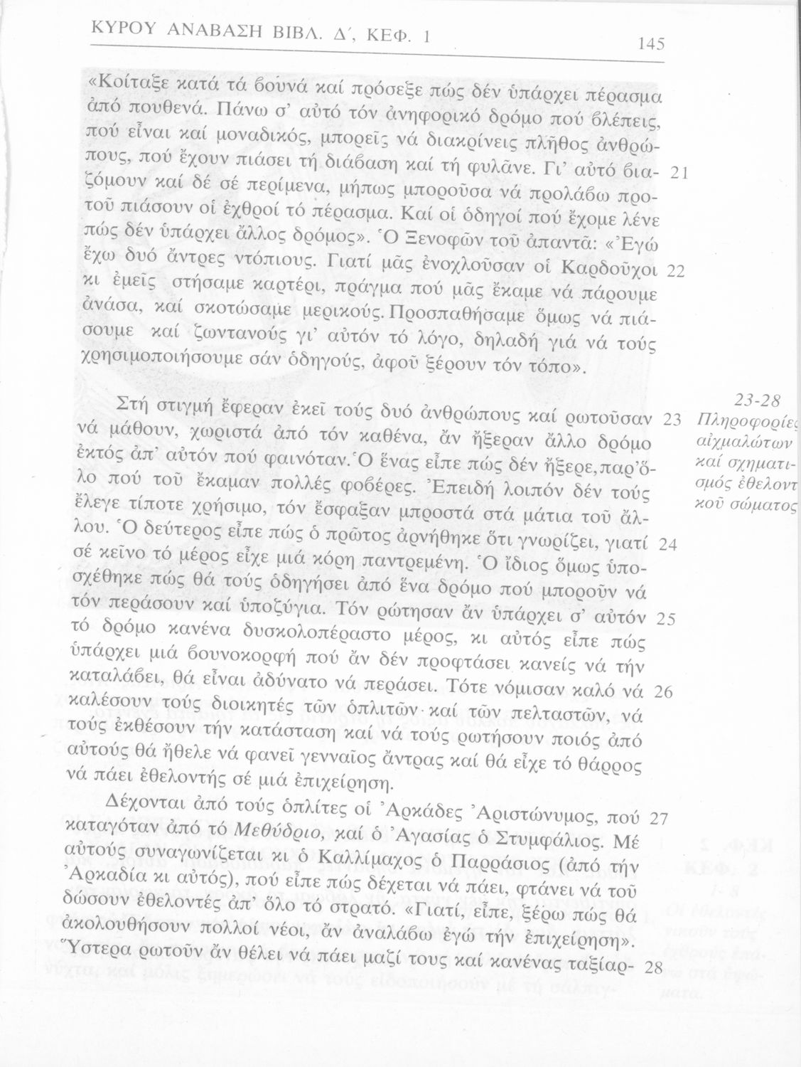Σχολικό εγχειρίδιο Αρχαίων Ελληνικών. Από τα εφτά μέρη της "Κύρου Ανάβασις" του Ξενοφώντα που περιέχονται στο εγχειρίδιο το Πρώτο και το Έβδομο αναφέρονται περιληπτικά. Στο βιβλίο περιλαμβάνονται εισαγωγικό σημείωμα για τη ζωή και το έργο του Ξενοφώντα, σημειώσεις πάνω στα κείμενα ενώ διανθίζεται από εικόνες, χάρτες και διαγράμματα.