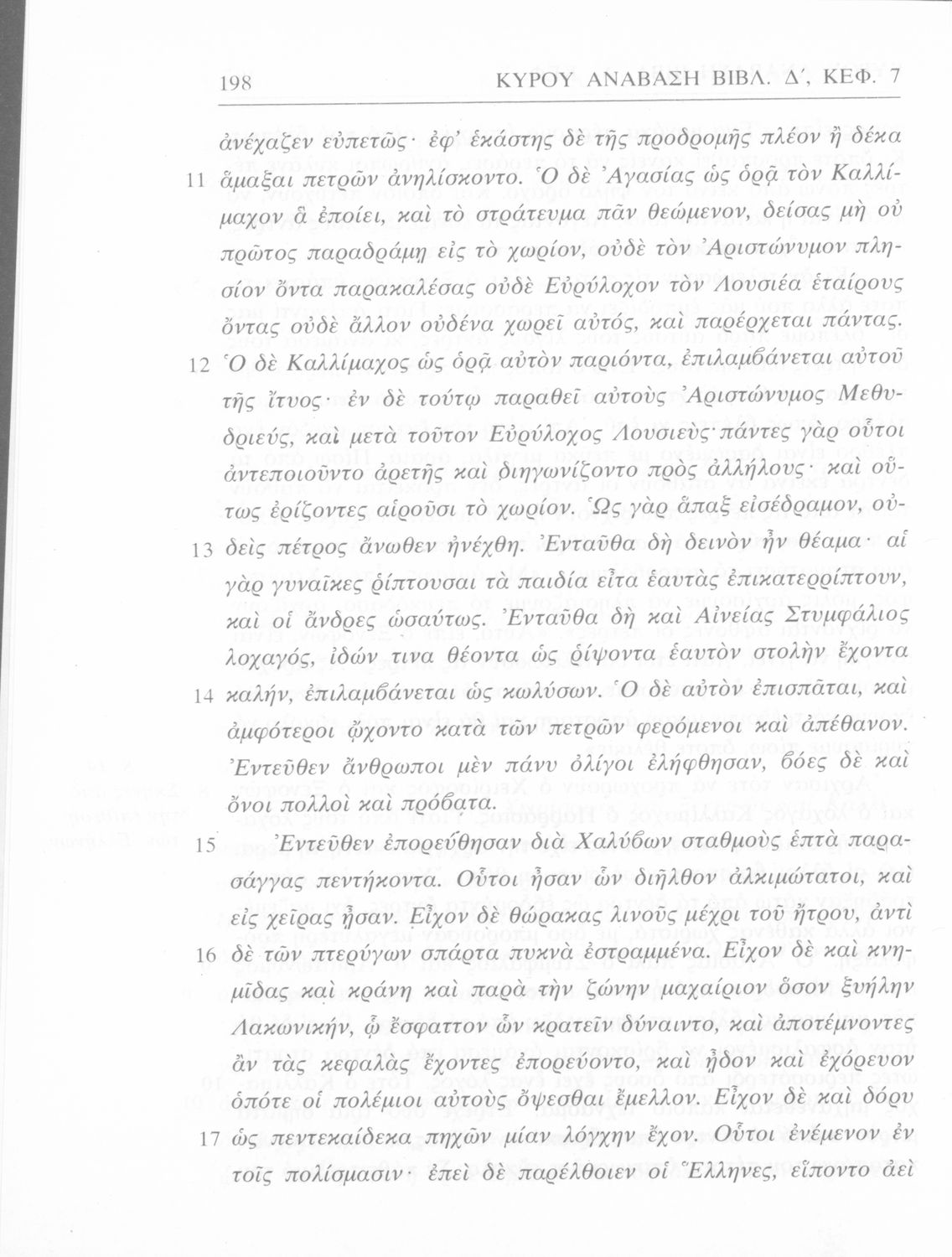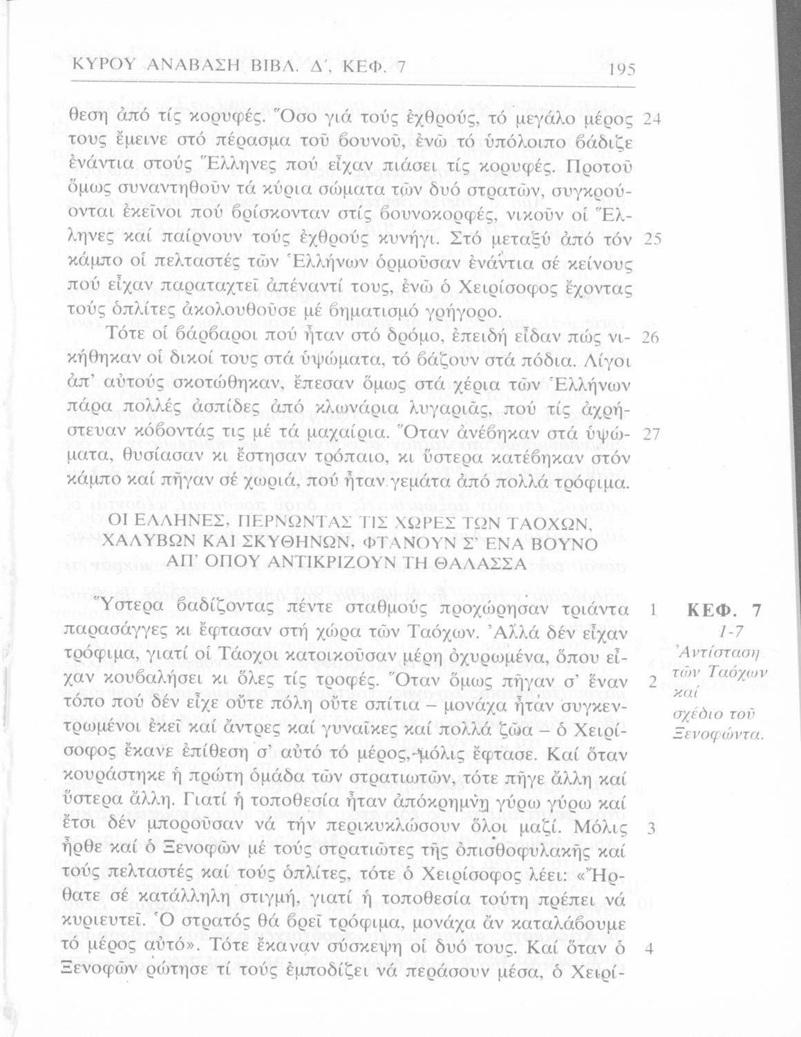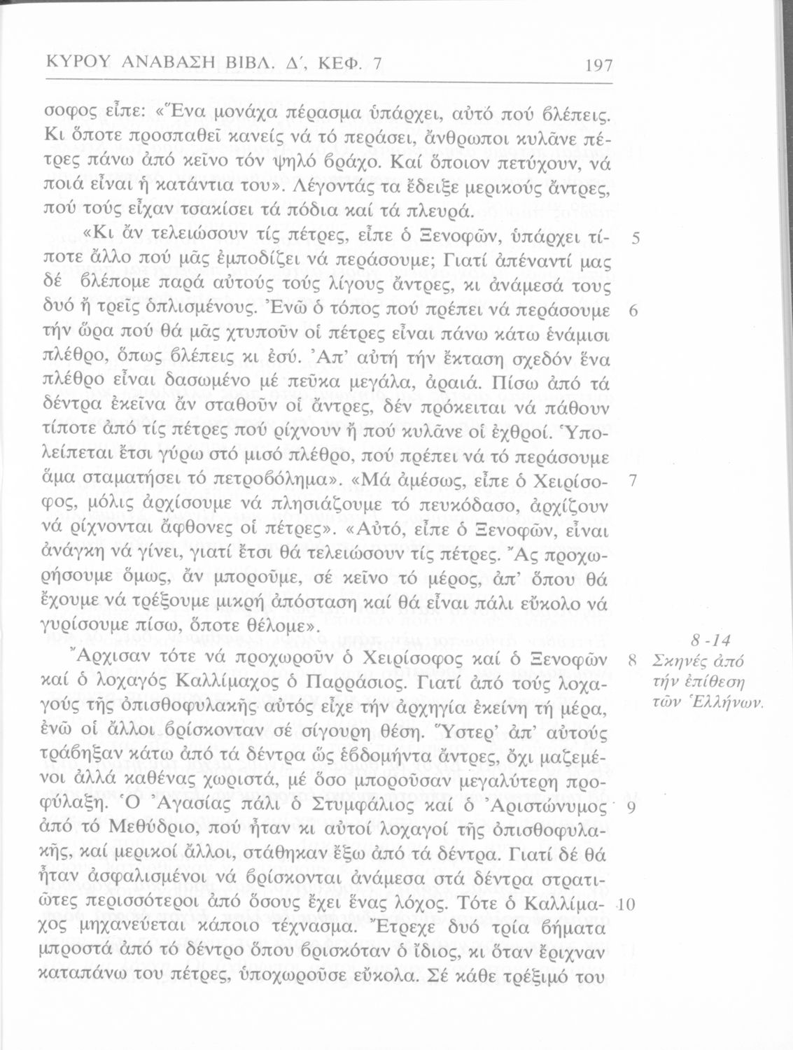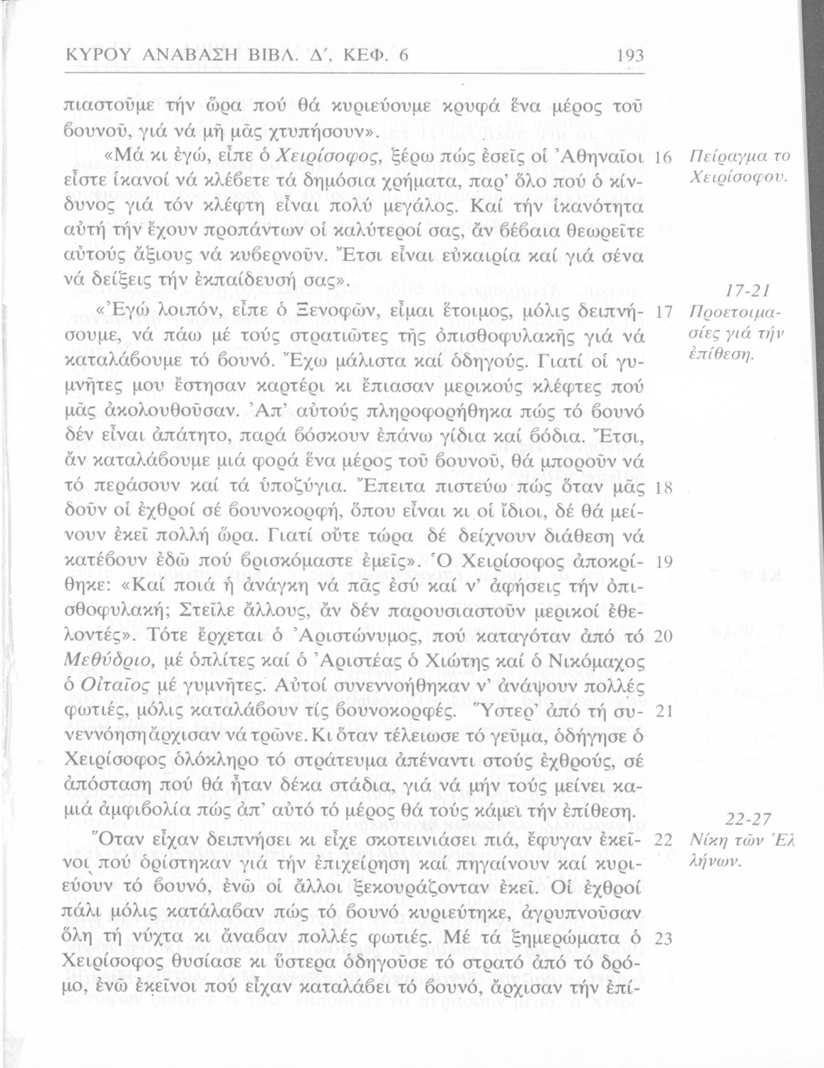 Σχολικό εγχειρίδιο Αρχαίων Ελληνικών. Από τα εφτά μέρη της "Κύρου Ανάβασις" του Ξενοφώντα που περιέχονται στο εγχειρίδιο το Πρώτο και το Έβδομο αναφέρονται περιληπτικά. Στο βιβλίο περιλαμβάνονται εισαγωγικό σημείωμα για τη ζωή και το έργο του Ξενοφώντα, σημειώσεις πάνω στα κείμενα ενώ διανθίζεται από εικόνες, χάρτες και διαγράμματα.