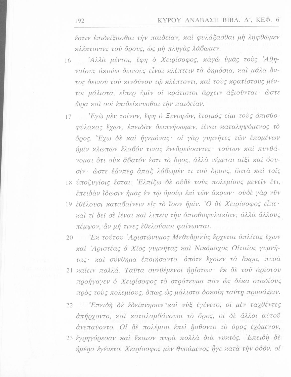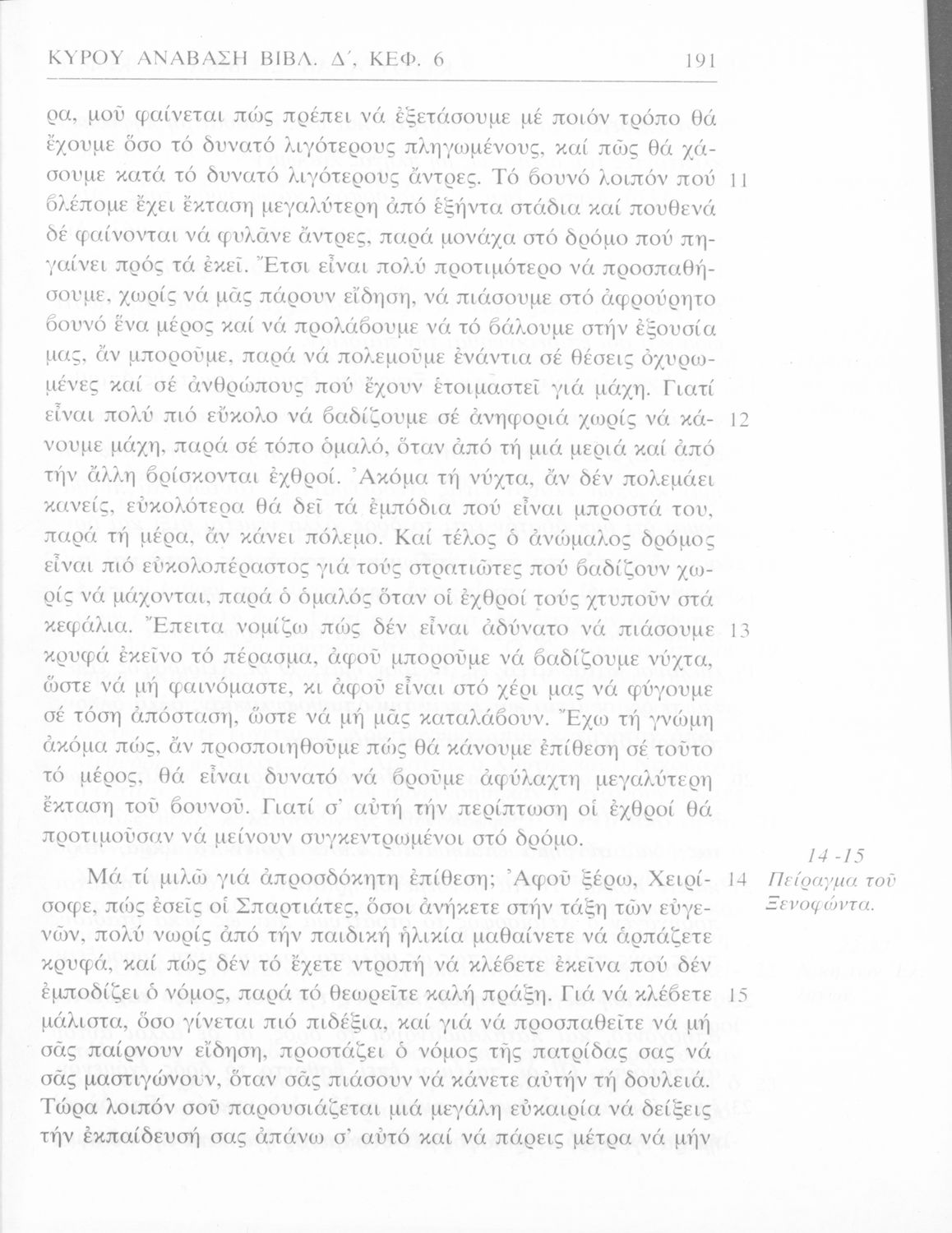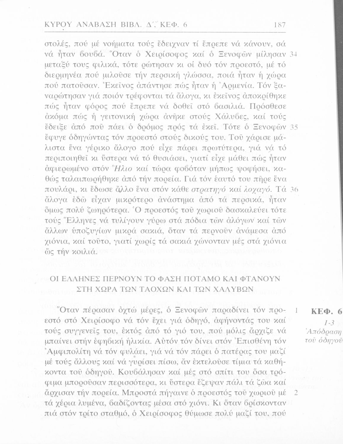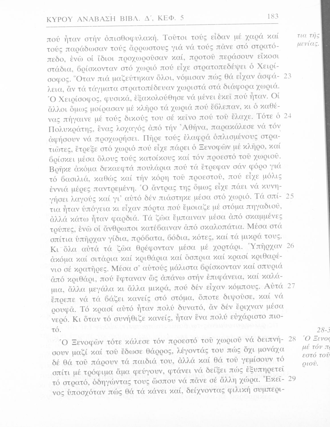 Σχολικό εγχειρίδιο Αρχαίων Ελληνικών. Από τα εφτά μέρη της "Κύρου Ανάβασις" του Ξενοφώντα που περιέχονται στο εγχειρίδιο το Πρώτο και το Έβδομο αναφέρονται περιληπτικά. Στο βιβλίο περιλαμβάνονται εισαγωγικό σημείωμα για τη ζωή και το έργο του Ξενοφώντα, σημειώσεις πάνω στα κείμενα ενώ διανθίζεται από εικόνες, χάρτες και διαγράμματα.
