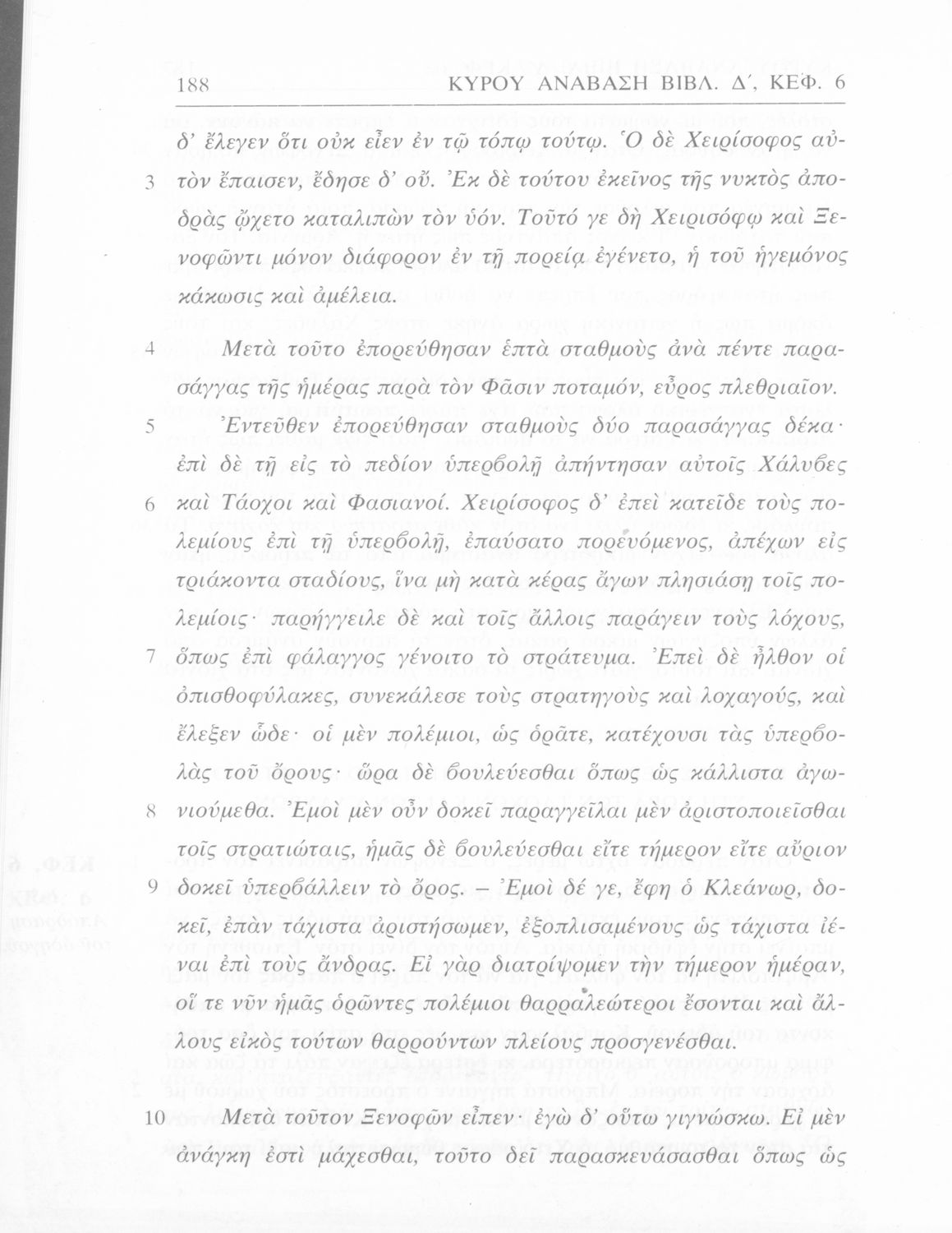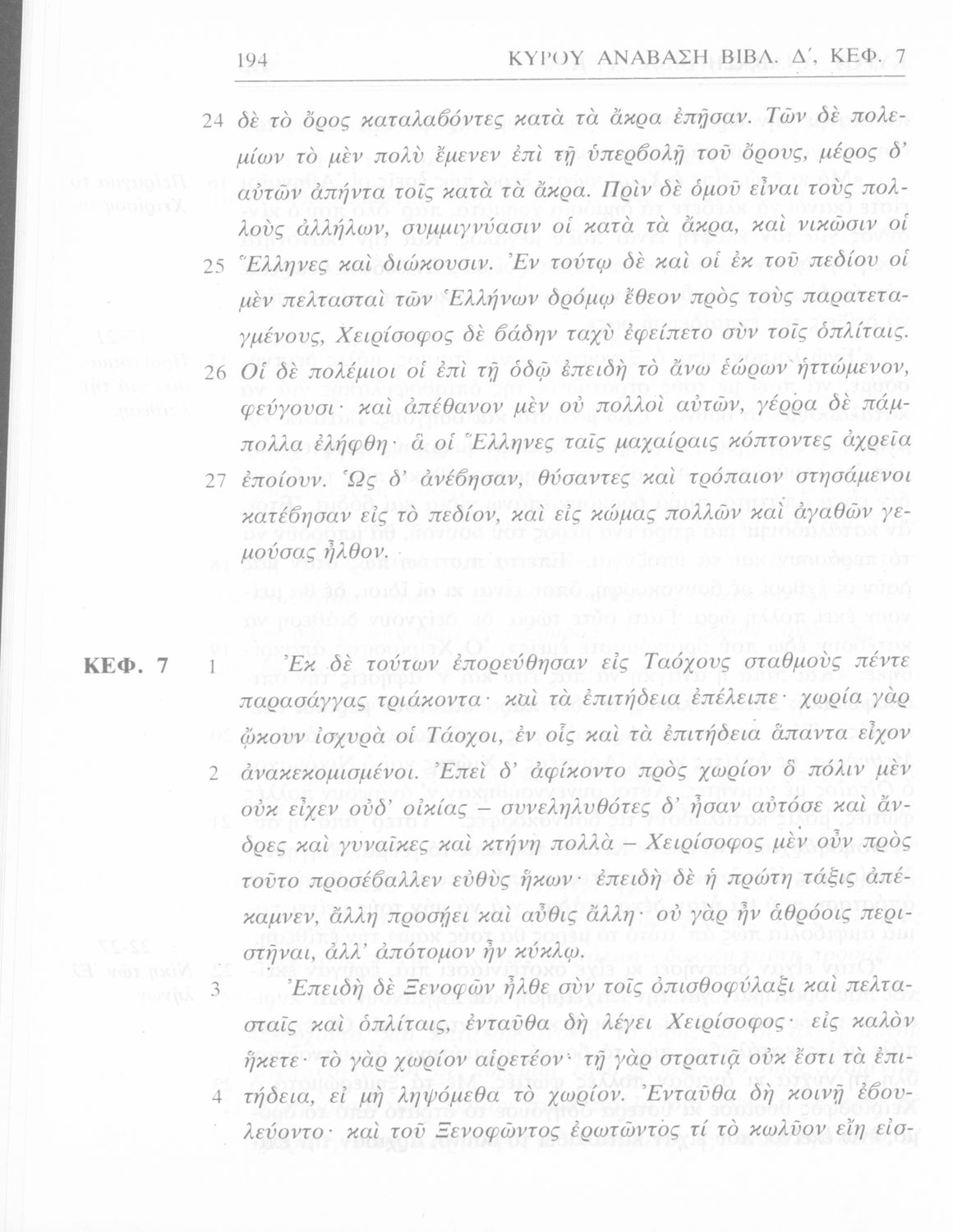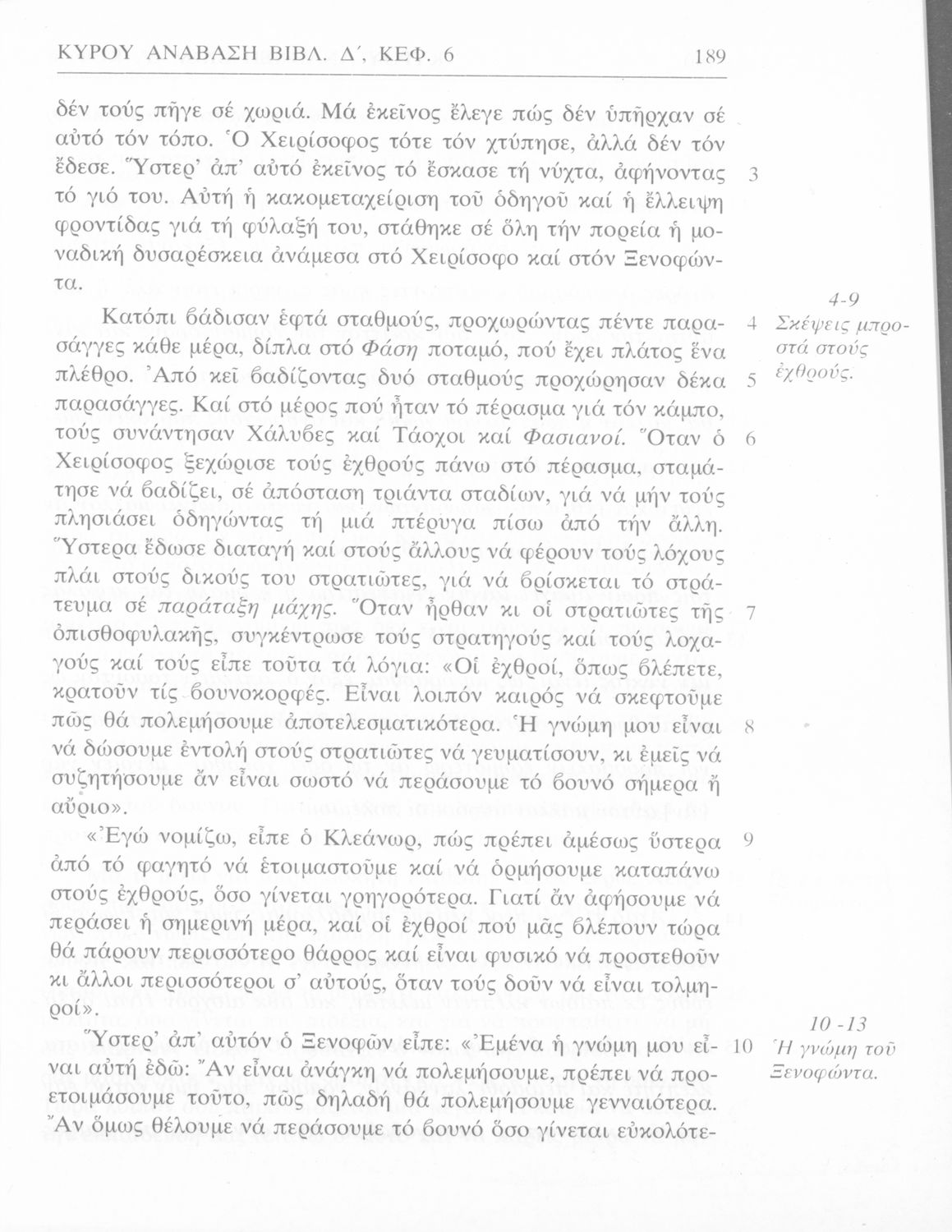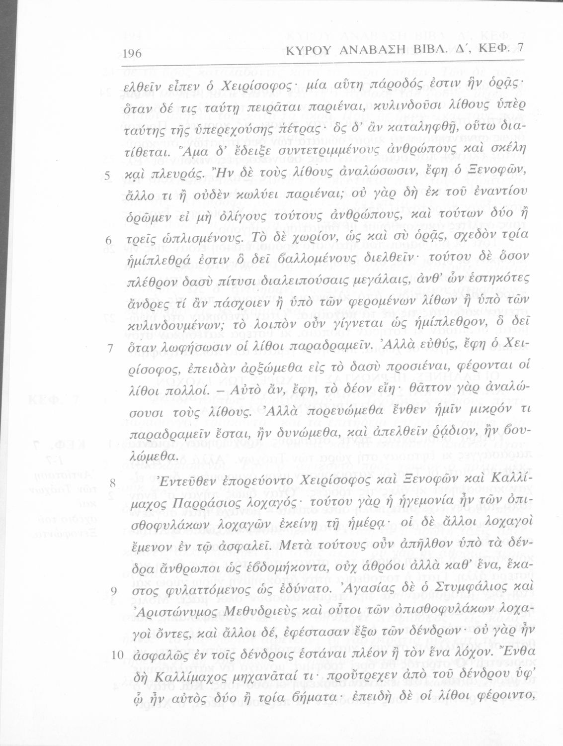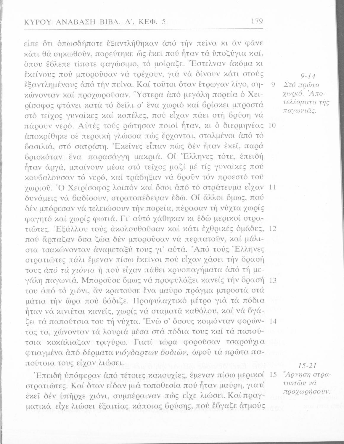 Σχολικό εγχειρίδιο Αρχαίων Ελληνικών. Από τα εφτά μέρη της "Κύρου Ανάβασις" του Ξενοφώντα που περιέχονται στο εγχειρίδιο το Πρώτο και το Έβδομο αναφέρονται περιληπτικά. Στο βιβλίο περιλαμβάνονται εισαγωγικό σημείωμα για τη ζωή και το έργο του Ξενοφώντα, σημειώσεις πάνω στα κείμενα ενώ διανθίζεται από εικόνες, χάρτες και διαγράμματα.