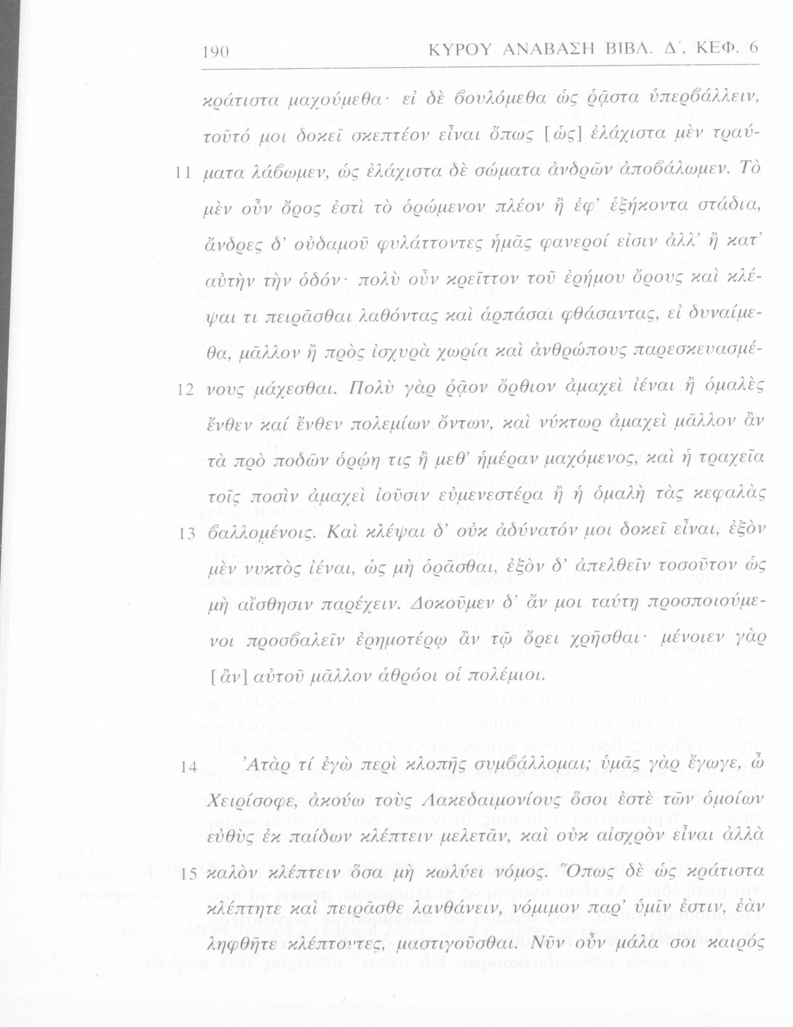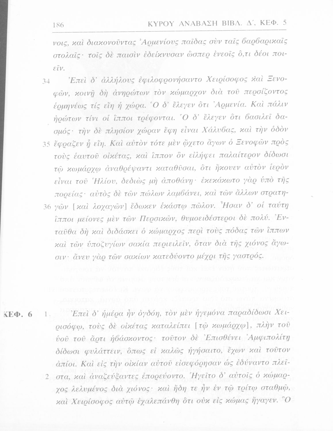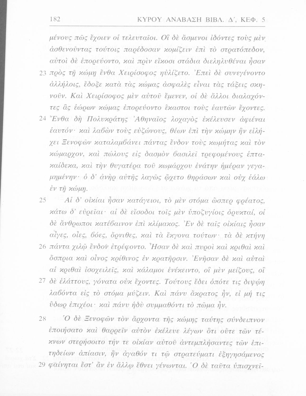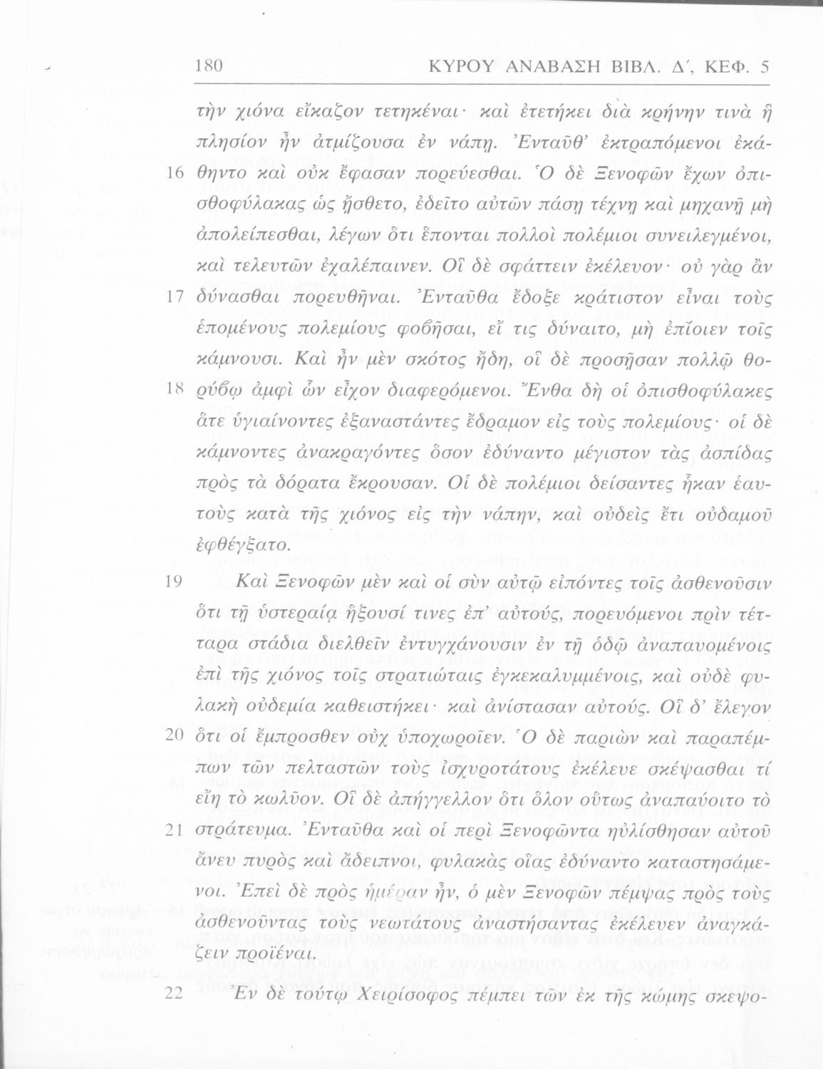Σχολικό εγχειρίδιο Αρχαίων Ελληνικών. Από τα εφτά μέρη της "Κύρου Ανάβασις" του Ξενοφώντα που περιέχονται στο εγχειρίδιο το Πρώτο και το Έβδομο αναφέρονται περιληπτικά. Στο βιβλίο περιλαμβάνονται εισαγωγικό σημείωμα για τη ζωή και το έργο του Ξενοφώντα, σημειώσεις πάνω στα κείμενα ενώ διανθίζεται από εικόνες, χάρτες και διαγράμματα.