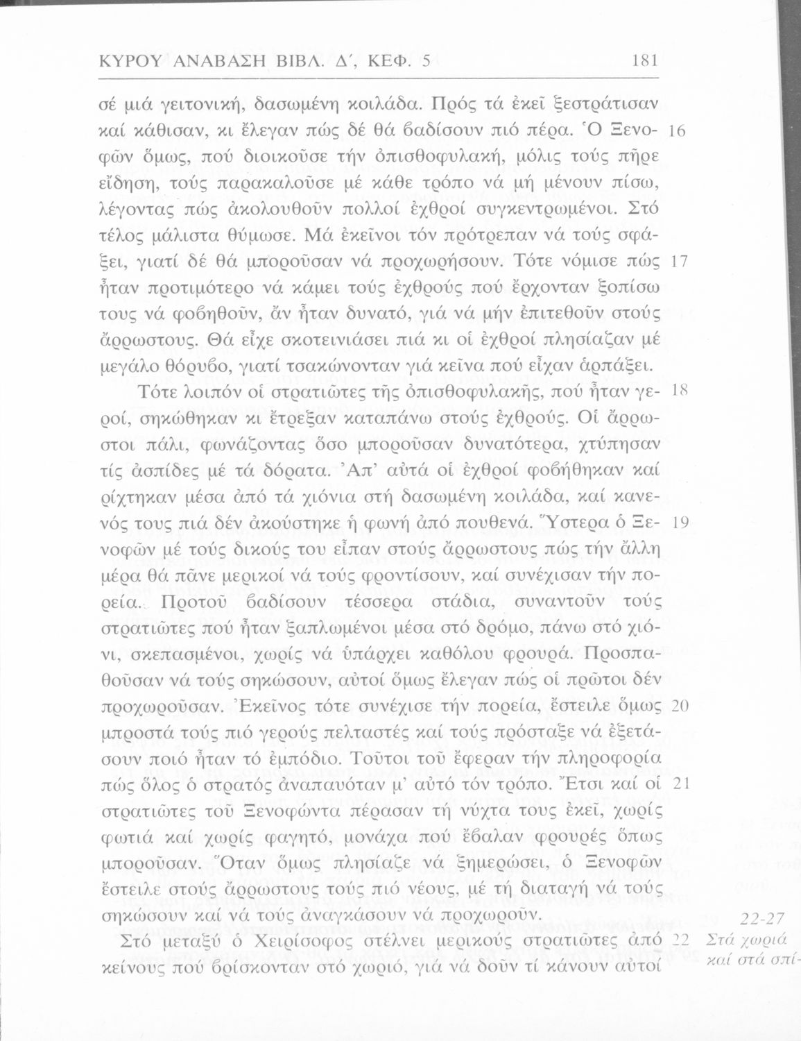 Σχολικό εγχειρίδιο Αρχαίων Ελληνικών α΄ Γυμνασίου που περιλαμβάνει μετάφραση του έργου του Ξενοφώντα Κύρου Ανάβασις, εισαγωγικά σχόλια για τη ζωή και το έργο του, και ερμηνευτικές παρατηρήσεις.