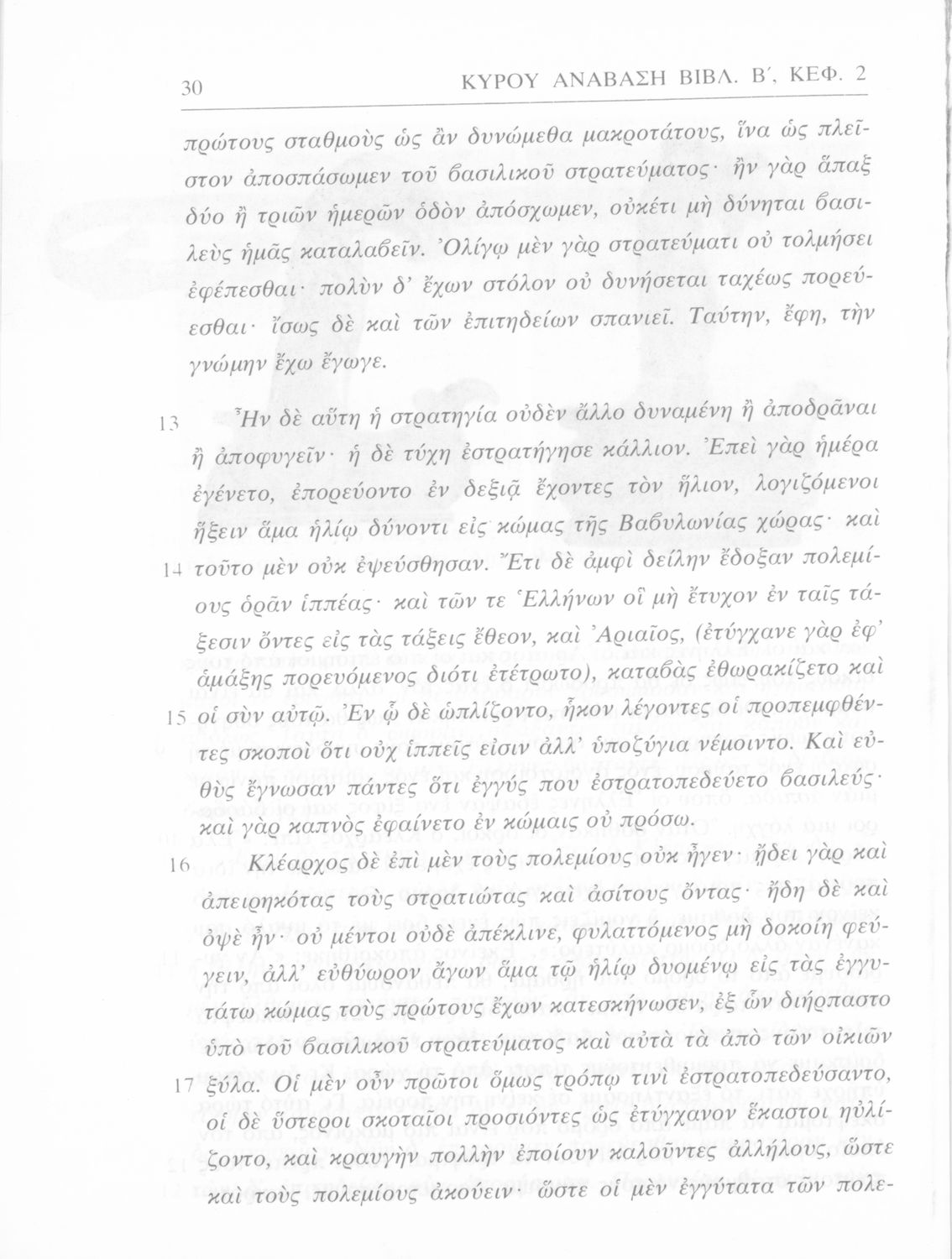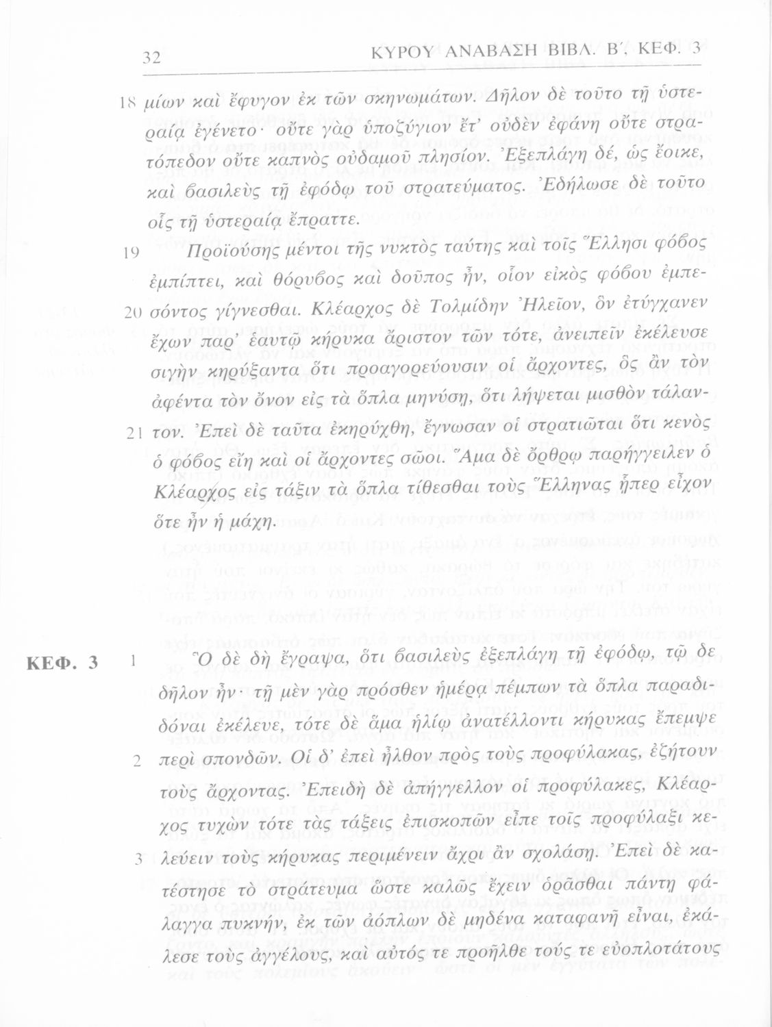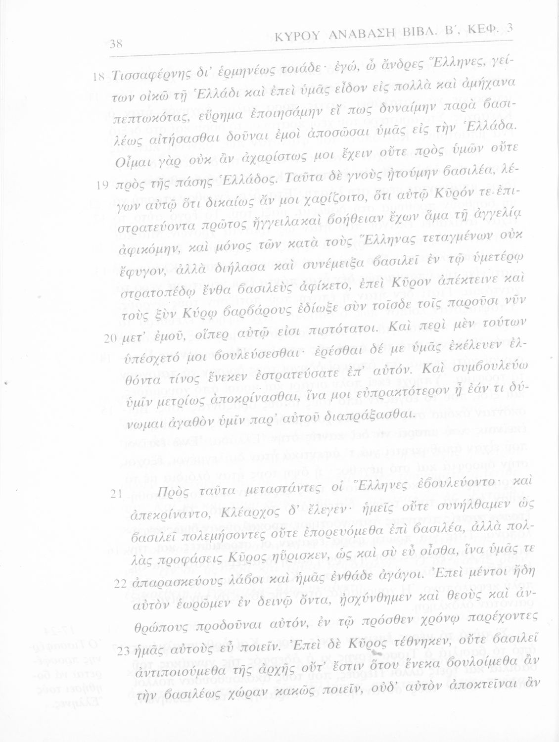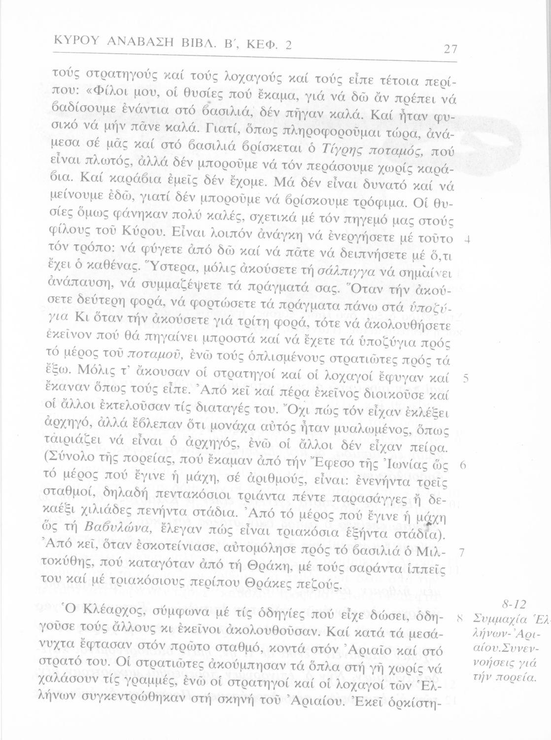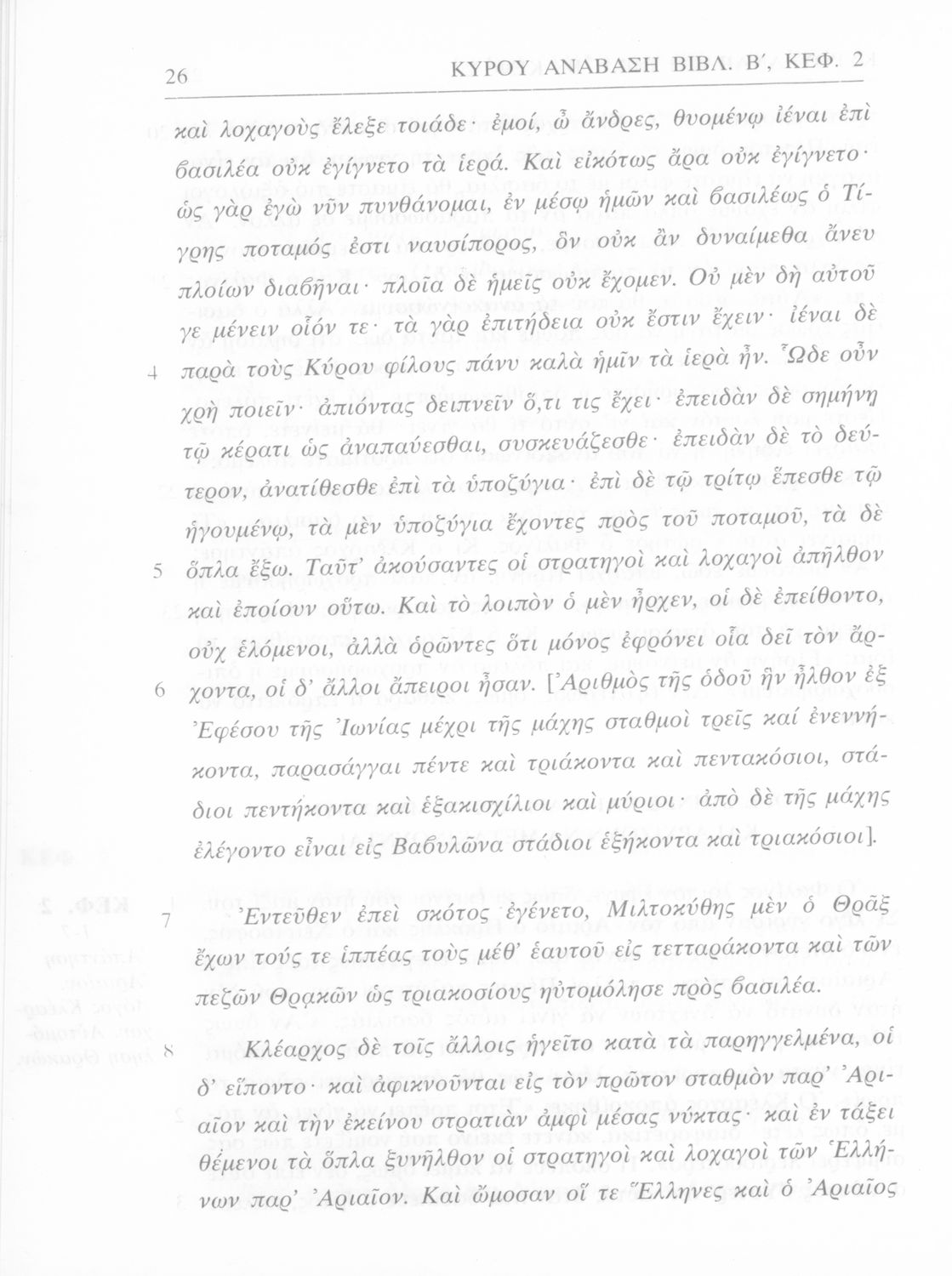 Σχολικό εγχειρίδιο Αρχαίων Ελληνικών. Από τα εφτά μέρη της "Κύρου Ανάβασις" του Ξενοφώντα που περιέχονται στο εγχειρίδιο το Πρώτο και το Έβδομο αναφέρονται περιληπτικά. Στο βιβλίο περιλαμβάνονται εισαγωγικό σημείωμα για τη ζωή και το έργο του Ξενοφώντα, σημειώσεις πάνω στα κείμενα ενώ διανθίζεται από εικόνες, χάρτες και διαγράμματα.