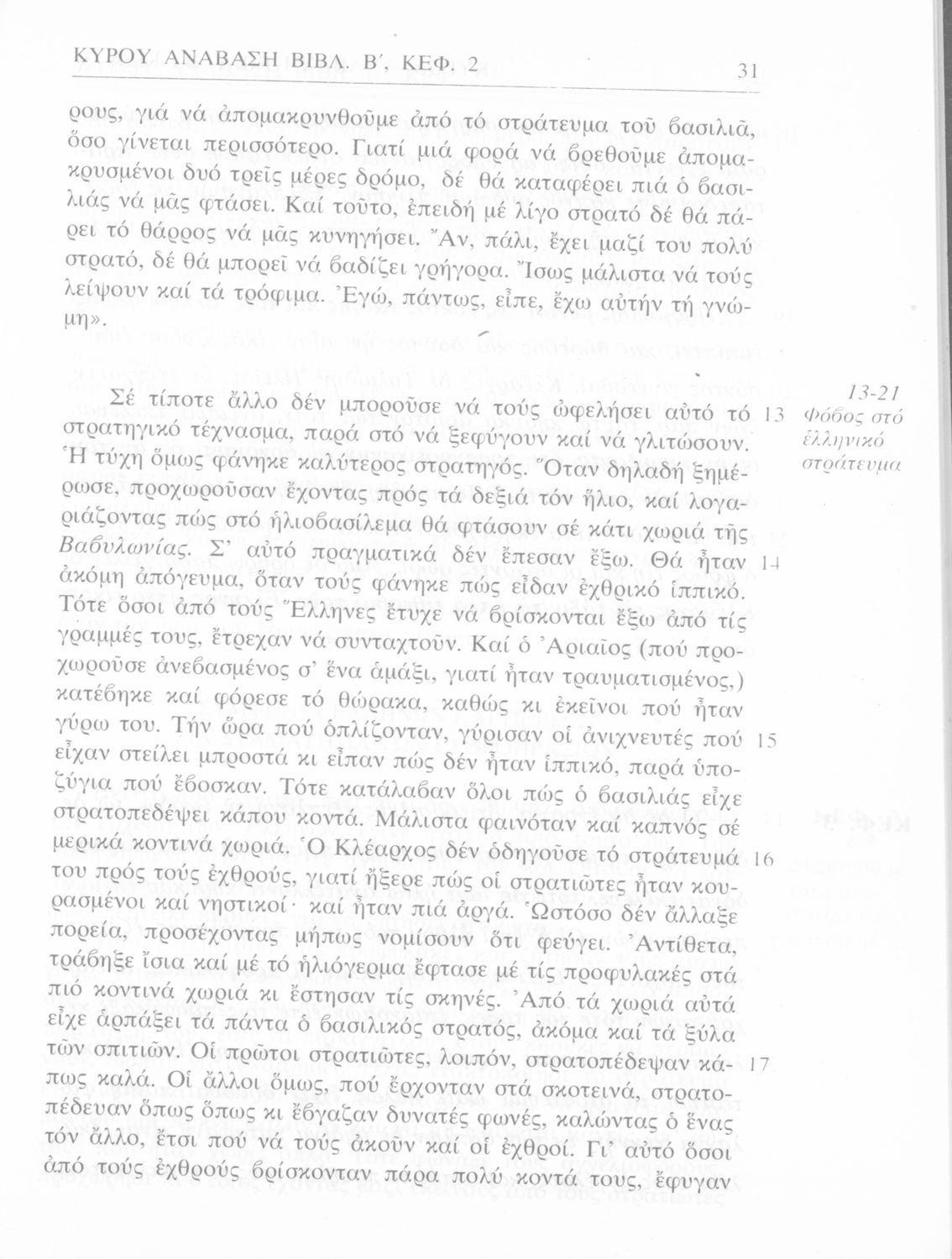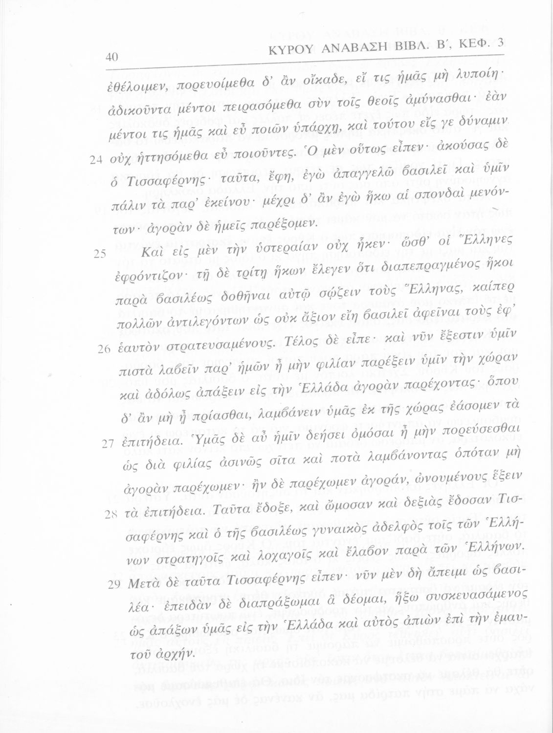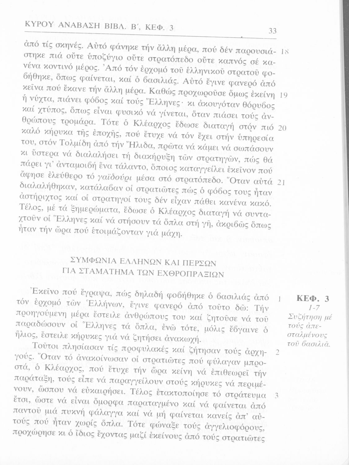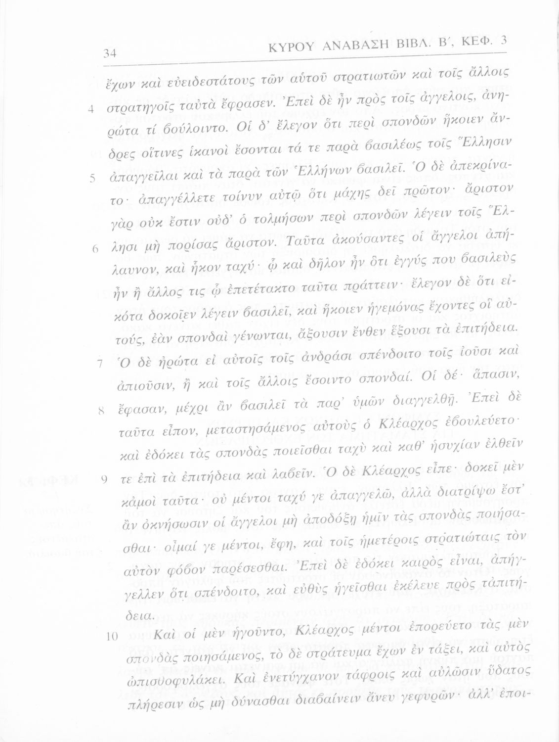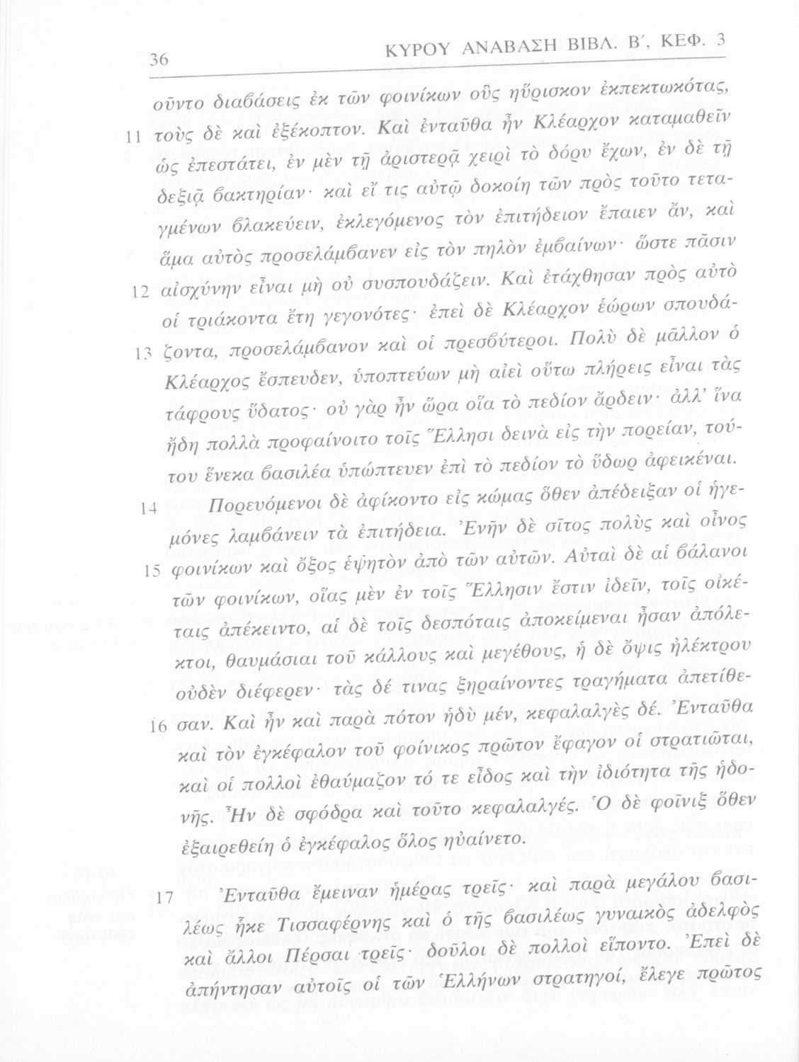 Σχολικό εγχειρίδιο Αρχαίων Ελληνικών. Από τα εφτά μέρη της "Κύρου Ανάβασις" του Ξενοφώντα που περιέχονται στο εγχειρίδιο το Πρώτο και το Έβδομο αναφέρονται περιληπτικά. Στο βιβλίο περιλαμβάνονται εισαγωγικό σημείωμα για τη ζωή και το έργο του Ξενοφώντα, σημειώσεις πάνω στα κείμενα ενώ διανθίζεται από εικόνες, χάρτες και διαγράμματα.
