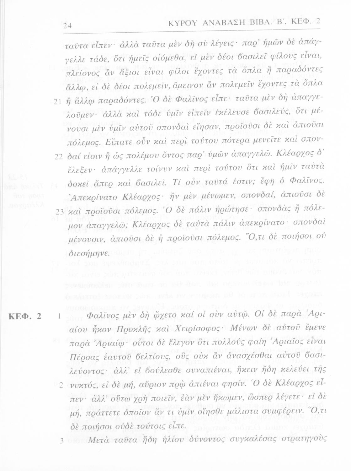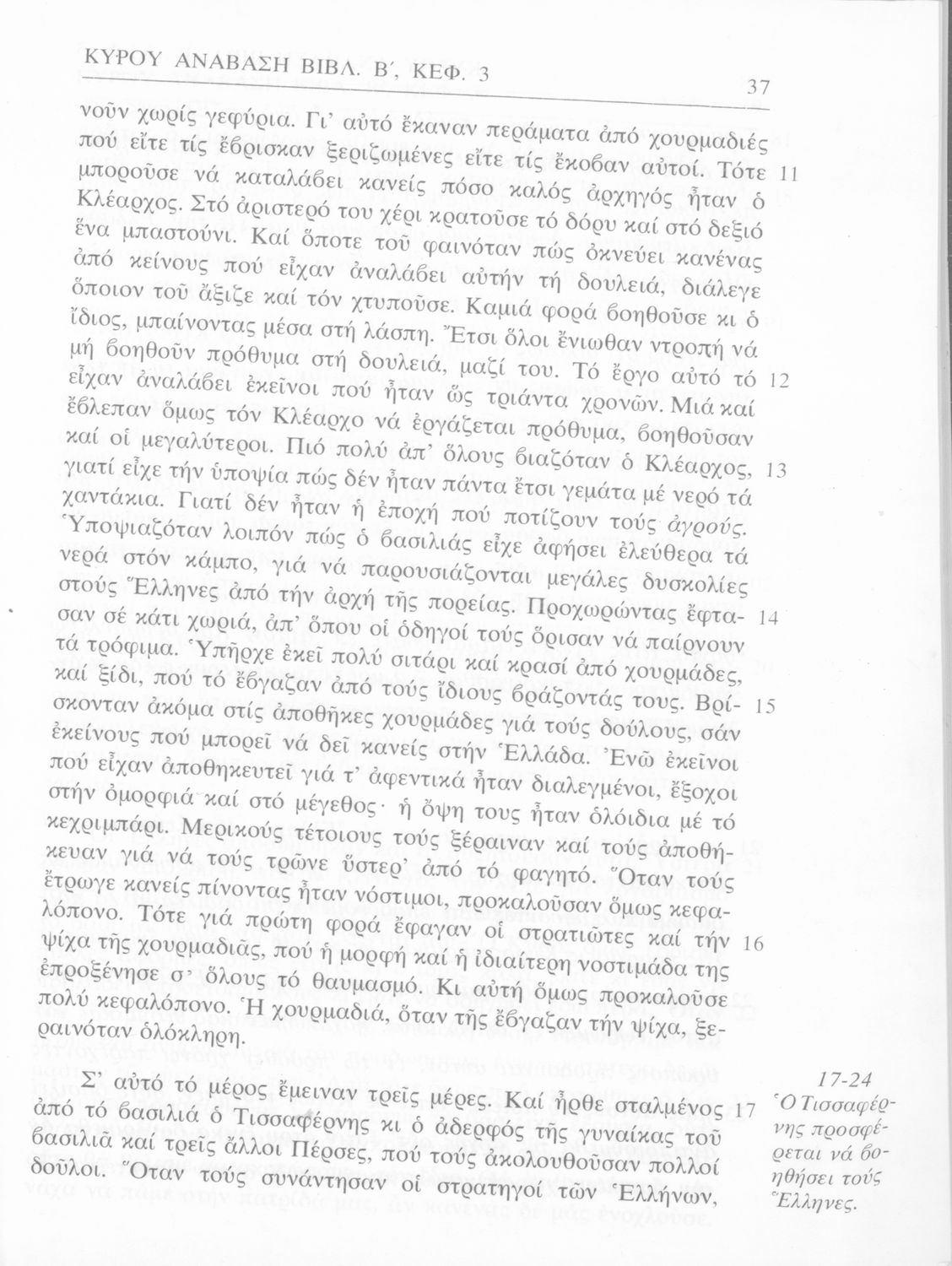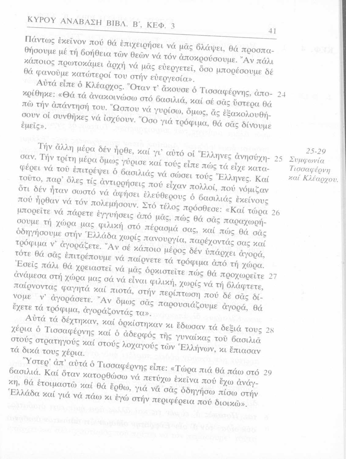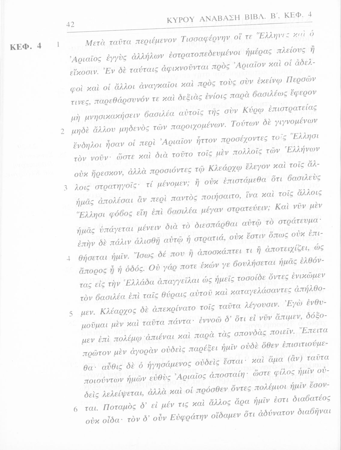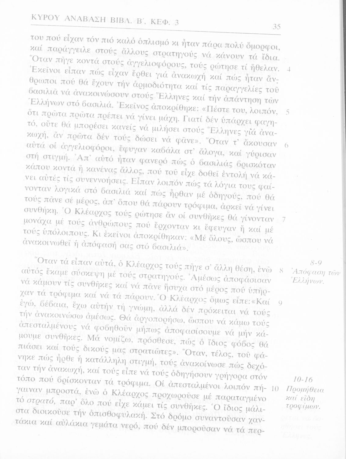 Σχολικό εγχειρίδιο Αρχαίων Ελληνικών. Από τα εφτά μέρη της "Κύρου Ανάβασις" του Ξενοφώντα που περιέχονται στο εγχειρίδιο το Πρώτο και το Έβδομο αναφέρονται περιληπτικά. Στο βιβλίο περιλαμβάνονται εισαγωγικό σημείωμα για τη ζωή και το έργο του Ξενοφώντα, σημειώσεις πάνω στα κείμενα ενώ διανθίζεται από εικόνες, χάρτες και διαγράμματα.